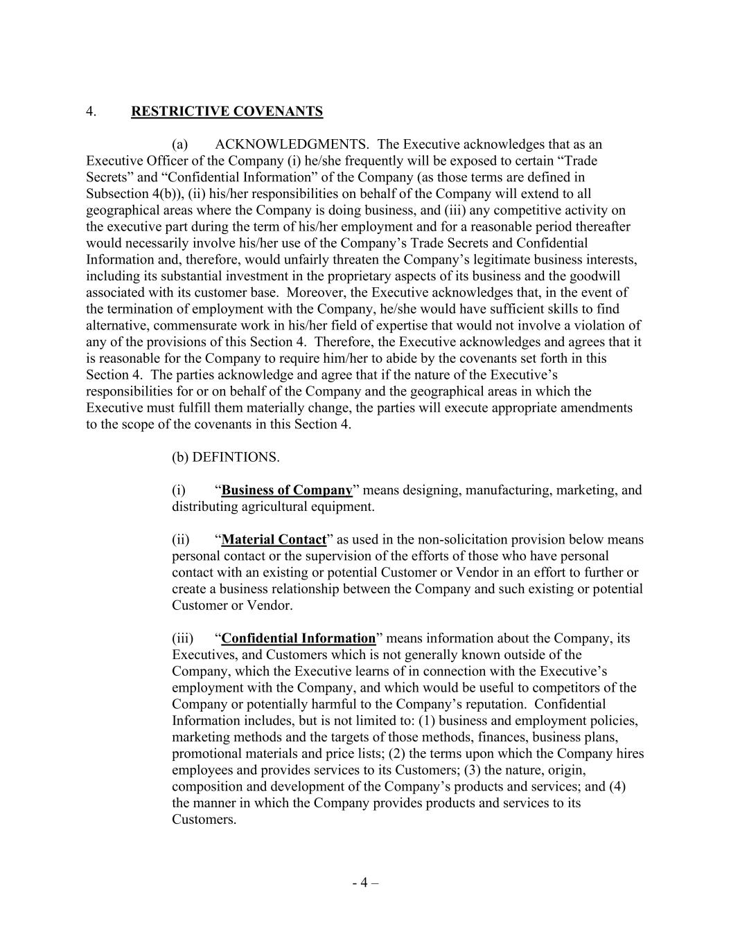 - 4 – 4. RESTRICTIVE COVENANTS (a) ACKNOWLEDGMENTS. The Executive acknowledges that as an Executive Officer of the Company (i) he/she frequently will be exposed to certain “Trade Secrets” and “Confidential Information” of the Company (as those terms are defined in Subsection 4(b)), (ii) his/her responsibilities on behalf of the Company will extend to all geographical areas where the Company is doing business, and (iii) any competitive activity on the executive part during the term of his/her employment and for a reasonable period thereafter would necessarily involve his/her use of the Company’s Trade Secrets and Confidential Information and, therefore, would unfairly threaten the Company’s legitimate business interests, including its substantial investment in the proprietary aspects of its business and the goodwill associated with its customer base. Moreover, the Executive acknowledges that, in the event of the termination of employment with the Company, he/she would have sufficient skills to find alternative, commensurate work in his/her field of expertise that would not involve a violation of any of the provisions of this Section 4. Therefore, the Executive acknowledges and agrees that it is reasonable for the Company to require him/her to abide by the covenants set forth in this Section 4. The parties acknowledge and agree that if the nature of the Executive’s responsibilities for or on behalf of the Company and the geographical areas in which the Executive must fulfill them materially change, the parties will execute appropriate amendments to the scope of the covenants in this Section 4. (b) DEFINTIONS. (i) “Business of Company” means designing, manufacturing, marketing, and distributing agricultural equipment. (ii) “Material Contact” as used in the non-solicitation provision below means personal contact or the supervision of the efforts of those who have personal contact with an existing or potential Customer or Vendor in an effort to further or create a business relationship between the Company and such existing or potential Customer or Vendor. (iii) “Confidential Information” means information about the Company, its Executives, and Customers which is not generally known outside of the Company, which the Executive learns of in connection with the Executive’s employment with the Company, and which would be useful to competitors of the Company or potentially harmful to the Company’s reputation. Confidential Information includes, but is not limited to: (1) business and employment policies, marketing methods and the targets of those methods, finances, business plans, promotional materials and price lists; (2) the terms upon which the Company hires employees and provides services to its Customers; (3) the nature, origin, composition and development of the Company’s products and services; and (4) the manner in which the Company provides products and services to its Customers.