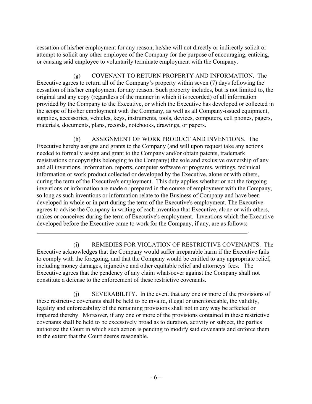- 6 – cessation of his/her employment for any reason, he/she will not directly or indirectly solicit or attempt to solicit any other employee of the Company for the purpose of encouraging, enticing, or causing said employee to voluntarily terminate employment with the Company. (g) COVENANT TO RETURN PROPERTY AND INFORMATION. The Executive agrees to return all of the Company’s property within seven (7) days following the cessation of his/her employment for any reason. Such property includes, but is not limited to, the original and any copy (regardless of the manner in which it is recorded) of all information provided by the Company to the Executive, or which the Executive has developed or collected in the scope of his/her employment with the Company, as well as all Company-issued equipment, supplies, accessories, vehicles, keys, instruments, tools, devices, computers, cell phones, pagers, materials, documents, plans, records, notebooks, drawings, or papers. (h) ASSIGNMENT OF WORK PRODUCT AND INVENTIONS. The Executive hereby assigns and grants to the Company (and will upon request take any actions needed to formally assign and grant to the Company and/or obtain patents, trademark registrations or copyrights belonging to the Company) the sole and exclusive ownership of any and all inventions, information, reports, computer software or programs, writings, technical information or work product collected or developed by the Executive, alone or with others, during the term of the Executive's employment. This duty applies whether or not the forgoing inventions or information are made or prepared in the course of employment with the Company, so long as such inventions or information relate to the Business of Company and have been developed in whole or in part during the term of the Executive's employment. The Executive agrees to advise the Company in writing of each invention that Executive, alone or with others, makes or conceives during the term of Executive's employment. Inventions which the Executive developed before the Executive came to work for the Company, if any, are as follows: _____________________________________________________________________. (i) REMEDIES FOR VIOLATION OF RESTRICTIVE COVENANTS. The Executive acknowledges that the Company would suffer irreparable harm if the Executive fails to comply with the foregoing, and that the Company would be entitled to any appropriate relief, including money damages, injunctive and other equitable relief and attorneys' fees. The Executive agrees that the pendency of any claim whatsoever against the Company shall not constitute a defense to the enforcement of these restrictive covenants. (j) SEVERABILITY. In the event that any one or more of the provisions of these restrictive covenants shall be held to be invalid, illegal or unenforceable, the validity, legality and enforceability of the remaining provisions shall not in any way be affected or impaired thereby. Moreover, if any one or more of the provisions contained in these restrictive covenants shall be held to be excessively broad as to duration, activity or subject, the parties authorize the Court in which such action is pending to modify said covenants and enforce them to the extent that the Court deems reasonable.