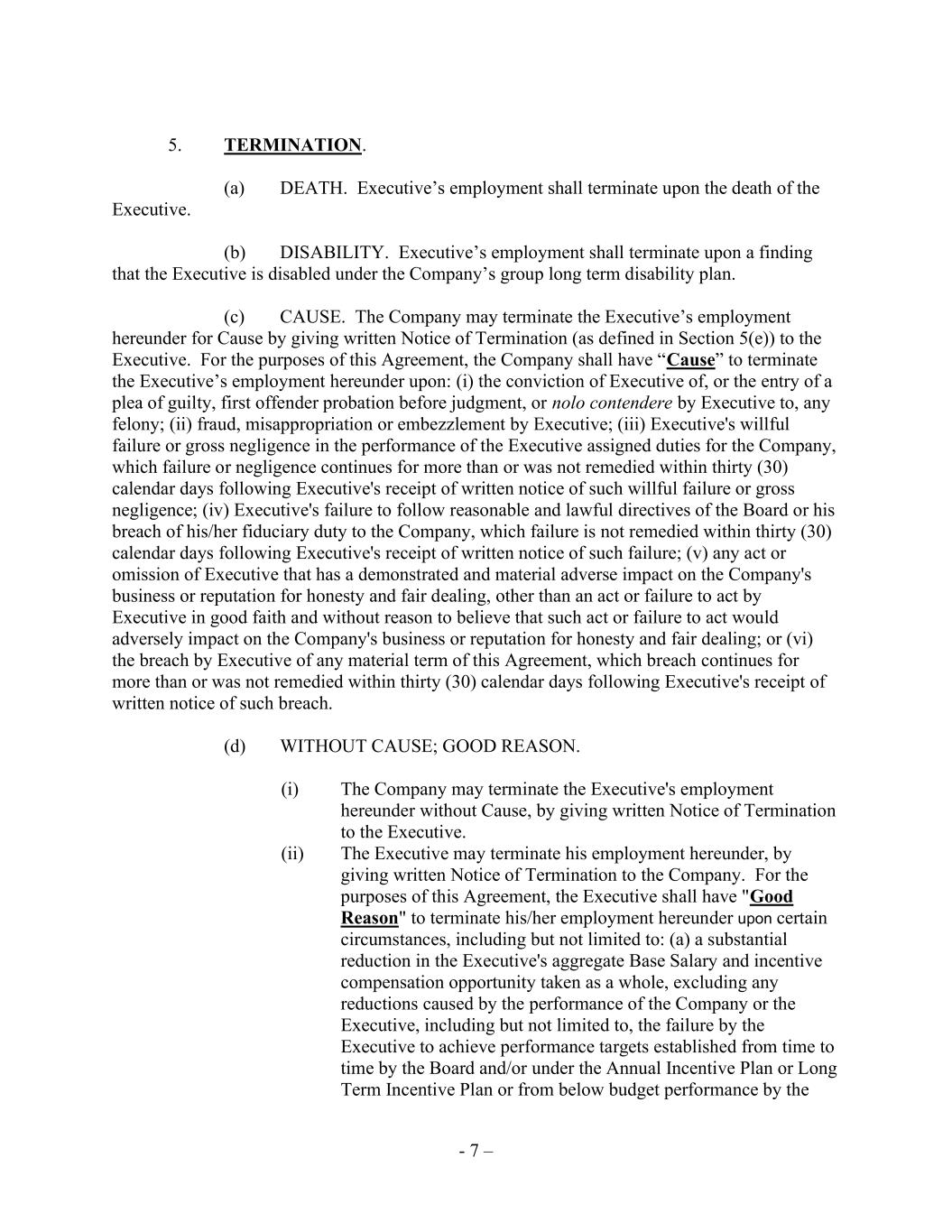 - 7 – 5. TERMINATION. (a) DEATH. Executive’s employment shall terminate upon the death of the Executive. (b) DISABILITY. Executive’s employment shall terminate upon a finding that the Executive is disabled under the Company’s group long term disability plan. (c) CAUSE. The Company may terminate the Executive’s employment hereunder for Cause by giving written Notice of Termination (as defined in Section 5(e)) to the Executive. For the purposes of this Agreement, the Company shall have “Cause” to terminate the Executive’s employment hereunder upon: (i) the conviction of Executive of, or the entry of a plea of guilty, first offender probation before judgment, or nolo contendere by Executive to, any felony; (ii) fraud, misappropriation or embezzlement by Executive; (iii) Executive's willful failure or gross negligence in the performance of the Executive assigned duties for the Company, which failure or negligence continues for more than or was not remedied within thirty (30) calendar days following Executive's receipt of written notice of such willful failure or gross negligence; (iv) Executive's failure to follow reasonable and lawful directives of the Board or his breach of his/her fiduciary duty to the Company, which failure is not remedied within thirty (30) calendar days following Executive's receipt of written notice of such failure; (v) any act or omission of Executive that has a demonstrated and material adverse impact on the Company's business or reputation for honesty and fair dealing, other than an act or failure to act by Executive in good faith and without reason to believe that such act or failure to act would adversely impact on the Company's business or reputation for honesty and fair dealing; or (vi) the breach by Executive of any material term of this Agreement, which breach continues for more than or was not remedied within thirty (30) calendar days following Executive's receipt of written notice of such breach. (d) WITHOUT CAUSE; GOOD REASON. (i) The Company may terminate the Executive's employment hereunder without Cause, by giving written Notice of Termination to the Executive. (ii) The Executive may terminate his employment hereunder, by giving written Notice of Termination to the Company. For the purposes of this Agreement, the Executive shall have "Good Reason" to terminate his/her employment hereunder upon certain circumstances, including but not limited to: (a) a substantial reduction in the Executive's aggregate Base Salary and incentive compensation opportunity taken as a whole, excluding any reductions caused by the performance of the Company or the Executive, including but not limited to, the failure by the Executive to achieve performance targets established from time to time by the Board and/or under the Annual Incentive Plan or Long Term Incentive Plan or from below budget performance by the