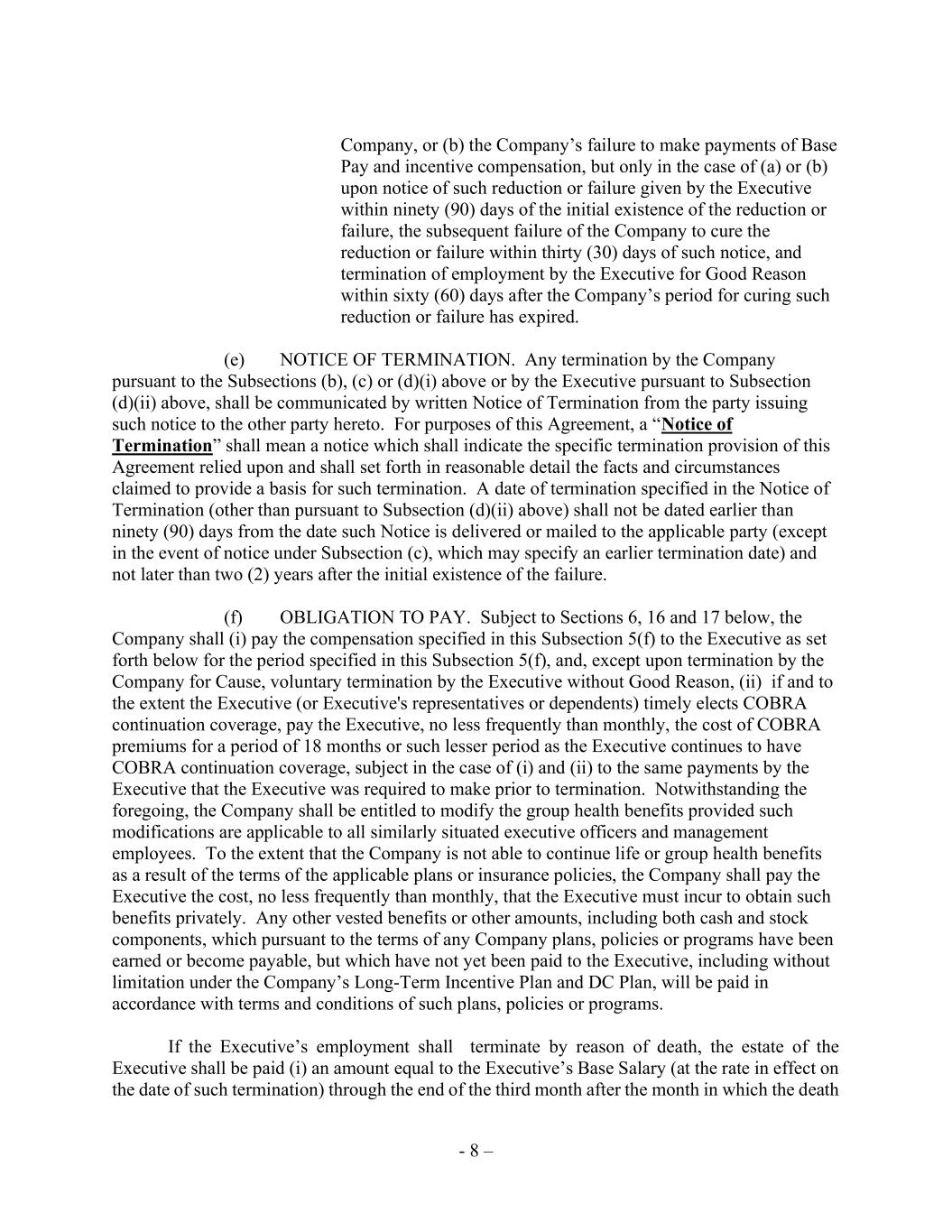 - 8 – Company, or (b) the Company’s failure to make payments of Base Pay and incentive compensation, but only in the case of (a) or (b) upon notice of such reduction or failure given by the Executive within ninety (90) days of the initial existence of the reduction or failure, the subsequent failure of the Company to cure the reduction or failure within thirty (30) days of such notice, and termination of employment by the Executive for Good Reason within sixty (60) days after the Company’s period for curing such reduction or failure has expired. (e) NOTICE OF TERMINATION. Any termination by the Company pursuant to the Subsections (b), (c) or (d)(i) above or by the Executive pursuant to Subsection (d)(ii) above, shall be communicated by written Notice of Termination from the party issuing such notice to the other party hereto. For purposes of this Agreement, a “Notice of Termination” shall mean a notice which shall indicate the specific termination provision of this Agreement relied upon and shall set forth in reasonable detail the facts and circumstances claimed to provide a basis for such termination. A date of termination specified in the Notice of Termination (other than pursuant to Subsection (d)(ii) above) shall not be dated earlier than ninety (90) days from the date such Notice is delivered or mailed to the applicable party (except in the event of notice under Subsection (c), which may specify an earlier termination date) and not later than two (2) years after the initial existence of the failure. (f) OBLIGATION TO PAY. Subject to Sections 6, 16 and 17 below, the Company shall (i) pay the compensation specified in this Subsection 5(f) to the Executive as set forth below for the period specified in this Subsection 5(f), and, except upon termination by the Company for Cause, voluntary termination by the Executive without Good Reason, (ii) if and to the extent the Executive (or Executive's representatives or dependents) timely elects COBRA continuation coverage, pay the Executive, no less frequently than monthly, the cost of COBRA premiums for a period of 18 months or such lesser period as the Executive continues to have COBRA continuation coverage, subject in the case of (i) and (ii) to the same payments by the Executive that the Executive was required to make prior to termination. Notwithstanding the foregoing, the Company shall be entitled to modify the group health benefits provided such modifications are applicable to all similarly situated executive officers and management employees. To the extent that the Company is not able to continue life or group health benefits as a result of the terms of the applicable plans or insurance policies, the Company shall pay the Executive the cost, no less frequently than monthly, that the Executive must incur to obtain such benefits privately. Any other vested benefits or other amounts, including both cash and stock components, which pursuant to the terms of any Company plans, policies or programs have been earned or become payable, but which have not yet been paid to the Executive, including without limitation under the Company’s Long-Term Incentive Plan and DC Plan, will be paid in accordance with terms and conditions of such plans, policies or programs. If the Executive’s employment shall terminate by reason of death, the estate of the Executive shall be paid (i) an amount equal to the Executive’s Base Salary (at the rate in effect on the date of such termination) through the end of the third month after the month in which the death
