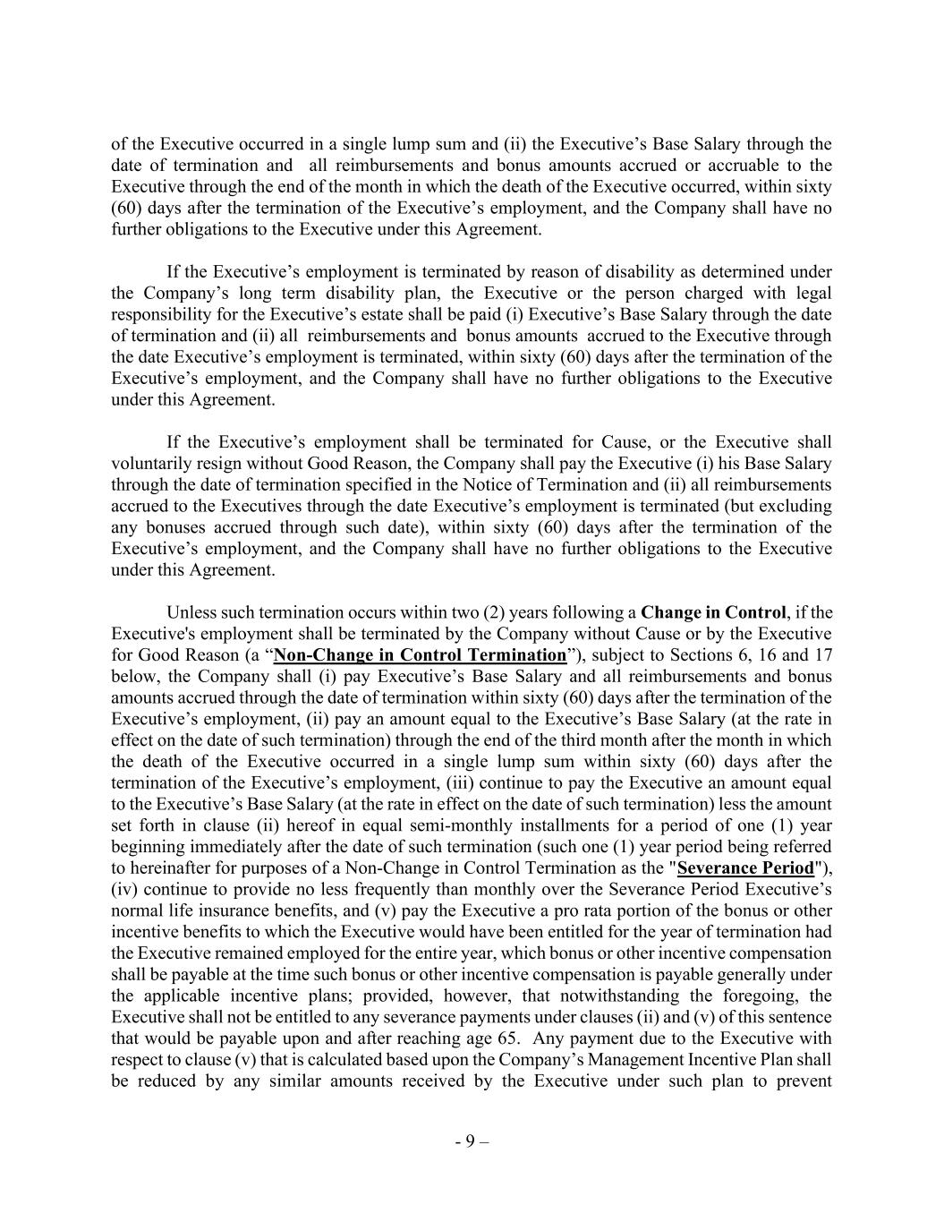 - 9 – of the Executive occurred in a single lump sum and (ii) the Executive’s Base Salary through the date of termination and all reimbursements and bonus amounts accrued or accruable to the Executive through the end of the month in which the death of the Executive occurred, within sixty (60) days after the termination of the Executive’s employment, and the Company shall have no further obligations to the Executive under this Agreement. If the Executive’s employment is terminated by reason of disability as determined under the Company’s long term disability plan, the Executive or the person charged with legal responsibility for the Executive’s estate shall be paid (i) Executive’s Base Salary through the date of termination and (ii) all reimbursements and bonus amounts accrued to the Executive through the date Executive’s employment is terminated, within sixty (60) days after the termination of the Executive’s employment, and the Company shall have no further obligations to the Executive under this Agreement. If the Executive’s employment shall be terminated for Cause, or the Executive shall voluntarily resign without Good Reason, the Company shall pay the Executive (i) his Base Salary through the date of termination specified in the Notice of Termination and (ii) all reimbursements accrued to the Executives through the date Executive’s employment is terminated (but excluding any bonuses accrued through such date), within sixty (60) days after the termination of the Executive’s employment, and the Company shall have no further obligations to the Executive under this Agreement. Unless such termination occurs within two (2) years following a Change in Control, if the Executive's employment shall be terminated by the Company without Cause or by the Executive for Good Reason (a “Non-Change in Control Termination”), subject to Sections 6, 16 and 17 below, the Company shall (i) pay Executive’s Base Salary and all reimbursements and bonus amounts accrued through the date of termination within sixty (60) days after the termination of the Executive’s employment, (ii) pay an amount equal to the Executive’s Base Salary (at the rate in effect on the date of such termination) through the end of the third month after the month in which the death of the Executive occurred in a single lump sum within sixty (60) days after the termination of the Executive’s employment, (iii) continue to pay the Executive an amount equal to the Executive’s Base Salary (at the rate in effect on the date of such termination) less the amount set forth in clause (ii) hereof in equal semi-monthly installments for a period of one (1) year beginning immediately after the date of such termination (such one (1) year period being referred to hereinafter for purposes of a Non-Change in Control Termination as the "Severance Period"), (iv) continue to provide no less frequently than monthly over the Severance Period Executive’s normal life insurance benefits, and (v) pay the Executive a pro rata portion of the bonus or other incentive benefits to which the Executive would have been entitled for the year of termination had the Executive remained employed for the entire year, which bonus or other incentive compensation shall be payable at the time such bonus or other incentive compensation is payable generally under the applicable incentive plans; provided, however, that notwithstanding the foregoing, the Executive shall not be entitled to any severance payments under clauses (ii) and (v) of this sentence that would be payable upon and after reaching age 65. Any payment due to the Executive with respect to clause (v) that is calculated based upon the Company’s Management Incentive Plan shall be reduced by any similar amounts received by the Executive under such plan to prevent