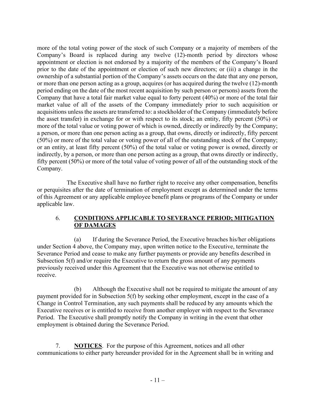 - 11 – more of the total voting power of the stock of such Company or a majority of members of the Company’s Board is replaced during any twelve (12)-month period by directors whose appointment or election is not endorsed by a majority of the members of the Company’s Board prior to the date of the appointment or election of such new directors; or (iii) a change in the ownership of a substantial portion of the Company’s assets occurs on the date that any one person, or more than one person acting as a group, acquires (or has acquired during the twelve (12)-month period ending on the date of the most recent acquisition by such person or persons) assets from the Company that have a total fair market value equal to forty percent (40%) or more of the total fair market value of all of the assets of the Company immediately prior to such acquisition or acquisitions unless the assets are transferred to: a stockholder of the Company (immediately before the asset transfer) in exchange for or with respect to its stock; an entity, fifty percent (50%) or more of the total value or voting power of which is owned, directly or indirectly by the Company; a person, or more than one person acting as a group, that owns, directly or indirectly, fifty percent (50%) or more of the total value or voting power of all of the outstanding stock of the Company; or an entity, at least fifty percent (50%) of the total value or voting power is owned, directly or indirectly, by a person, or more than one person acting as a group, that owns directly or indirectly, fifty percent (50%) or more of the total value of voting power of all of the outstanding stock of the Company. The Executive shall have no further right to receive any other compensation, benefits or perquisites after the date of termination of employment except as determined under the terms of this Agreement or any applicable employee benefit plans or programs of the Company or under applicable law. 6. CONDITIONS APPLICABLE TO SEVERANCE PERIOD; MITIGATION OF DAMAGES (a) If during the Severance Period, the Executive breaches his/her obligations under Section 4 above, the Company may, upon written notice to the Executive, terminate the Severance Period and cease to make any further payments or provide any benefits described in Subsection 5(f) and/or require the Executive to return the gross amount of any payments previously received under this Agreement that the Executive was not otherwise entitled to receive. (b) Although the Executive shall not be required to mitigate the amount of any payment provided for in Subsection 5(f) by seeking other employment, except in the case of a Change in Control Termination, any such payments shall be reduced by any amounts which the Executive receives or is entitled to receive from another employer with respect to the Severance Period. The Executive shall promptly notify the Company in writing in the event that other employment is obtained during the Severance Period. 7. NOTICES. For the purpose of this Agreement, notices and all other communications to either party hereunder provided for in the Agreement shall be in writing and