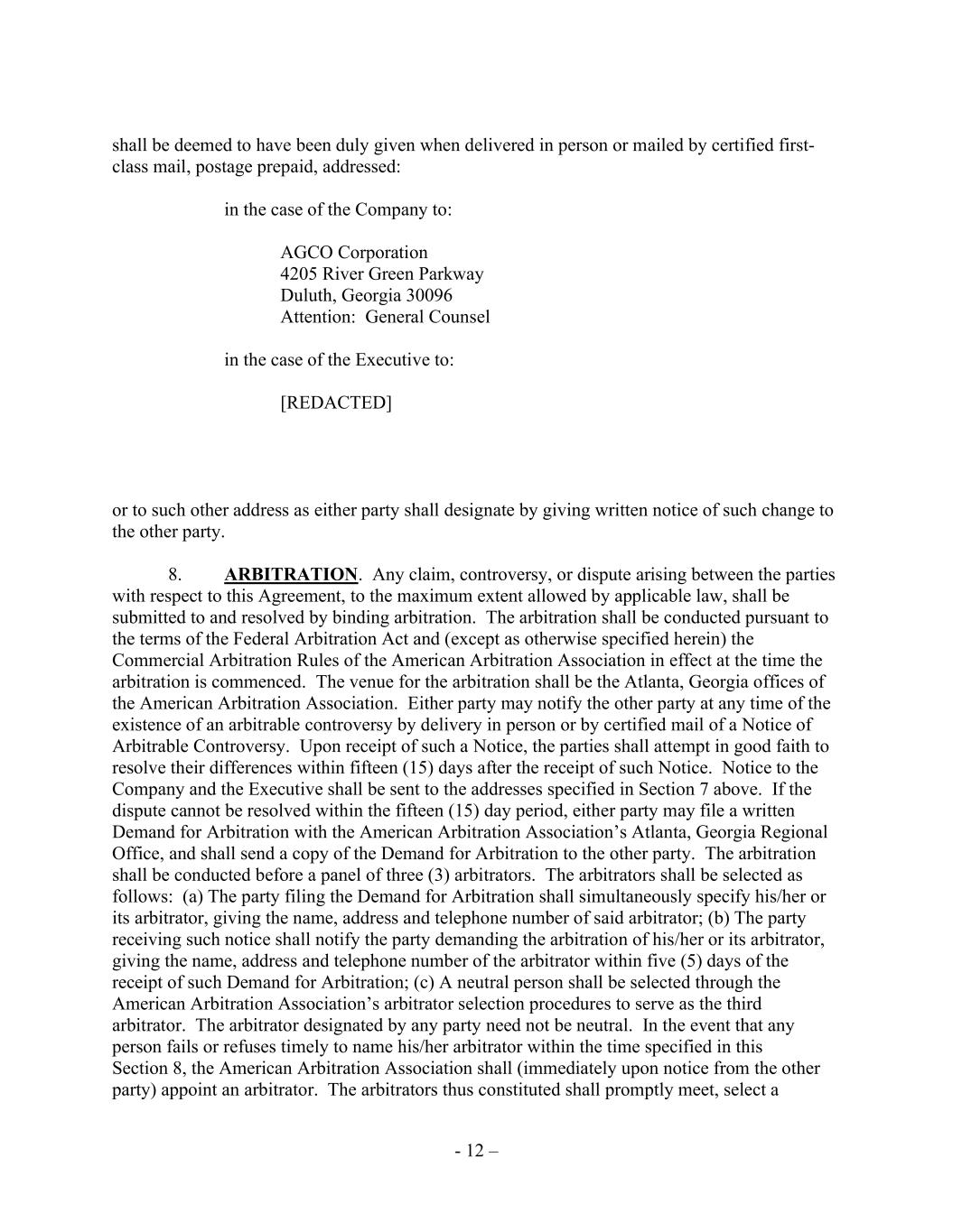 - 12 – shall be deemed to have been duly given when delivered in person or mailed by certified first- class mail, postage prepaid, addressed: in the case of the Company to: AGCO Corporation 4205 River Green Parkway Duluth, Georgia 30096 Attention: General Counsel in the case of the Executive to: [REDACTED] or to such other address as either party shall designate by giving written notice of such change to the other party. 8. ARBITRATION. Any claim, controversy, or dispute arising between the parties with respect to this Agreement, to the maximum extent allowed by applicable law, shall be submitted to and resolved by binding arbitration. The arbitration shall be conducted pursuant to the terms of the Federal Arbitration Act and (except as otherwise specified herein) the Commercial Arbitration Rules of the American Arbitration Association in effect at the time the arbitration is commenced. The venue for the arbitration shall be the Atlanta, Georgia offices of the American Arbitration Association. Either party may notify the other party at any time of the existence of an arbitrable controversy by delivery in person or by certified mail of a Notice of Arbitrable Controversy. Upon receipt of such a Notice, the parties shall attempt in good faith to resolve their differences within fifteen (15) days after the receipt of such Notice. Notice to the Company and the Executive shall be sent to the addresses specified in Section 7 above. If the dispute cannot be resolved within the fifteen (15) day period, either party may file a written Demand for Arbitration with the American Arbitration Association’s Atlanta, Georgia Regional Office, and shall send a copy of the Demand for Arbitration to the other party. The arbitration shall be conducted before a panel of three (3) arbitrators. The arbitrators shall be selected as follows: (a) The party filing the Demand for Arbitration shall simultaneously specify his/her or its arbitrator, giving the name, address and telephone number of said arbitrator; (b) The party receiving such notice shall notify the party demanding the arbitration of his/her or its arbitrator, giving the name, address and telephone number of the arbitrator within five (5) days of the receipt of such Demand for Arbitration; (c) A neutral person shall be selected through the American Arbitration Association’s arbitrator selection procedures to serve as the third arbitrator. The arbitrator designated by any party need not be neutral. In the event that any person fails or refuses timely to name his/her arbitrator within the time specified in this Section 8, the American Arbitration Association shall (immediately upon notice from the other party) appoint an arbitrator. The arbitrators thus constituted shall promptly meet, select a