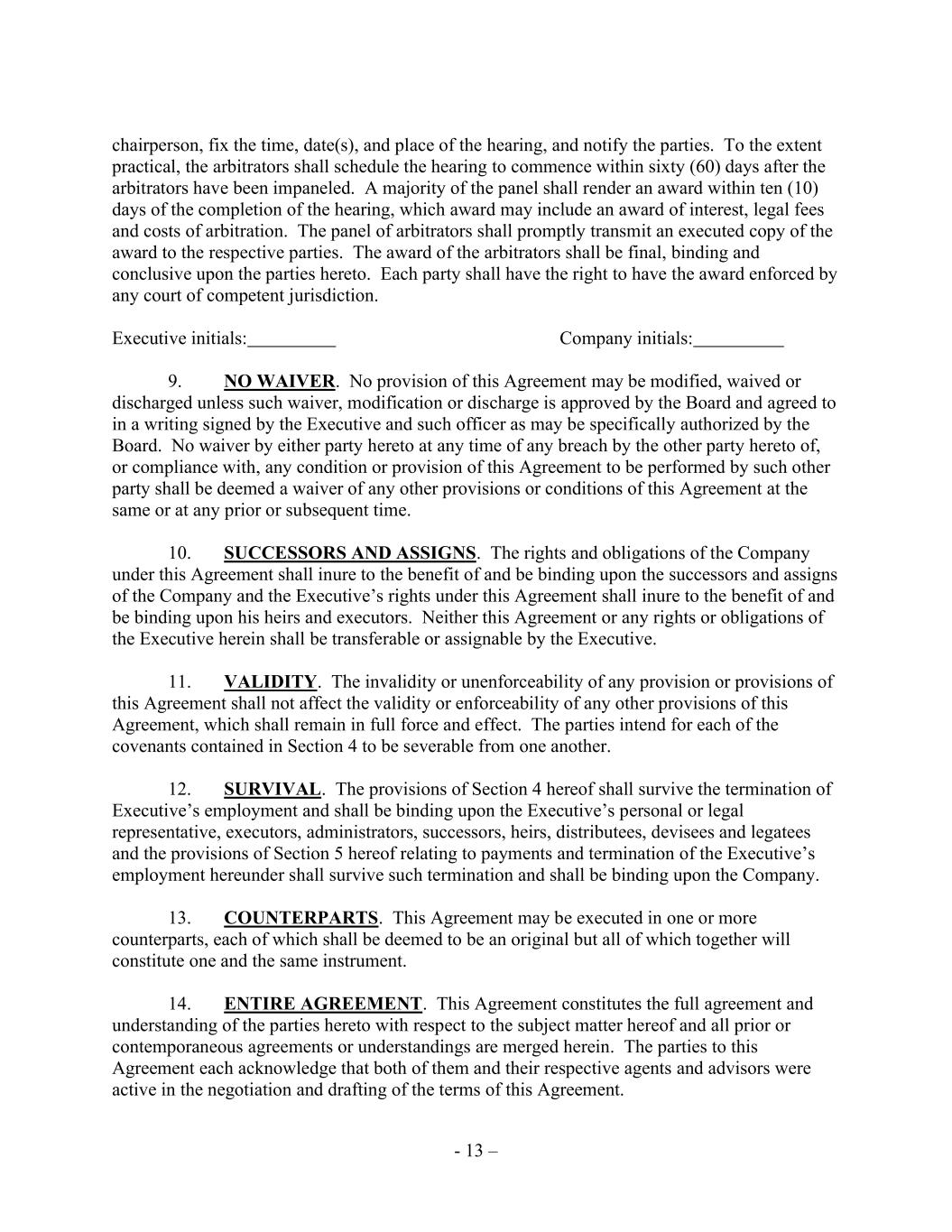- 13 – chairperson, fix the time, date(s), and place of the hearing, and notify the parties. To the extent practical, the arbitrators shall schedule the hearing to commence within sixty (60) days after the arbitrators have been impaneled. A majority of the panel shall render an award within ten (10) days of the completion of the hearing, which award may include an award of interest, legal fees and costs of arbitration. The panel of arbitrators shall promptly transmit an executed copy of the award to the respective parties. The award of the arbitrators shall be final, binding and conclusive upon the parties hereto. Each party shall have the right to have the award enforced by any court of competent jurisdiction. Executive initials: Company initials: 9. NO WAIVER. No provision of this Agreement may be modified, waived or discharged unless such waiver, modification or discharge is approved by the Board and agreed to in a writing signed by the Executive and such officer as may be specifically authorized by the Board. No waiver by either party hereto at any time of any breach by the other party hereto of, or compliance with, any condition or provision of this Agreement to be performed by such other party shall be deemed a waiver of any other provisions or conditions of this Agreement at the same or at any prior or subsequent time. 10. SUCCESSORS AND ASSIGNS. The rights and obligations of the Company under this Agreement shall inure to the benefit of and be binding upon the successors and assigns of the Company and the Executive’s rights under this Agreement shall inure to the benefit of and be binding upon his heirs and executors. Neither this Agreement or any rights or obligations of the Executive herein shall be transferable or assignable by the Executive. 11. VALIDITY. The invalidity or unenforceability of any provision or provisions of this Agreement shall not affect the validity or enforceability of any other provisions of this Agreement, which shall remain in full force and effect. The parties intend for each of the covenants contained in Section 4 to be severable from one another. 12. SURVIVAL. The provisions of Section 4 hereof shall survive the termination of Executive’s employment and shall be binding upon the Executive’s personal or legal representative, executors, administrators, successors, heirs, distributees, devisees and legatees and the provisions of Section 5 hereof relating to payments and termination of the Executive’s employment hereunder shall survive such termination and shall be binding upon the Company. 13. COUNTERPARTS. This Agreement may be executed in one or more counterparts, each of which shall be deemed to be an original but all of which together will constitute one and the same instrument. 14. ENTIRE AGREEMENT. This Agreement constitutes the full agreement and understanding of the parties hereto with respect to the subject matter hereof and all prior or contemporaneous agreements or understandings are merged herein. The parties to this Agreement each acknowledge that both of them and their respective agents and advisors were active in the negotiation and drafting of the terms of this Agreement.