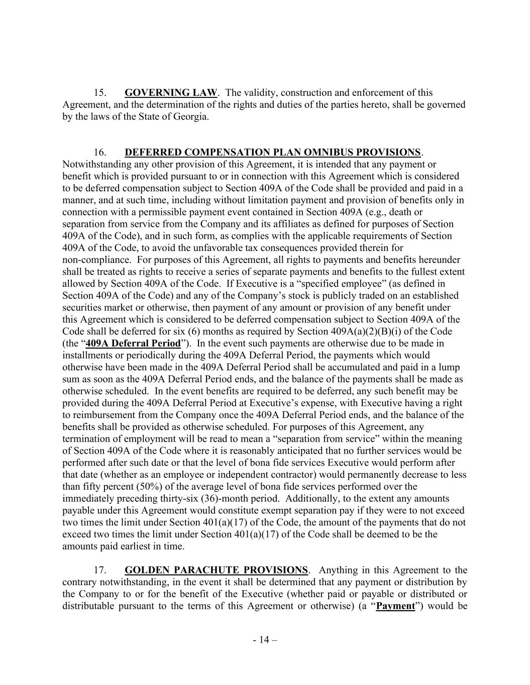 - 14 – 15. GOVERNING LAW. The validity, construction and enforcement of this Agreement, and the determination of the rights and duties of the parties hereto, shall be governed by the laws of the State of Georgia. 16. DEFERRED COMPENSATION PLAN OMNIBUS PROVISIONS. Notwithstanding any other provision of this Agreement, it is intended that any payment or benefit which is provided pursuant to or in connection with this Agreement which is considered to be deferred compensation subject to Section 409A of the Code shall be provided and paid in a manner, and at such time, including without limitation payment and provision of benefits only in connection with a permissible payment event contained in Section 409A (e.g., death or separation from service from the Company and its affiliates as defined for purposes of Section 409A of the Code), and in such form, as complies with the applicable requirements of Section 409A of the Code, to avoid the unfavorable tax consequences provided therein for non-compliance. For purposes of this Agreement, all rights to payments and benefits hereunder shall be treated as rights to receive a series of separate payments and benefits to the fullest extent allowed by Section 409A of the Code. If Executive is a “specified employee” (as defined in Section 409A of the Code) and any of the Company’s stock is publicly traded on an established securities market or otherwise, then payment of any amount or provision of any benefit under this Agreement which is considered to be deferred compensation subject to Section 409A of the Code shall be deferred for six (6) months as required by Section 409A(a)(2)(B)(i) of the Code (the “409A Deferral Period”). In the event such payments are otherwise due to be made in installments or periodically during the 409A Deferral Period, the payments which would otherwise have been made in the 409A Deferral Period shall be accumulated and paid in a lump sum as soon as the 409A Deferral Period ends, and the balance of the payments shall be made as otherwise scheduled. In the event benefits are required to be deferred, any such benefit may be provided during the 409A Deferral Period at Executive’s expense, with Executive having a right to reimbursement from the Company once the 409A Deferral Period ends, and the balance of the benefits shall be provided as otherwise scheduled. For purposes of this Agreement, any termination of employment will be read to mean a “separation from service” within the meaning of Section 409A of the Code where it is reasonably anticipated that no further services would be performed after such date or that the level of bona fide services Executive would perform after that date (whether as an employee or independent contractor) would permanently decrease to less than fifty percent (50%) of the average level of bona fide services performed over the immediately preceding thirty-six (36)-month period. Additionally, to the extent any amounts payable under this Agreement would constitute exempt separation pay if they were to not exceed two times the limit under Section 401(a)(17) of the Code, the amount of the payments that do not exceed two times the limit under Section 401(a)(17) of the Code shall be deemed to be the amounts paid earliest in time. 17. GOLDEN PARACHUTE PROVISIONS. Anything in this Agreement to the contrary notwithstanding, in the event it shall be determined that any payment or distribution by the Company to or for the benefit of the Executive (whether paid or payable or distributed or distributable pursuant to the terms of this Agreement or otherwise) (a “Payment”) would be