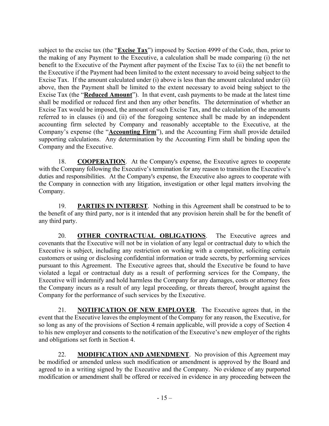 - 15 – subject to the excise tax (the “Excise Tax”) imposed by Section 4999 of the Code, then, prior to the making of any Payment to the Executive, a calculation shall be made comparing (i) the net benefit to the Executive of the Payment after payment of the Excise Tax to (ii) the net benefit to the Executive if the Payment had been limited to the extent necessary to avoid being subject to the Excise Tax. If the amount calculated under (i) above is less than the amount calculated under (ii) above, then the Payment shall be limited to the extent necessary to avoid being subject to the Excise Tax (the “Reduced Amount”). In that event, cash payments to be made at the latest time shall be modified or reduced first and then any other benefits. The determination of whether an Excise Tax would be imposed, the amount of such Excise Tax, and the calculation of the amounts referred to in clauses (i) and (ii) of the foregoing sentence shall be made by an independent accounting firm selected by Company and reasonably acceptable to the Executive, at the Company’s expense (the “Accounting Firm”), and the Accounting Firm shall provide detailed supporting calculations. Any determination by the Accounting Firm shall be binding upon the Company and the Executive. 18. COOPERATION. At the Company's expense, the Executive agrees to cooperate with the Company following the Executive’s termination for any reason to transition the Executive’s duties and responsibilities. At the Company's expense, the Executive also agrees to cooperate with the Company in connection with any litigation, investigation or other legal matters involving the Company. 19. PARTIES IN INTEREST. Nothing in this Agreement shall be construed to be to the benefit of any third party, nor is it intended that any provision herein shall be for the benefit of any third party. 20. OTHER CONTRACTUAL OBLIGATIONS. The Executive agrees and covenants that the Executive will not be in violation of any legal or contractual duty to which the Executive is subject, including any restriction on working with a competitor, soliciting certain customers or using or disclosing confidential information or trade secrets, by performing services pursuant to this Agreement. The Executive agrees that, should the Executive be found to have violated a legal or contractual duty as a result of performing services for the Company, the Executive will indemnify and hold harmless the Company for any damages, costs or attorney fees the Company incurs as a result of any legal proceeding, or threats thereof, brought against the Company for the performance of such services by the Executive. 21. NOTIFICATION OF NEW EMPLOYER. The Executive agrees that, in the event that the Executive leaves the employment of the Company for any reason, the Executive, for so long as any of the provisions of Section 4 remain applicable, will provide a copy of Section 4 to his new employer and consents to the notification of the Executive’s new employer of the rights and obligations set forth in Section 4. 22. MODIFICATION AND AMENDMENT. No provision of this Agreement may be modified or amended unless such modification or amendment is approved by the Board and agreed to in a writing signed by the Executive and the Company. No evidence of any purported modification or amendment shall be offered or received in evidence in any proceeding between the