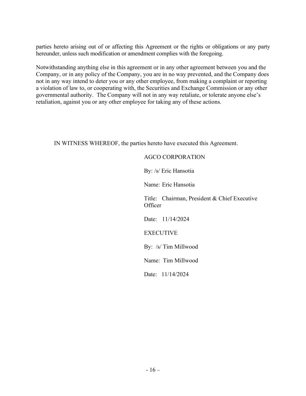 - 16 – parties hereto arising out of or affecting this Agreement or the rights or obligations or any party hereunder, unless such modification or amendment complies with the foregoing. Notwithstanding anything else in this agreement or in any other agreement between you and the Company, or in any policy of the Company, you are in no way prevented, and the Company does not in any way intend to deter you or any other employee, from making a complaint or reporting a violation of law to, or cooperating with, the Securities and Exchange Commission or any other governmental authority. The Company will not in any way retaliate, or tolerate anyone else’s retaliation, against you or any other employee for taking any of these actions. IN WITNESS WHEREOF, the parties hereto have executed this Agreement. AGCO CORPORATION By: /s/ Eric Hansotia Name: Eric Hansotia Title: Chairman, President & Chief Executive Officer Date: 11/14/2024 EXECUTIVE By: /s/ Tim Millwood Name: Tim Millwood Date: 11/14/2024