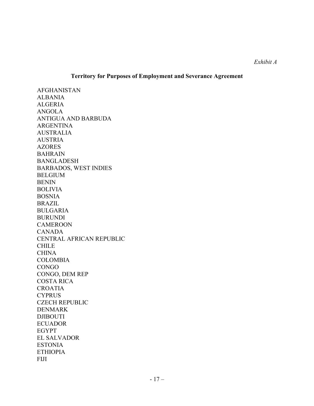 - 17 – Exhibit A Territory for Purposes of Employment and Severance Agreement AFGHANISTAN ALBANIA ALGERIA ANGOLA ANTIGUA AND BARBUDA ARGENTINA AUSTRALIA AUSTRIA AZORES BAHRAIN BANGLADESH BARBADOS, WEST INDIES BELGIUM BENIN BOLIVIA BOSNIA BRAZIL BULGARIA BURUNDI CAMEROON CANADA CENTRAL AFRICAN REPUBLIC CHILE CHINA COLOMBIA CONGO CONGO, DEM REP COSTA RICA CROATIA CYPRUS CZECH REPUBLIC DENMARK DJIBOUTI ECUADOR EGYPT EL SALVADOR ESTONIA ETHIOPIA FIJI