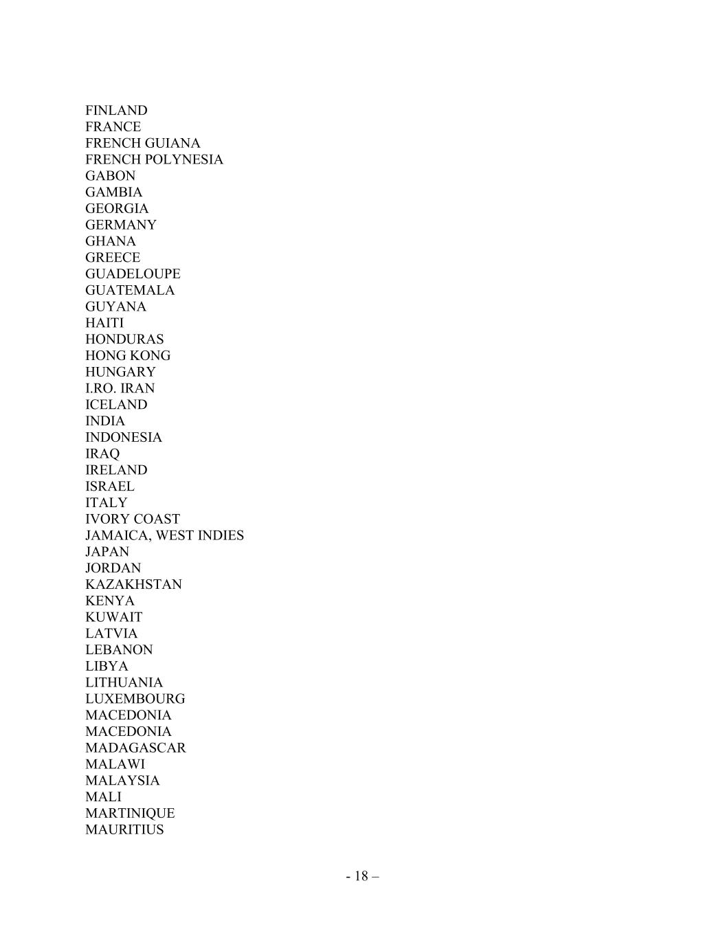 - 18 – FINLAND FRANCE FRENCH GUIANA FRENCH POLYNESIA GABON GAMBIA GEORGIA GERMANY GHANA GREECE GUADELOUPE GUATEMALA GUYANA HAITI HONDURAS HONG KONG HUNGARY I.RO. IRAN ICELAND INDIA INDONESIA IRAQ IRELAND ISRAEL ITALY IVORY COAST JAMAICA, WEST INDIES JAPAN JORDAN KAZAKHSTAN KENYA KUWAIT LATVIA LEBANON LIBYA LITHUANIA LUXEMBOURG MACEDONIA MACEDONIA MADAGASCAR MALAWI MALAYSIA MALI MARTINIQUE MAURITIUS