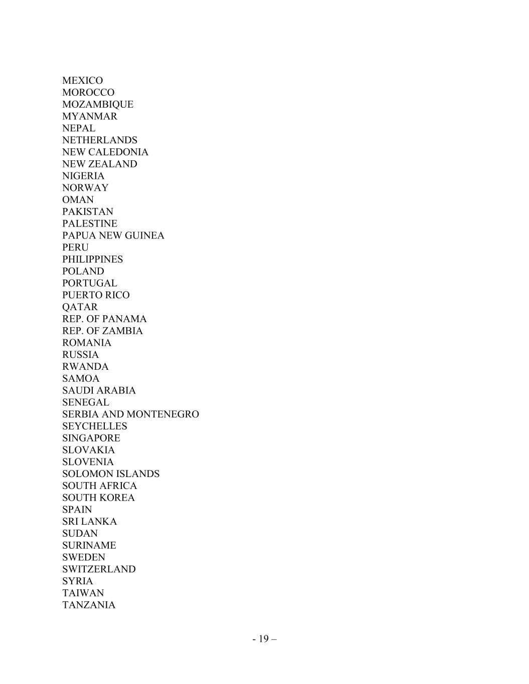 - 19 – MEXICO MOROCCO MOZAMBIQUE MYANMAR NEPAL NETHERLANDS NEW CALEDONIA NEW ZEALAND NIGERIA NORWAY OMAN PAKISTAN PALESTINE PAPUA NEW GUINEA PERU PHILIPPINES POLAND PORTUGAL PUERTO RICO QATAR REP. OF PANAMA REP. OF ZAMBIA ROMANIA RUSSIA RWANDA SAMOA SAUDI ARABIA SENEGAL SERBIA AND MONTENEGRO SEYCHELLES SINGAPORE SLOVAKIA SLOVENIA SOLOMON ISLANDS SOUTH AFRICA SOUTH KOREA SPAIN SRI LANKA SUDAN SURINAME SWEDEN SWITZERLAND SYRIA TAIWAN TANZANIA