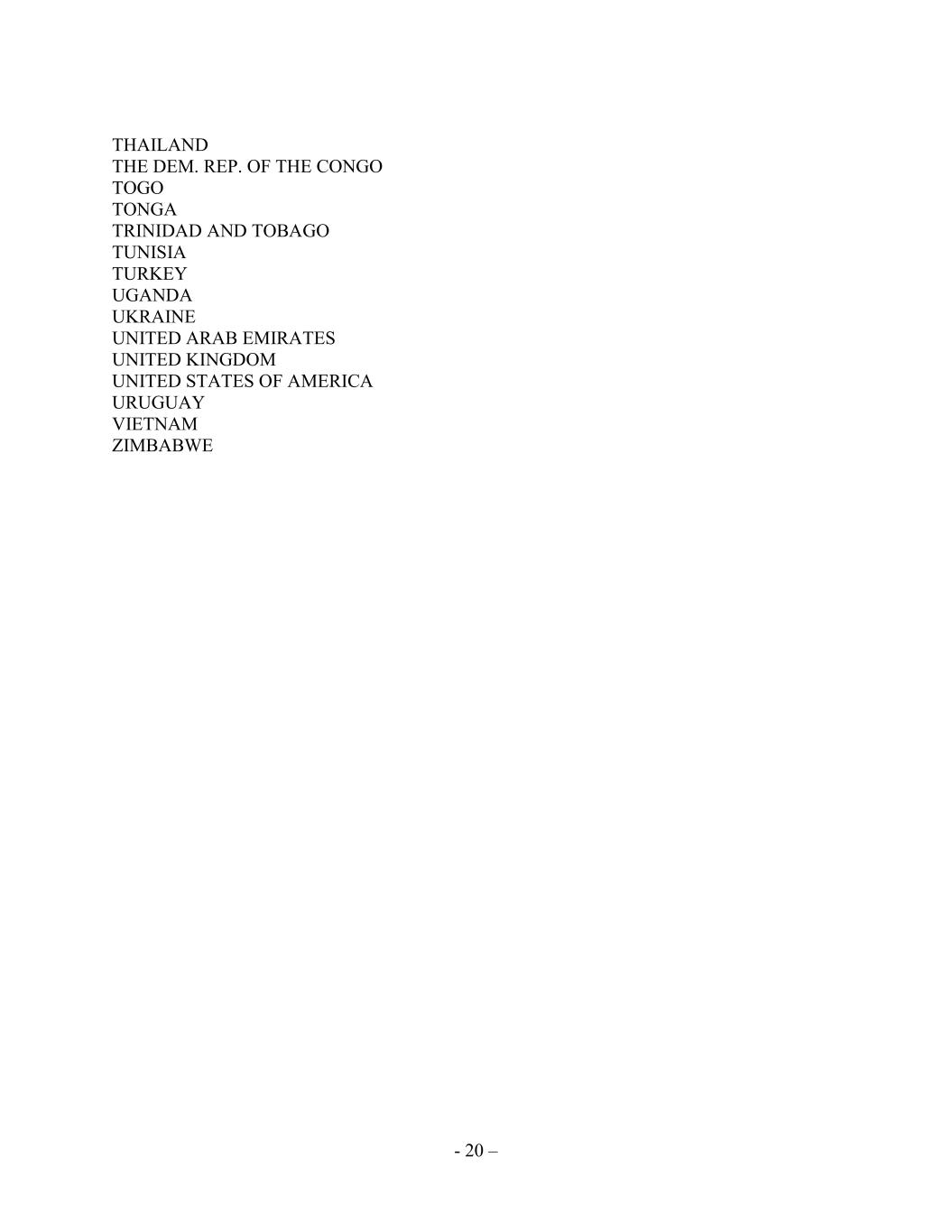 - 20 – THAILAND THE DEM. REP. OF THE CONGO TOGO TONGA TRINIDAD AND TOBAGO TUNISIA TURKEY UGANDA UKRAINE UNITED ARAB EMIRATES UNITED KINGDOM UNITED STATES OF AMERICA URUGUAY VIETNAM ZIMBABWE