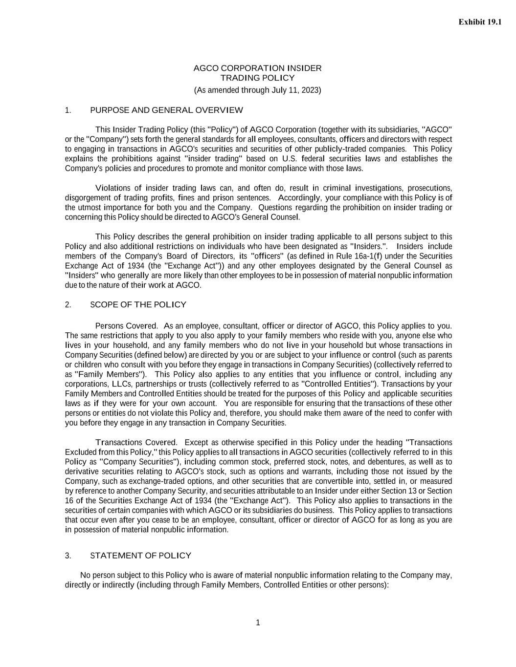 1 AGCO CORPORATION INSIDER TRADING POLICY (As amended through July 11, 2023) 1. PURPOSE AND GENERAL OVERVIEW This Insider Trading Policy (this "Policy") of AGCO Corporation (together with its subsidiaries, "AGCO" or the "Company") sets forth the general standards for all employees, consultants, officers and directors with respect to engaging in transactions in AGCO's securities and securities of other publicly-traded companies. This Policy explains the prohibitions against "insider trading" based on U.S. federal securities laws and establishes the Company's policies and procedures to promote and monitor compliance with those laws. Violations of insider trading laws can, and often do, result in criminal investigations, prosecutions, disgorgement of trading profits, fines and prison sentences. Accordingly, your compliance with this Policy is of the utmost importance for both you and the Company. Questions regarding the prohibition on insider trading or concerning this Policy should be directed to AGCO's General Counsel. This Policy describes the general prohibition on insider trading applicable to all persons subject to this Policy and also additional restrictions on individuals who have been designated as "Insiders.". Insiders include members of the Company's Board of Directors, its "officers" (as defined in Rule 16a-1(f) under the Securities Exchange Act of 1934 (the "Exchange Act")) and any other employees designated by the General Counsel as "Insiders" who generally are more likely than other employees to be in possession of material nonpublic information due to the nature of their work at AGCO. 2. SCOPE OF THE POLICY Persons Covered. As an employee, consultant, officer or director of AGCO, this Policy applies to you. The same restrictions that apply to you also apply to your family members who reside with you, anyone else who lives in your household, and any family members who do not live in your household but whose transactions in Company Securities (defined below) are directed by you or are subject to your influence or control (such as parents or children who consult with you before they engage in transactions in Company Securities) (collectively referred to as "Family Members"). This Policy also applies to any entities that you influence or control, including any corporations, LLCs, partnerships or trusts (collectively referred to as "Controlled Entities"). Transactions by your Family Members and Controlled Entities should be treated for the purposes of this Policy and applicable securities laws as if they were for your own account. You are responsible for ensuring that the transactions of these other persons or entities do not violate this Policy and, therefore, you should make them aware of the need to confer with you before they engage in any transaction in Company Securities. Transactions Covered. Except as otherwise specified in this Policy under the heading "Transactions Excluded from this Policy," this Policy applies to all transactions in AGCO securities (collectively referred to in this Policy as "Company Securities"), including common stock, preferred stock, notes, and debentures, as well as to derivative securities relating to AGCO's stock, such as options and warrants, including those not issued by the Company, such as exchange-traded options, and other securities that are convertible into, settled in, or measured by reference to another Company Security, and securities attributable to an Insider under either Section 13 or Section 16 of the Securities Exchange Act of 1934 (the "Exchange Act"). This Policy also applies to transactions in the securities of certain companies with which AGCO or its subsidiaries do business. This Policy applies to transactions that occur even after you cease to be an employee, consultant, officer or director of AGCO for as long as you are in possession of material nonpublic information. 3. STATEMENT OF POLICY No person subject to this Policy who is aware of material nonpublic information relating to the Company may, directly or indirectly (including through Family Members, Controlled Entities or other persons):