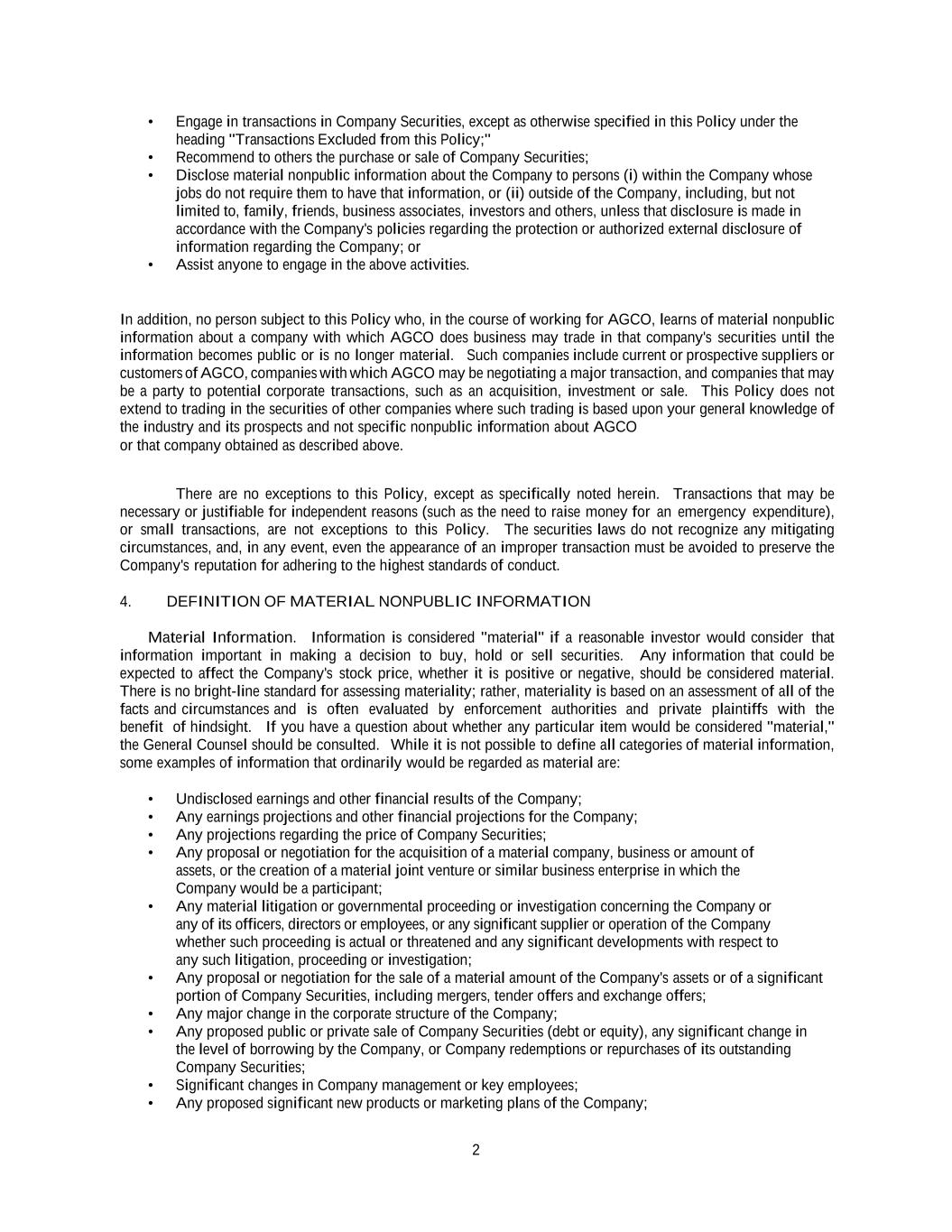 2 • Engage in transactions in Company Securities, except as otherwise specified in this Policy under the heading "Transactions Excluded from this Policy;" • Recommend to others the purchase or sale of Company Securities; • Disclose material nonpublic information about the Company to persons (i) within the Company whose jobs do not require them to have that information, or (ii) outside of the Company, including, but not limited to, family, friends, business associates, investors and others, unless that disclosure is made in accordance with the Company's policies regarding the protection or authorized external disclosure of information regarding the Company; or • Assist anyone to engage in the above activities. In addition, no person subject to this Policy who, in the course of working for AGCO, learns of material nonpublic information about a company with which AGCO does business may trade in that company's securities until the information becomes public or is no longer material. Such companies include current or prospective suppliers or customers of AGCO, companies with which AGCO may be negotiating a major transaction, and companies that may be a party to potential corporate transactions, such as an acquisition, investment or sale. This Policy does not extend to trading in the securities of other companies where such trading is based upon your general knowledge of the industry and its prospects and not specific nonpublic information about AGCO or that company obtained as described above. There are no exceptions to this Policy, except as specifically noted herein. Transactions that may be necessary or justifiable for independent reasons (such as the need to raise money for an emergency expenditure), or small transactions, are not exceptions to this Policy. The securities laws do not recognize any mitigating circumstances, and, in any event, even the appearance of an improper transaction must be avoided to preserve the Company's reputation for adhering to the highest standards of conduct. 4. DEFINITION OF MATERIAL NONPUBLIC INFORMATION Material Information. Information is considered "material" if a reasonable investor would consider that information important in making a decision to buy, hold or sell securities. Any information that could be expected to affect the Company's stock price, whether it is positive or negative, should be considered material. There is no bright-line standard for assessing materiality; rather, materiality is based on an assessment of all of the facts and circumstances and is often evaluated by enforcement authorities and private plaintiffs with the benefit of hindsight. If you have a question about whether any particular item would be considered "material," the General Counsel should be consulted. While it is not possible to define all categories of material information, some examples of information that ordinarily would be regarded as material are: • Undisclosed earnings and other financial results of the Company; • Any earnings projections and other financial projections for the Company; • Any projections regarding the price of Company Securities; • Any proposal or negotiation for the acquisition of a material company, business or amount of assets, or the creation of a material joint venture or similar business enterprise in which the Company would be a participant; • Any material litigation or governmental proceeding or investigation concerning the Company or any of its officers, directors or employees, or any significant supplier or operation of the Company whether such proceeding is actual or threatened and any significant developments with respect to any such litigation, proceeding or investigation; • Any proposal or negotiation for the sale of a material amount of the Company's assets or of a significant portion of Company Securities, including mergers, tender offers and exchange offers; • Any major change in the corporate structure of the Company; • Any proposed public or private sale of Company Securities (debt or equity), any significant change in the level of borrowing by the Company, or Company redemptions or repurchases of its outstanding Company Securities; • Significant changes in Company management or key employees; • Any proposed significant new products or marketing plans of the Company;