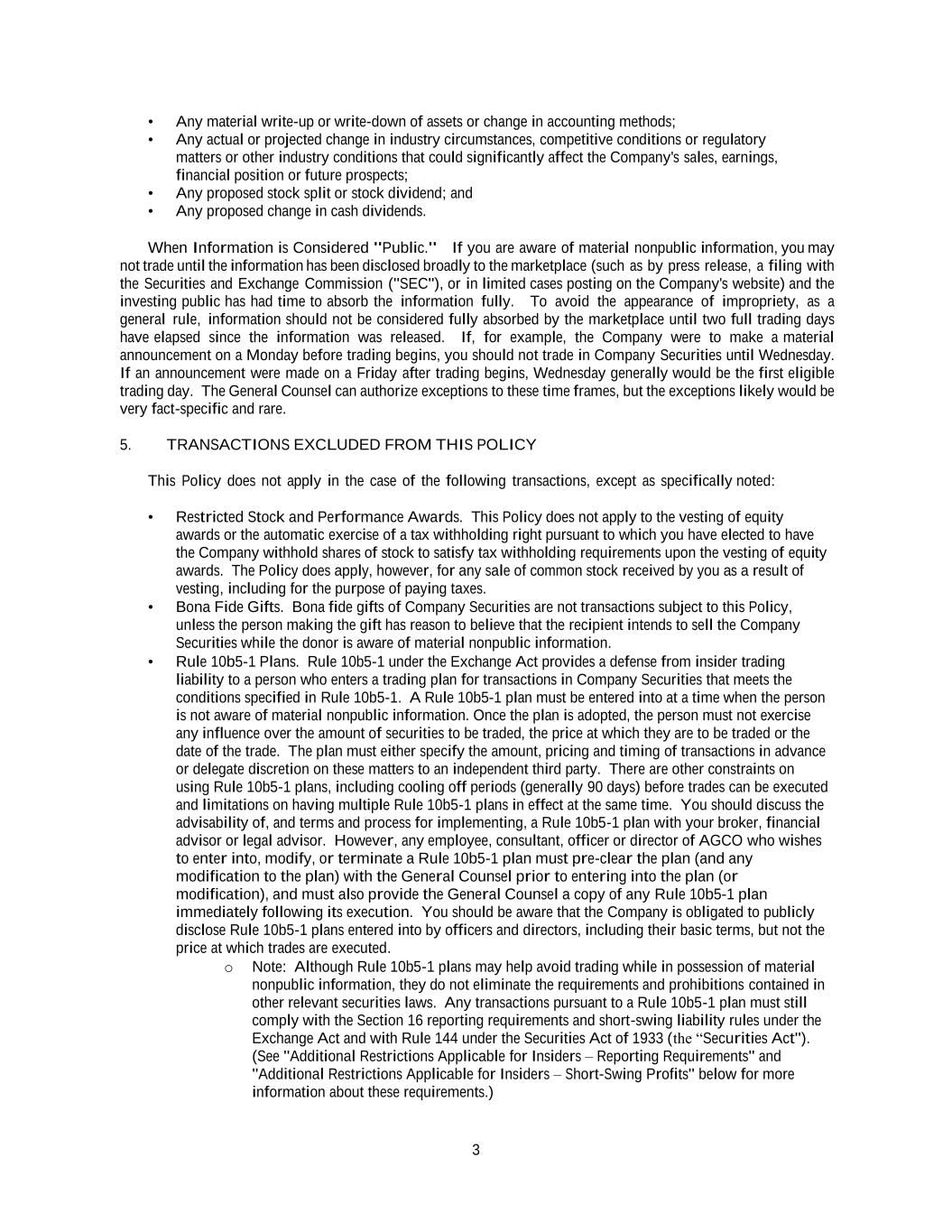 3 • Any material write-up or write-down of assets or change in accounting methods; • Any actual or projected change in industry circumstances, competitive conditions or regulatory matters or other industry conditions that could significantly affect the Company's sales, earnings, financial position or future prospects; • Any proposed stock split or stock dividend; and • Any proposed change in cash dividends. When Information is Considered "Public." If you are aware of material nonpublic information, you may not trade until the information has been disclosed broadly to the marketplace (such as by press release, a filing with the Securities and Exchange Commission ("SEC"), or in limited cases posting on the Company's website) and the investing public has had time to absorb the information fully. To avoid the appearance of impropriety, as a general rule, information should not be considered fully absorbed by the marketplace until two full trading days have elapsed since the information was released. If, for example, the Company were to make a material announcement on a Monday before trading begins, you should not trade in Company Securities until Wednesday. If an announcement were made on a Friday after trading begins, Wednesday generally would be the first eligible trading day. The General Counsel can authorize exceptions to these time frames, but the exceptions likely would be very fact-specific and rare. 5. TRANSACTIONS EXCLUDED FROM THIS POLICY This Policy does not apply in the case of the following transactions, except as specifically noted: • Restricted Stock and Performance Awards. This Policy does not apply to the vesting of equity awards or the automatic exercise of a tax withholding right pursuant to which you have elected to have the Company withhold shares of stock to satisfy tax withholding requirements upon the vesting of equity awards. The Policy does apply, however, for any sale of common stock received by you as a result of vesting, including for the purpose of paying taxes. • Bona Fide Gifts. Bona fide gifts of Company Securities are not transactions subject to this Policy, unless the person making the gift has reason to believe that the recipient intends to sell the Company Securities while the donor is aware of material nonpublic information. • Rule 10b5-1 Plans. Rule 10b5-1 under the Exchange Act provides a defense from insider trading liability to a person who enters a trading plan for transactions in Company Securities that meets the conditions specified in Rule 10b5-1. A Rule 10b5-1 plan must be entered into at a time when the person is not aware of material nonpublic information. Once the plan is adopted, the person must not exercise any influence over the amount of securities to be traded, the price at which they are to be traded or the date of the trade. The plan must either specify the amount, pricing and timing of transactions in advance or delegate discretion on these matters to an independent third party. There are other constraints on using Rule 10b5-1 plans, including cooling off periods (generally 90 days) before trades can be executed and limitations on having multiple Rule 10b5-1 plans in effect at the same time. You should discuss the advisability of, and terms and process for implementing, a Rule 10b5-1 plan with your broker, financial advisor or legal advisor. However, any employee, consultant, officer or director of AGCO who wishes to enter into, modify, or terminate a Rule 10b5-1 plan must pre-clear the plan (and any modification to the plan) with the General Counsel prior to entering into the plan (or modification), and must also provide the General Counsel a copy of any Rule 10b5-1 plan immediately following its execution. You should be aware that the Company is obligated to publicly disclose Rule 10b5-1 plans entered into by officers and directors, including their basic terms, but not the price at which trades are executed. o Note: Although Rule 10b5-1 plans may help avoid trading while in possession of material nonpublic information, they do not eliminate the requirements and prohibitions contained in other relevant securities laws. Any transactions pursuant to a Rule 10b5-1 plan must still comply with the Section 16 reporting requirements and short-swing liability rules under the Exchange Act and with Rule 144 under the Securities Act of 1933 (the “Securities Act"). (See "Additional Restrictions Applicable for Insiders – Reporting Requirements" and "Additional Restrictions Applicable for Insiders – Short-Swing Profits" below for more information about these requirements.)