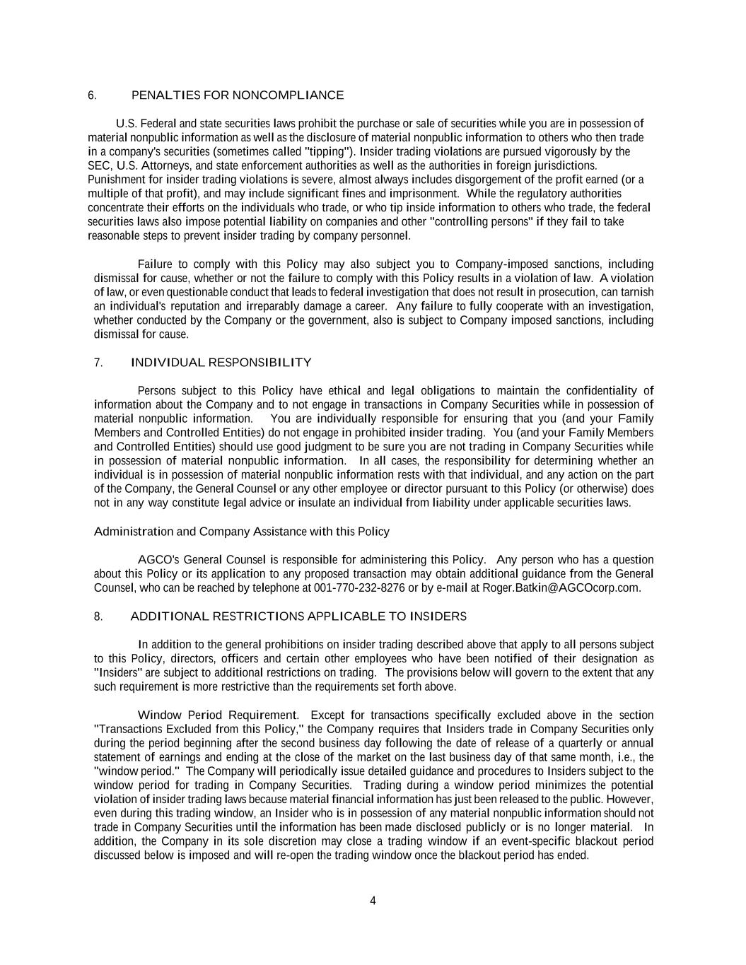4 6. PENALTIES FOR NONCOMPLIANCE U.S. Federal and state securities laws prohibit the purchase or sale of securities while you are in possession of material nonpublic information as well as the disclosure of material nonpublic information to others who then trade in a company's securities (sometimes called "tipping"). Insider trading violations are pursued vigorously by the SEC, U.S. Attorneys, and state enforcement authorities as well as the authorities in foreign jurisdictions. Punishment for insider trading violations is severe, almost always includes disgorgement of the profit earned (or a multiple of that profit), and may include significant fines and imprisonment. While the regulatory authorities concentrate their efforts on the individuals who trade, or who tip inside information to others who trade, the federal securities laws also impose potential liability on companies and other "controlling persons" if they fail to take reasonable steps to prevent insider trading by company personnel. Failure to comply with this Policy may also subject you to Company-imposed sanctions, including dismissal for cause, whether or not the failure to comply with this Policy results in a violation of law. A violation of law, or even questionable conduct that leads to federal investigation that does not result in prosecution, can tarnish an individual's reputation and irreparably damage a career. Any failure to fully cooperate with an investigation, whether conducted by the Company or the government, also is subject to Company imposed sanctions, including dismissal for cause. 7. INDIVIDUAL RESPONSIBILITY Persons subject to this Policy have ethical and legal obligations to maintain the confidentiality of information about the Company and to not engage in transactions in Company Securities while in possession of material nonpublic information. You are individually responsible for ensuring that you (and your Family Members and Controlled Entities) do not engage in prohibited insider trading. You (and your Family Members and Controlled Entities) should use good judgment to be sure you are not trading in Company Securities while in possession of material nonpublic information. In all cases, the responsibility for determining whether an individual is in possession of material nonpublic information rests with that individual, and any action on the part of the Company, the General Counsel or any other employee or director pursuant to this Policy (or otherwise) does not in any way constitute legal advice or insulate an individual from liability under applicable securities laws. Administration and Company Assistance with this Policy AGCO's General Counsel is responsible for administering this Policy. Any person who has a question about this Policy or its application to any proposed transaction may obtain additional guidance from the General Counsel, who can be reached by telephone at 001-770-232-8276 or by e-mail at Roger.Batkin@AGCOcorp.com. 8. ADDITIONAL RESTRICTIONS APPLICABLE TO INSIDERS In addition to the general prohibitions on insider trading described above that apply to all persons subject to this Policy, directors, officers and certain other employees who have been notified of their designation as "Insiders" are subject to additional restrictions on trading. The provisions below will govern to the extent that any such requirement is more restrictive than the requirements set forth above. Window Period Requirement. Except for transactions specifically excluded above in the section "Transactions Excluded from this Policy," the Company requires that Insiders trade in Company Securities only during the period beginning after the second business day following the date of release of a quarterly or annual statement of earnings and ending at the close of the market on the last business day of that same month, i.e., the "window period." The Company will periodically issue detailed guidance and procedures to Insiders subject to the window period for trading in Company Securities. Trading during a window period minimizes the potential violation of insider trading laws because material financial information has just been released to the public. However, even during this trading window, an Insider who is in possession of any material nonpublic information should not trade in Company Securities until the information has been made disclosed publicly or is no longer material. In addition, the Company in its sole discretion may close a trading window if an event-specific blackout period discussed below is imposed and will re-open the trading window once the blackout period has ended.