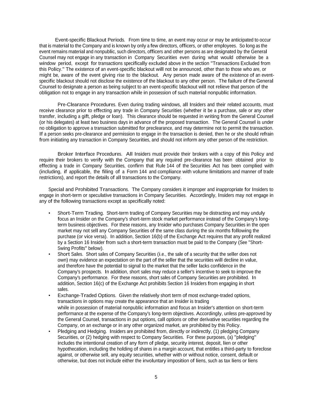 5 Event-specific Blackout Periods. From time to time, an event may occur or may be anticipated to occur that is material to the Company and is known by only a few directors, officers, or other employees. So long as the event remains material and nonpublic, such directors, officers and other persons as are designated by the General Counsel may not engage in any transaction in Company Securities even during what would otherwise be a window period, except for transactions specifically excluded above in the section "Transactions Excluded from this Policy." The existence of an event-specific blackout will not be announced, other than to those who are, or might be, aware of the event giving rise to the blackout. Any person made aware of the existence of an event- specific blackout should not disclose the existence of the blackout to any other person. The failure of the General Counsel to designate a person as being subject to an event-specific blackout will not relieve that person of the obligation not to engage in any transaction while in possession of such material nonpublic information. Pre-Clearance Procedures. Even during trading windows, all Insiders and their related accounts, must receive clearance prior to effecting any trade in Company Securities (whether it be a purchase, sale or any other transfer, including a gift, pledge or loan). This clearance should be requested in writing from the General Counsel (or his delegates) at least two business days in advance of the proposed transaction. The General Counsel is under no obligation to approve a transaction submitted for preclearance, and may determine not to permit the transaction. If a person seeks pre-clearance and permission to engage in the transaction is denied, then he or she should refrain from initiating any transaction in Company Securities, and should not inform any other person of the restriction. Broker Interface Procedures. All Insiders must provide their brokers with a copy of this Policy and require their brokers to verify with the Company that any required pre-clearance has been obtained prior to effecting a trade in Company Securities, confirm that Rule 144 of the Securities Act has been complied with (including, if applicable, the filing of a Form 144 and compliance with volume limitations and manner of trade restrictions), and report the details of all transactions to the Company. Special and Prohibited Transactions. The Company considers it improper and inappropriate for Insiders to engage in short-term or speculative transactions in Company Securities. Accordingly, Insiders may not engage in any of the following transactions except as specifically noted: • Short-Term Trading. Short-term trading of Company Securities may be distracting and may unduly focus an Insider on the Company's short-term stock market performance instead of the Company's long- term business objectives. For these reasons, any Insider who purchases Company Securities in the open market may not sell any Company Securities of the same class during the six months following the purchase (or vice versa). In addition, Section 16(b) of the Exchange Act requires that any profit realized by a Section 16 Insider from such a short-term transaction must be paid to the Company (See "Short- Swing Profits" below). • Short Sales. Short sales of Company Securities (i.e., the sale of a security that the seller does not own) may evidence an expectation on the part of the seller that the securities will decline in value, and therefore have the potential to signal to the market that the seller lacks confidence in the Company's prospects. In addition, short sales may reduce a seller's incentive to seek to improve the Company's performance. For these reasons, short sales of Company Securities are prohibited. In addition, Section 16(c) of the Exchange Act prohibits Section 16 Insiders from engaging in short sales. • Exchange-Traded Options. Given the relatively short term of most exchange-traded options, transactions in options may create the appearance that an Insider is trading while in possession of material nonpublic information and focus an Insider's attention on short-term performance at the expense of the Company's long-term objectives. Accordingly, unless pre-approved by the General Counsel, transactions in put options, call options or other derivative securities regarding the Company, on an exchange or in any other organized market, are prohibited by this Policy. • Pledging and Hedging. Insiders are prohibited from, directly or indirectly, (1) pledging Company Securities, or (2) hedging with respect to Company Securities. For these purposes, (a) "pledging" includes the intentional creation of any form of pledge, security interest, deposit, lien or other hypothecation, including the holding of shares in a margin account, that entitles a third-party to foreclose against, or otherwise sell, any equity securities, whether with or without notice, consent, default or otherwise, but does not include either the involuntary imposition of liens, such as tax liens or liens