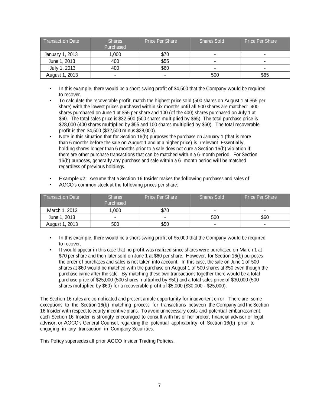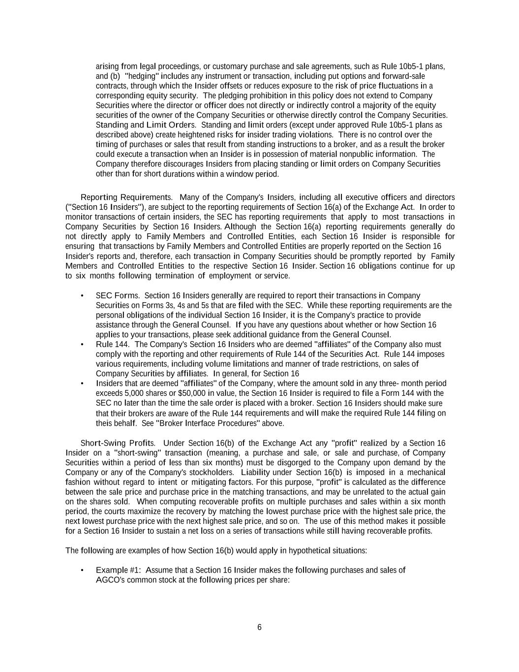 6 arising from legal proceedings, or customary purchase and sale agreements, such as Rule 10b5-1 plans, and (b) "hedging" includes any instrument or transaction, including put options and forward-sale contracts, through which the Insider offsets or reduces exposure to the risk of price fluctuations in a corresponding equity security. The pledging prohibition in this policy does not extend to Company Securities where the director or officer does not directly or indirectly control a majority of the equity securities of the owner of the Company Securities or otherwise directly control the Company Securities. Standing and Limit Orders. Standing and limit orders (except under approved Rule 10b5-1 plans as described above) create heightened risks for insider trading violations. There is no control over the timing of purchases or sales that result from standing instructions to a broker, and as a result the broker could execute a transaction when an Insider is in possession of material nonpublic information. The Company therefore discourages Insiders from placing standing or limit orders on Company Securities other than for short durations within a window period. Reporting Requirements. Many of the Company's Insiders, including all executive officers and directors ("Section 16 Insiders"), are subject to the reporting requirements of Section 16(a) of the Exchange Act. In order to monitor transactions of certain insiders, the SEC has reporting requirements that apply to most transactions in Company Securities by Section 16 Insiders. Although the Section 16(a) reporting requirements generally do not directly apply to Family Members and Controlled Entities, each Section 16 Insider is responsible for ensuring that transactions by Family Members and Controlled Entities are properly reported on the Section 16 Insider's reports and, therefore, each transaction in Company Securities should be promptly reported by Family Members and Controlled Entities to the respective Section 16 Insider. Section 16 obligations continue for up to six months following termination of employment or service. • SEC Forms. Section 16 Insiders generally are required to report their transactions in Company Securities on Forms 3s, 4s and 5s that are filed with the SEC. While these reporting requirements are the personal obligations of the individual Section 16 Insider, it is the Company's practice to provide assistance through the General Counsel. If you have any questions about whether or how Section 16 applies to your transactions, please seek additional guidance from the General Counsel. • Rule 144. The Company's Section 16 Insiders who are deemed "affiliates" of the Company also must comply with the reporting and other requirements of Rule 144 of the Securities Act. Rule 144 imposes various requirements, including volume limitations and manner of trade restrictions, on sales of Company Securities by affiliates. In general, for Section 16 • Insiders that are deemed "affiliates" of the Company, where the amount sold in any three- month period exceeds 5,000 shares or $50,000 in value, the Section 16 Insider is required to file a Form 144 with the SEC no later than the time the sale order is placed with a broker. Section 16 Insiders should make sure that their brokers are aware of the Rule 144 requirements and will make the required Rule 144 filing on theis behalf. See "Broker lnterface Procedures" above. Short-Swing Profits. Under Section 16(b) of the Exchange Act any "profit" realized by a Section 16 Insider on a "short-swing" transaction (meaning, a purchase and sale, or sale and purchase, of Company Securities within a period of less than six months) must be disgorged to the Company upon demand by the Company or any of the Company's stockholders. Liability under Section 16(b) is imposed in a mechanical fashion without regard to intent or mitigating factors. For this purpose, "profit" is calculated as the difference between the sale price and purchase price in the matching transactions, and may be unrelated to the actual gain on the shares sold. When computing recoverable profits on multiple purchases and sales within a six month period, the courts maximize the recovery by matching the lowest purchase price with the highest sale price, the next lowest purchase price with the next highest sale price, and so on. The use of this method makes it possible for a Section 16 Insider to sustain a net loss on a series of transactions while still having recoverable profits. The following are examples of how Section 16(b) would apply in hypothetical situations: • Example #1: Assume that a Section 16 Insider makes the following purchases and sales of AGCO's common stock at the following prices per share: