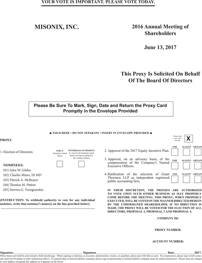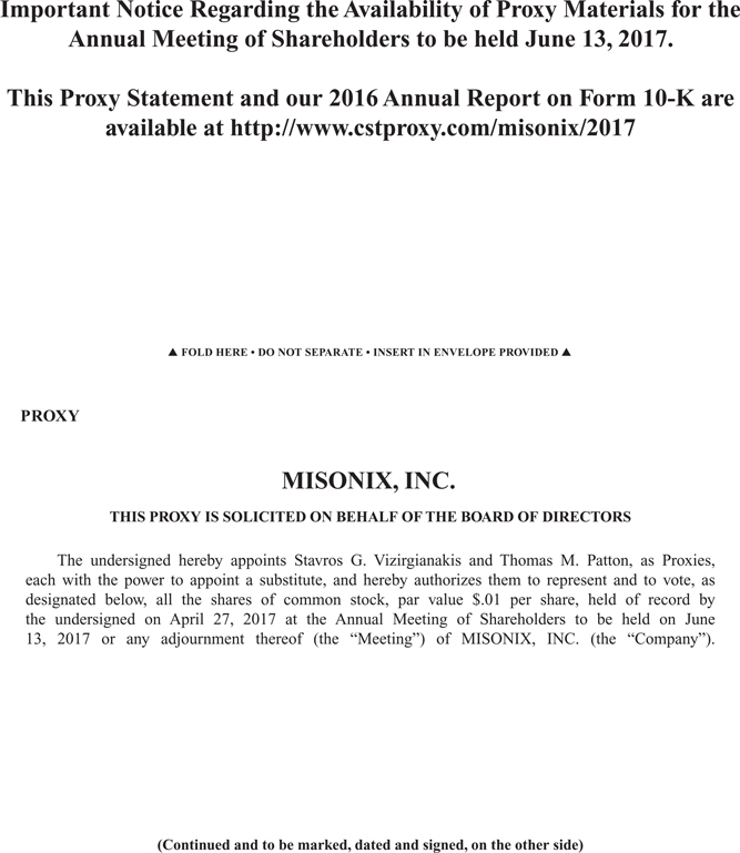 NOTICE IS HEREBY GIVEN that the Annual Meeting of Shareholders (the “Annual Meeting”) of Misonix, Inc., a New York corporation (the “Company”), will be held at the Company’s Corporate Office, 1938 New Highway, Farmingdale, NY 11735 on Tuesday, June 13, 2017 at 10:00 a.m., or at any adjournment thereof, for the following purposes: