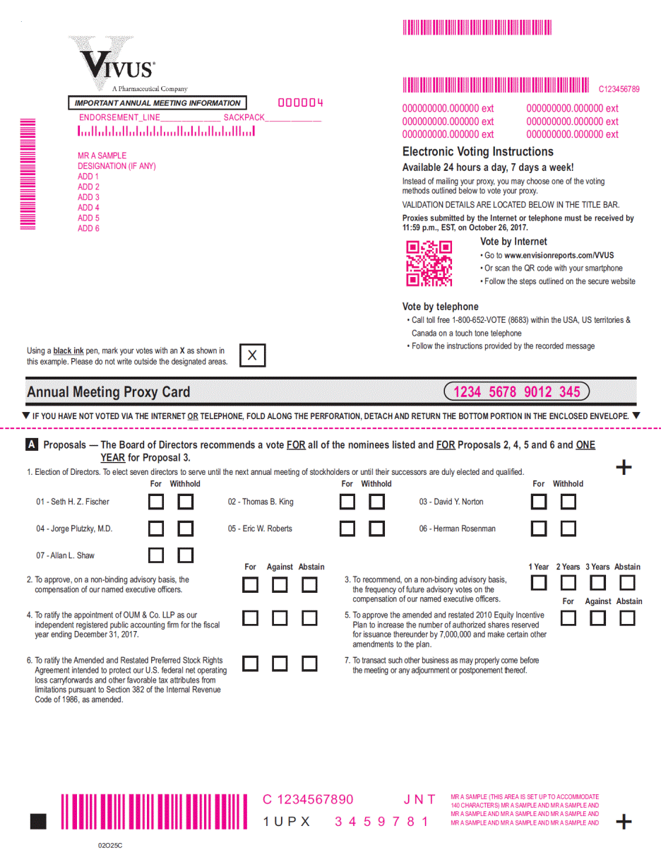 . q IF YOU HAVE NOT VOTED VIA THE INTERNET OR TELEPHONE, FOLD ALONG THE PERFORATION, DETACH AND RETURN THE BOTTOM PORTION IN THE ENCLOSED ENVELOPE. q Proxy — VIVUS, INC. + Notice of 2017 Annual Meeting of Stockholders Proxy Solicited by the Board of Directors for the Annual Meeting of Stockholders — October 27, 2017 Seth H. Z. Fischer and John L. Slebir, or any of them, each with the power of substitution, are hereby authorized to represent and vote the shares of the undersigned, with all the powers which the undersigned would possess if personally present, at the Annual Meeting of Stockholders of VIVUS, Inc., a Delaware corporation, to be held on Friday, October 27, 2017, at 8:00 a.m., local time, at Weil, Gotshal & Manges LLP, 767 Fifth Avenue, New York, New York 10153, or at any postponement or adjournment thereof. Shares represented by this proxy will be voted by the stockholder. If no such directions are indicated, the Proxies will have authority to vote FOR the nominees listed on the reverse side and FOR Proposals 2, 4, 5 and 6 and ONE YEAR for Proposal 3. Should a director nominee be unable to serve as a director, an event not currently anticipated, the Proxies reserve the right, in their discretion, to vote for a substitute nominee designated by the Board of Directors. Also, in their discretion, the Proxies are authorized to vote upon such other business as may properly come before the meeting. If you vote your proxy by internet or by telephone, you do NOT need to mail back your proxy card. To vote by mail, mark, sign and date your proxy card and return it in the enclosed postage-paid envelope. (Items to be voted appear on reverse side.) Non-Voting Items Change of Address — Please print new address below. Authorized Signatures — This section must be completed for your vote to be counted. — Date and Sign Below This Proxy should be marked, dated and signed by the stockholder(s) exactly as his, her or its name appears hereon, and returned promptly in the enclosed envelope. If held in joint tenancy, all persons must sign. Trustees, administrators, etc. should include title and authority. Corporations should provide full name of corporation and title of authorized officer signing the proxy. Date (mm/dd/yyyy) — Please print date below. Signature 1 — Please keep signature within the box. Signature 2 — Please keep signature within the box. + IF VOTING BY MAIL, YOU MUST COMPLETE SECTIONS A - C ON BOTH SIDES OF THIS CARD. C B