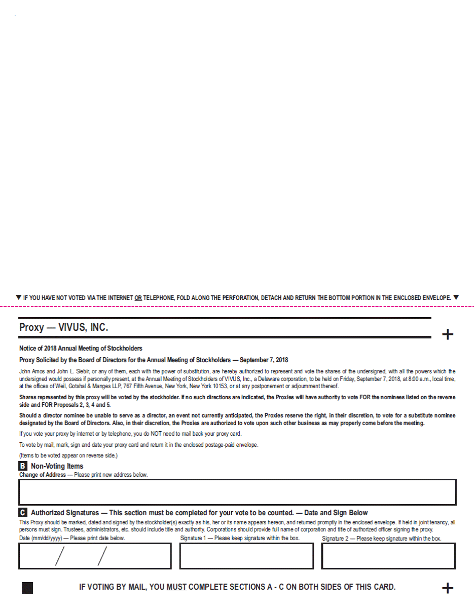 . q IF YOU HAVE NOT VOTED VIA THE INTERNET OR TELEPHONE, FOLD ALONG THE PERFORATION, DETACH AND RETURN THE BOTTOM PORTION IN THE ENCLOSED ENVELOPE. q Proxy — VIVUS, INC. + Notice of 2018 Annual Meeting of Stockholders Proxy Solicited by the Board of Directors for the Annual Meeting of Stockholders — September 7, 2018 John Amos and John L. Slebir, or any of them, each with the power of substitution, are hereby authorized to represent and vote the shares of the undersigned, with all the powers which the undersigned would possess if personally present, at the Annual Meeting of Stockholders of VIVUS, Inc., a Delaware corporation, to be held on Friday, September 7, 2018, at 8:00 a.m., local time, at the offices of Weil, Gotshal & Manges LLP, 767 Fifth Avenue, New York, New York 10153, or at any postponement or adjournment thereof. Shares represented by this proxy will be voted by the stockholder. If no such directions are indicated, the Proxies will have authority to vote FOR the nominees listed on the reverse side and FOR Proposals 2, 3, 4 and 5. Should a director nominee be unable to serve as a director, an event not currently anticipated, the Proxies reserve the right, in their discretion, to vote for a substitute nominee designated by the Board of Directors. Also, in their discretion, the Proxies are authorized to vote upon such other business as may properly come before the meeting. If you vote your proxy by internet or by telephone, you do NOT need to mail back your proxy card. To vote by mail, mark, sign and date your proxy card and return it in the enclosed postage-paid envelope. (Items to be voted appear on reverse side.) Non-Voting Items Change of Address — Please print new address below. Authorized Signatures — This section must be completed for your vote to be counted. — Date and Sign Below This Proxy should be marked, dated and signed by the stockholder(s) exactly as his, her or its name appears hereon, and returned promptly in the enclosed envelope. If held in joint tenancy, all persons must sign. Trustees, administrators, etc. should include title and authority. Corporations should provide full name of corporation and title of authorized officer signing the proxy. Date (mm/dd/yyyy) — Please print date below. Signature 1 — Please keep signature within the box. Signature 2 — Please keep signature within the box. + IF VOTING BY MAIL, YOU MUST COMPLETE SECTIONS A - C ON BOTH SIDES OF THIS CARD. C B
