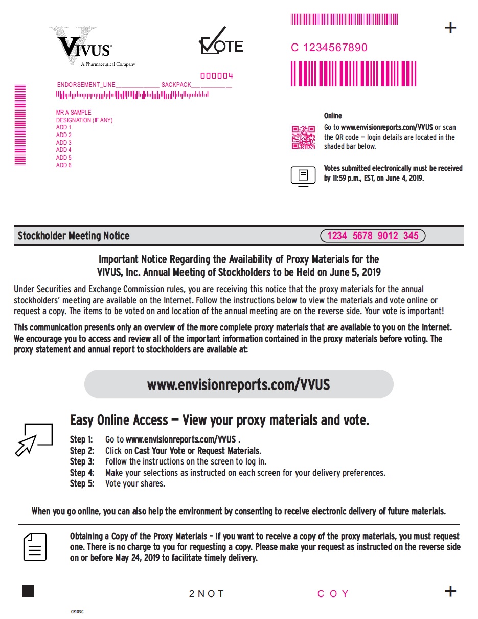 MMMMMMMMMMMM + MMMMMMM C 1234567890 The Sample Company 000004 ENDORSEMENT_LINE______________ SACKPACK_____________ MR A SAMPLE DESIGNATION (IF ANY) ADD 1 ADD 2 ADD 3 ADD 4 ADD 5 ADD 6 Online Go to www.envisionreports.com/VVUS or scan the QR code — login details are located in the shaded bar below. Votes submitted electronically must be received by 11:59 p.m., EST, on June 4, 2019. Important Notice Regarding the Availability of Proxy Materials for the VIVUS, Inc. Annual Meeting of Stockholders to be Held on June 5, 2019 Under Securities and Exchange Commission rules, you are receiving this notice that the proxy materials for the annual stockholders’ meeting are available on the Internet. Follow the instructions below to view the materials and vote online or request a copy. The items to be voted on and location of the annual meeting are on the reverse side. Your vote is important! This communication presents only an overview of the more complete proxy materials that are available to you on the Internet. We encourage you to access and review all of the important information contained in the proxy materials before voting. The proxy statement and annual report to stockholders are available at: www.envisionreports.com/VVUS Easy Online Access — View your proxy materials and vote. Step 1: Step 2: Step 3: Step 4: Step 5: Go to www.envisionreports.com/VVUS . Click on Cast Your Vote or Request Materials. Follow the instructions on the screen to log in. Make your selections as instructed on each screen for your delivery preferences. Vote your shares. When you go online, you can also help the environment by consenting to receive electronic delivery of future materials. Obtaining a Copy of the Proxy Materials – If you want to receive a copy of the proxy materials, you must request one. There is no charge to you for requesting a copy. Please make your request as instructed on the reverse side on or before May 24, 2019 to facilitate timely delivery. + 2 N O T C O Y 031O3C MMMMMMMMM Stockholder Meeting Notice 1234 5678 9012 345