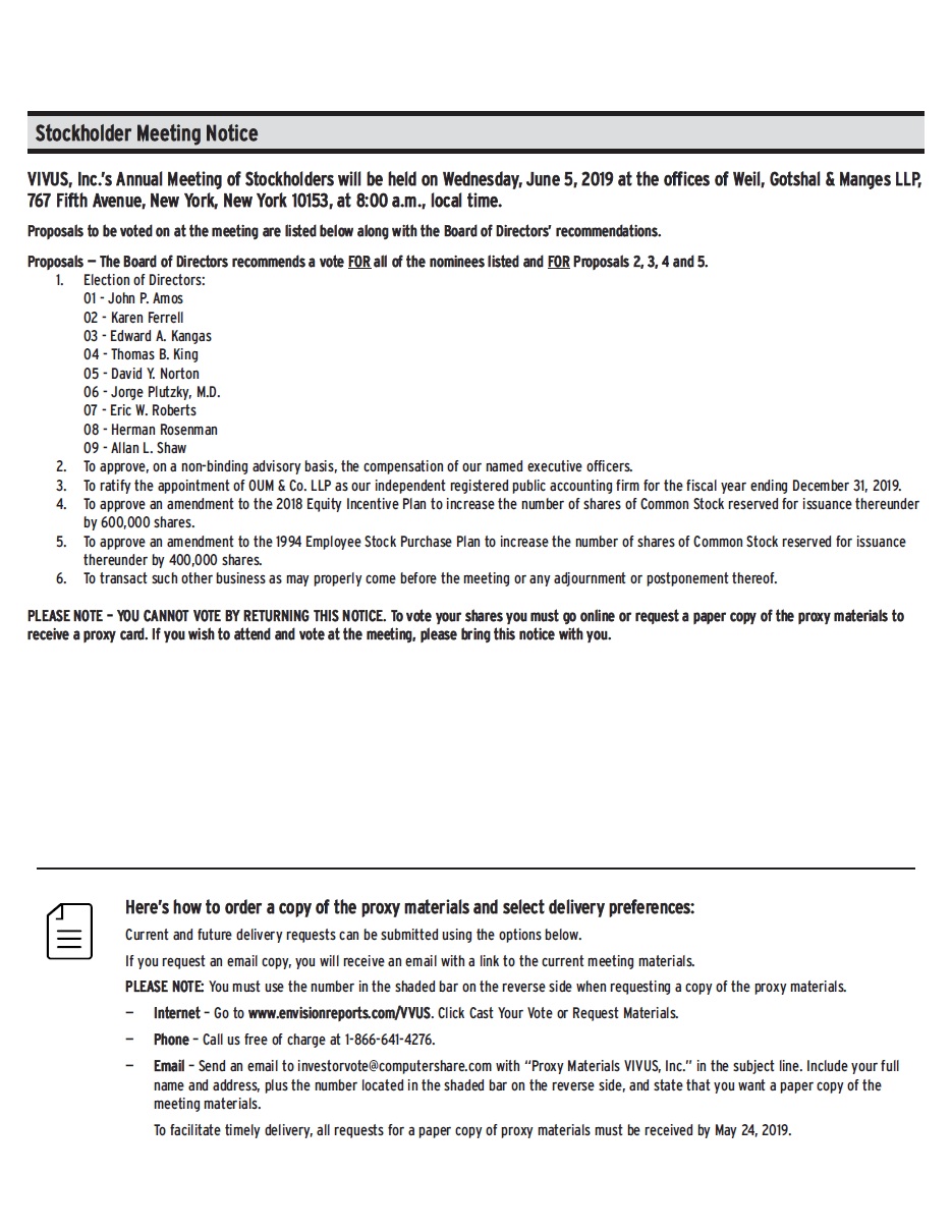 VIVUS, Inc.’s Annual Meeting of Stockholders will be held on Wednesday, June 5, 2019 at the offices of Weil, Gotshal & Manges LLP, 767 Fifth Avenue, New York, New York 10153, at 8:00 a.m., local time. Proposals to be voted on at the meeting are listed below along with the Board of Directors’ recommendations. Proposals — The Board of Directors recommends a vote FOR all of the nominees listed and FOR Proposals 2, 3, 4 and 5. 1. Election of Directors: 01 - John P. Amos 02 - Karen Ferrell 03 - Edward A. Kangas 04 - Thomas B. King 05 - David Y. Norton 06 - Jorge Plutzky, M.D. 07 - Eric W. Roberts 08 - Herman Rosenman 09 - Allan L. Shaw To approve, on a non-binding advisory basis, the compensation of our named executive officers. To ratify the appointment of OUM & Co. LLP as our independent registered public accounting firm for the fiscal year ending December 31, 2019. To approve an amendment to the 2018 Equity Incentive Plan to increase the number of shares of Common Stock reserved for issuance thereunder by 600,000 shares. To approve an amendment to the 1994 Employee Stock Purchase Plan to increase the number of shares of Common Stock reserved for issuance thereunder by 400,000 shares. To transact such other business as may properly come before the meeting or any adjournment or postponement thereof. 2. 3. 4. 5. 6. PLEASE NOTE – YOU CANNOT VOTE BY RETURNING THIS NOTICE. To vote your shares you must go online or request a paper copy of the proxy materials to receive a proxy card. If you wish to attend and vote at the meeting, please bring this notice with you. Here’s how to order a copy of the proxy materials and select delivery preferences: Current and future delivery requests can be submitted using the options below. If you request an email copy, you will receive an email with a link to the current meeting materials. PLEASE NOTE: You must use the number in the shaded bar on the reverse side when requesting a copy of the proxy materials. — — — Internet – Go to www.envisionreports.com/VVUS. Click Cast Your Vote or Request Materials. Phone – Call us free of charge at 1-866-641-4276. Email – Send an email to investorvote@computershare.com with “Proxy Materials VIVUS, Inc.” in the subject line. Include your full name and address, plus the number located in the shaded bar on the reverse side, and state that you want a paper copy of the meeting materials. To facilitate timely delivery, all requests for a paper copy of proxy materials must be received by May 24, 2019. Stockholder Meeting Notice