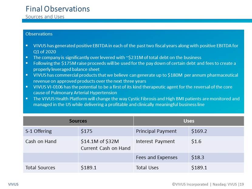 Final Observations Sources and Uses VIVUS ©VIVUS Incorporated Nasdaq: VVUS 19 Observations VIVUS has generated positive EBITDA in each of the past two fiscal years along with positive EBITDA for Q1 of 2020 The company is significantly over levered with ~$231M of total debt on the business Following the $175M raise proceeds will be used for the pay down of certain debt and fees to create a properly leveraged balance sheet VIVUS has commercial products that we believe can generate up to $180M per annum pharmaceutical revenue on approved products over the next three years VIVUS VI-0106 has the potential to be a first of its kind therapeutic agent for the reversal of the core cause of Pulmonary Arterial Hypertension The VIVUS Health Platform will change the way Cystic Fibrosis and High BMI patients are monitored and managed in the US while delivering a profitable and clinically meaningful business line Sources Uses S-1 Offering $175 Principal Payment $169.2 Cash on Hand $14.1M of $32M Current Cash on Hand Interest Payment $1.6 Fees and Expenses $18.3 Total Sources $189.1 Total Uses $189.1