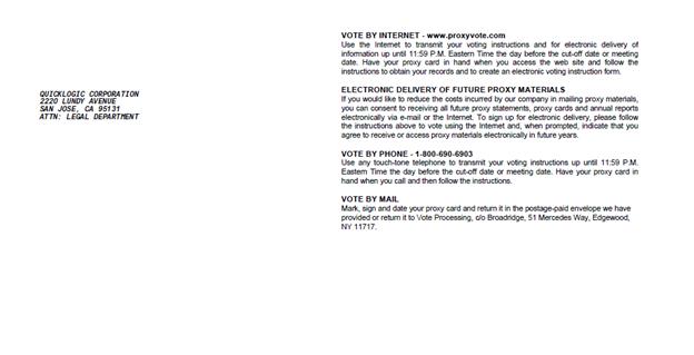 THIS PROXY CARD IS VALID ONLY WHEN SIGNED AND DATED. KEEP THIS PORTION FOR YOUR RECORDS DETACH AND RETURN THIS PORTION ONLY TO VOTE, MARK BLOCKS BELOW IN BLUE OR BLACK INK AS FOLLOWS: Signature [PLEASE SIGN WITHIN BOX] Date Signature (Joint Owners) Date To withhold authority to vote for any individual nominee(s), mark “For All Except” and write the number(s) of the nominee(s) on the line below. 0 0 0 0 0 0 0 0 0 0 0 0 0 0 0 0 0 0000446387_1 R1.0.1.18 For Withhold For All All All Except The Board of Directors recommends you vote FOR the following: 1. Election of Directors Nominees 01) Brian C. Faith 02) Christine Russell QUICKLOGIC CORPORATION 2220 LUNDY AVENUE SAN JOSE, CA 95131 ATTN: LEGAL DEPARTMENT VOTE BY INTERNET - www.proxyvote.com Use the Internet to transmit your voting instructions and for electronic delivery of information up until 11:59 P.M. Eastern Time the day before the cut-off date or meeting date. Have your proxy card in hand when you access the web site and follow the instructions to obtain your records and to create an electronic voting instruction form. ELECTRONIC DELIVERY OF FUTURE PROXY MATERIALS If you would like to reduce the costs incurred by our company in mailing proxy materials, you can consent to receiving all future proxy statements, proxy cards and annual reports electronically via e-mail or the Internet. To sign up for electronic delivery, please follow the instructions above to vote using the Internet and, when prompted, indicate that you agree to receive or access proxy materials electronically in future years. VOTE BY PHONE - 1-800-690-6903 Use any touch-tone telephone to transmit your voting instructions up until 11:59 P.M. Eastern Time the day before the cut-off date or meeting date. Have your proxy card in hand when you call and then follow the instructions. VOTE BY MAIL Mark, sign and date your proxy card and return it in the postage-paid envelope we have provided or return it to Vote Processing, c/o Broadridge, 51 Mercedes Way, Edgewood, NY 11717.
