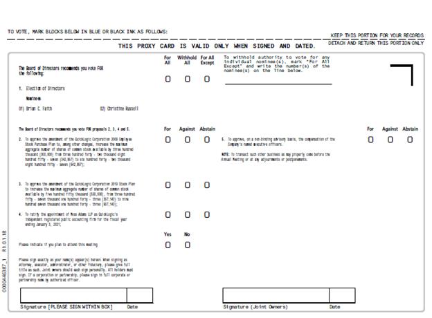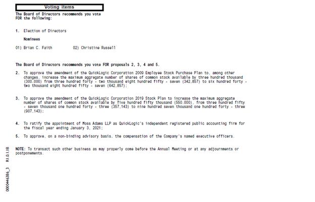 Voting items 0000446386_3 R1.0.1.18 The Board of Directors recommends you vote FOR the following: 1. Election of Directors Nominees 01) Brian C. Faith 02) Christine Russell The Board of Directors recommends you vote FOR proposals 2, 3, 4 and 5. 2. To approve the amendment of the QuickLogic Corporation 2009 Employee Stock Purchase Plan to, among other changes, increase the maximum aggregate number of shares of common stock available by three hundred thousand (300,000) from three hundred forty - two thousand eight hundred fifty - seven (342,857) to six hundred forty - two thousand eight hundred fifty - seven (642,857); 3. To approve the amendment of the QuickLogic Corporation 2019 Stock Plan to increase the maximum aggregate number of shares of common stock available by five hundred fifty thousand (550,000), from three hundred fifty - seven thousand one hundred forty - three (357,143) to nine hundred seven thousand one hundred forty - three (907,143); 4. To ratify the appointment of Moss Adams LLP as QuickLogic's independent registered public accounting firm for the fiscal year ending January 3, 2021; 5. To approve, on a non-binding advisory basis, the compensation of the Company's named executive officers. NOTE: To transact such other business as may properly come before the Annual Meeting or at any adjournments or postponements.