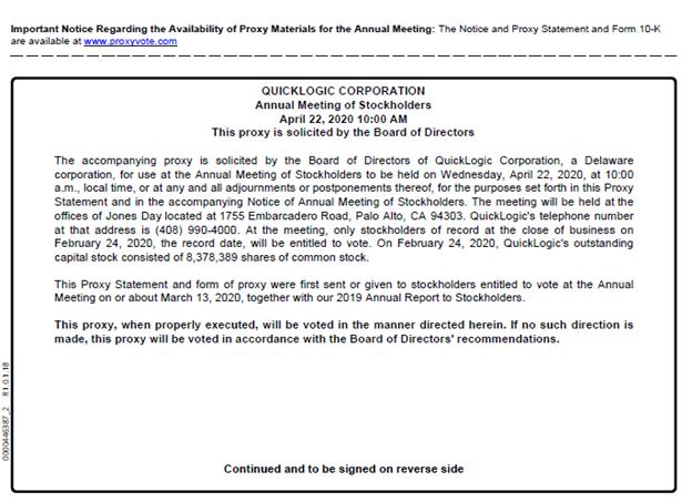 0000446387_2 R1.0.1.18 Important Notice Regarding the Availability of Proxy Materials for the Annual Meeting: The Notice and Proxy Statement and Form 10-K are available at www.proxyvote.com QUICKLOGIC CORPORATION Annual Meeting of Stockholders April 22, 2020 10:00 AM This proxy is solicited by the Board of Directors The accompanying proxy is solicited by the Board of Directors of QuickLogic Corporation, a Delaware corporation, for use at the Annual Meeting of Stockholders to be held on Wednesday, April 22, 2020, at 10:00 a.m., local time, or at any and all adjournments or postponements thereof, for the purposes set forth in this Proxy Statement and in the accompanying Notice of Annual Meeting of Stockholders. The meeting will be held at the offices of Jones Day located at 1755 Embarcadero Road, Palo Alto, CA 94303. QuickLogic's telephone number at that address is (408) 990-4000. At the meeting, only stockholders of record at the close of business on February 24, 2020, the record date, will be entitled to vote. On February 24, 2020, QuickLogic's outstanding capital stock consisted of 8,378,389 shares of common stock. This Proxy Statement and form of proxy were first sent or given to stockholders entitled to vote at the Annual Meeting on or about March 13, 2020, together with our 2019 Annual Report to Stockholders. This proxy, when properly executed, will be voted in the manner directed herein. If no such direction is made, this proxy will be voted in accordance with the Board of Directors' recommendations. Continued and to be signed on reverse side
