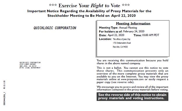 See the reverse side of this notice to obtain proxy materials and voting instructions. *** Exercise Your Right to Vote *** Important Notice Regarding the Availability of Proxy Materials for the Stockholder Meeting to Be Held on <mtgdate>. You are receiving this communication because you hold shares in the above named company. This is not a ballot. You cannot use this notice to vote these shares. This communication presents only an overview of the more complete proxy materials that are available to you on the Internet. You may view the proxy materials online at www.proxyvote.com or easily request a paper copy (see reverse side). We encourage you to access and review all of the important information contained in the proxy materials before voting. Meeting Information Meeting Type: <mtgtype> For holders as of: <recdate> Date: Time: <mtgtime> Location: 0000446386_1 R1.0.1.18 QUICKLOGIC CORPORATION QUICKLOGIC CORPORATION 2220 LUNDY AVENUE SAN JOSE, CA 95131 ATTN: LEGAL DEPARTMENT Annual Meeting February 24, 2020 April 22, 2020 April 22, 2020 10:00 AM PDT The offices of Jones Day 1755 Embarcadero Road Palo Alto, CA 94303 Please Choose One of the Following Voting Methods Vote In Person: Many stockholder meetings have attendance requirements including, but not limited to, the possession of an attendance ticket issued by the entity holding the meeting. Please check the meeting materials for any special requirements for meeting attendance. At the meeting, you will need to request a ballot to vote these shares. Vote By Internet: To vote now by Internet, go to www.proxyvote.com. Have the information that is printed in the box marked by the arrow available and follow the instructions. Vote By Mail: You can vote by mail by requesting a paper copy of the materials, which will include a proxy card. How To Vote . Before You Vote How to Access the Proxy Materials Proxy Materials Available to VIEW or RECEIVE: How to View Online: Have the information that is printed in the box marked by the arrow (located on the following page) and visit: www.proxyvote.com. How to Request and Receive a PAPER or E-MAIL Copy: If you want to receive a paper or e-mail copy of these documents, you must request one. There is NO charge for requesting a copy. Please choose one of the following methods to make your request: 1) BY INTERNET: www.proxyvote.com 2) BY TELEPHONE: 1-800-579-1639 3) BY E-MAIL*: sendmaterial@proxyvote.com * If requesting materials by e-mail, please send a blank e-mail with the information that is printed in the box marked by the arrow (located on the following page) in the subject line. . . 0000446386_2 R1.0.1.18 1. Form 10-K 2. Notice & Proxy Statement Requests, instructions and other inquiries sent to this e-mail address will NOT be forwarded to your investment advisor. Please make the request as instructed above on or before April 08, 2020 to facilitate timely delivery.