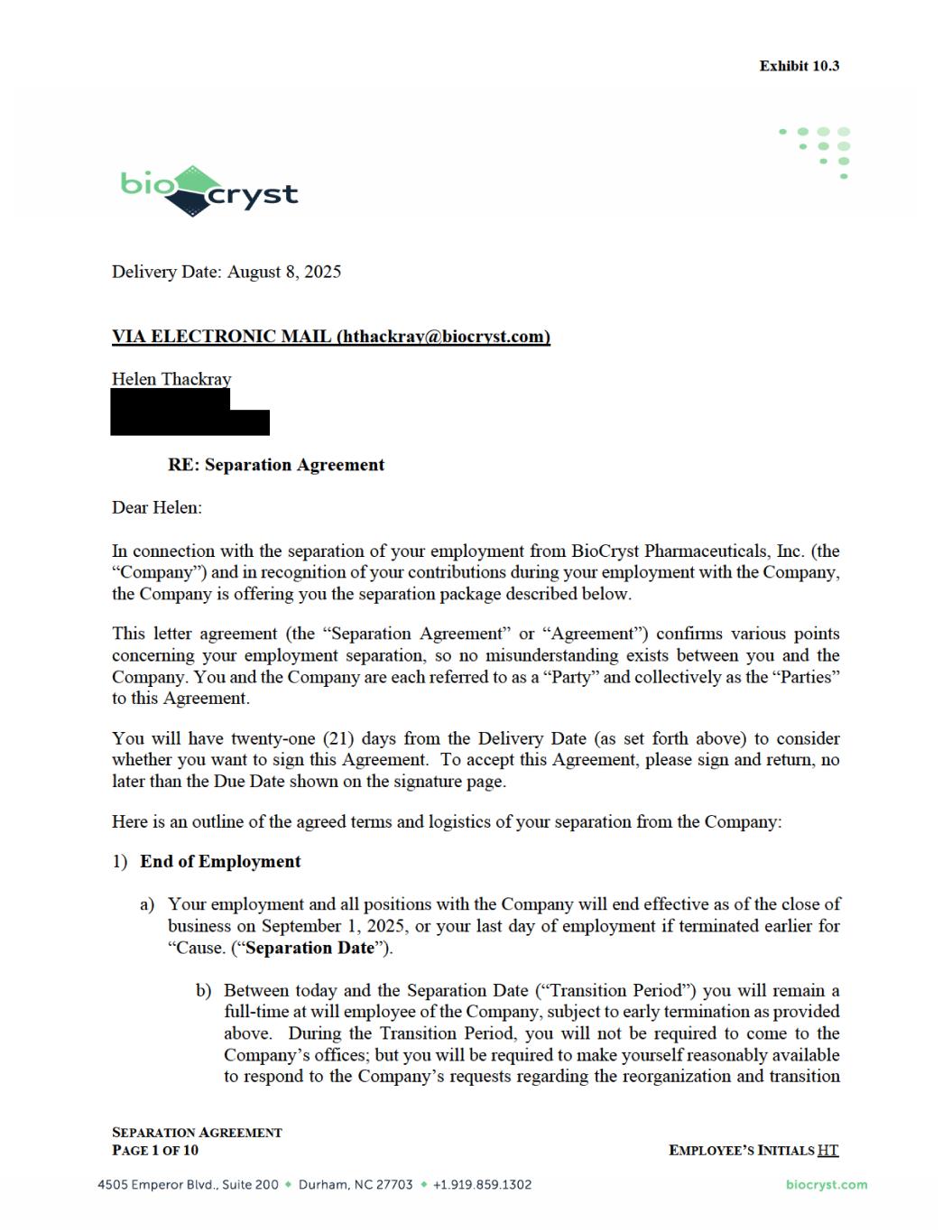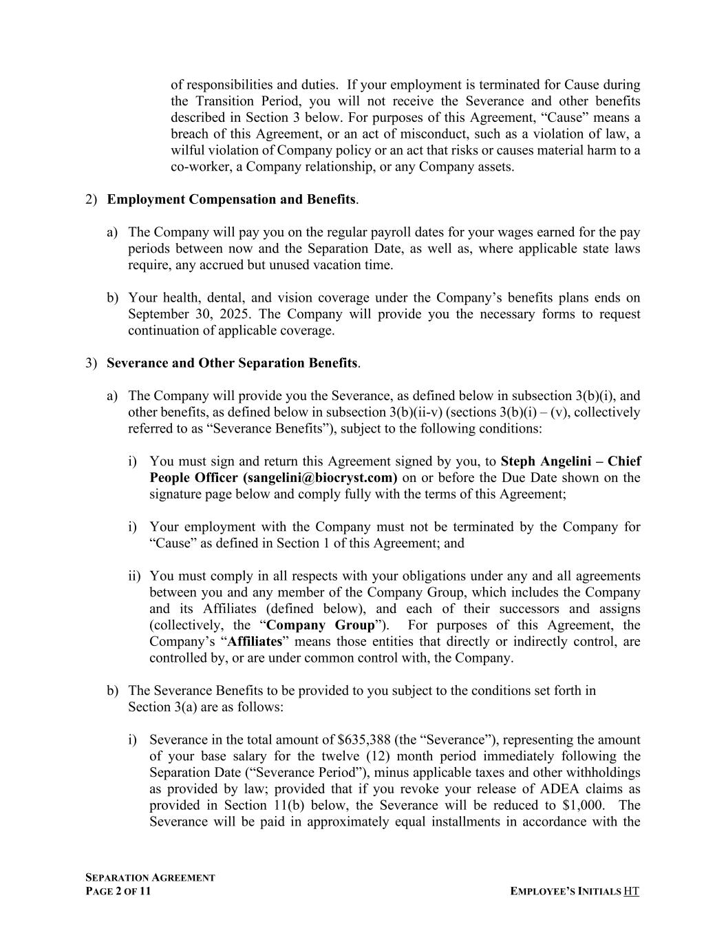 SEPARATION AGREEMENT PAGE 2 OF 11 EMPLOYEE’S INITIALS HT of responsibilities and duties. If your employment is terminated for Cause during the Transition Period, you will not receive the Severance and other benefits described in Section 3 below. For purposes of this Agreement, “Cause” means a breach of this Agreement, or an act of misconduct, such as a violation of law, a wilful violation of Company policy or an act that risks or causes material harm to a co-worker, a Company relationship, or any Company assets. 2) Employment Compensation and Benefits. a) The Company will pay you on the regular payroll dates for your wages earned for the pay periods between now and the Separation Date, as well as, where applicable state laws require, any accrued but unused vacation time. b) Your health, dental, and vision coverage under the Company’s benefits plans ends on September 30, 2025. The Company will provide you the necessary forms to request continuation of applicable coverage. 3) Severance and Other Separation Benefits. a) The Company will provide you the Severance, as defined below in subsection 3(b)(i), and other benefits, as defined below in subsection 3(b)(ii-v) (sections 3(b)(i) – (v), collectively referred to as “Severance Benefits”), subject to the following conditions: i) You must sign and return this Agreement signed by you, to Steph Angelini – Chief People Officer (sangelini@biocryst.com) on or before the Due Date shown on the signature page below and comply fully with the terms of this Agreement; i) Your employment with the Company must not be terminated by the Company for “Cause” as defined in Section 1 of this Agreement; and ii) You must comply in all respects with your obligations under any and all agreements between you and any member of the Company Group, which includes the Company and its Affiliates (defined below), and each of their successors and assigns (collectively, the “Company Group”). For purposes of this Agreement, the Company’s “Affiliates” means those entities that directly or indirectly control, are controlled by, or are under common control with, the Company. b) The Severance Benefits to be provided to you subject to the conditions set forth in Section 3(a) are as follows: i) Severance in the total amount of $635,388 (the “Severance”), representing the amount of your base salary for the twelve (12) month period immediately following the Separation Date (“Severance Period”), minus applicable taxes and other withholdings as provided by law; provided that if you revoke your release of ADEA claims as provided in Section 11(b) below, the Severance will be reduced to $1,000. The Severance will be paid in approximately equal installments in accordance with the