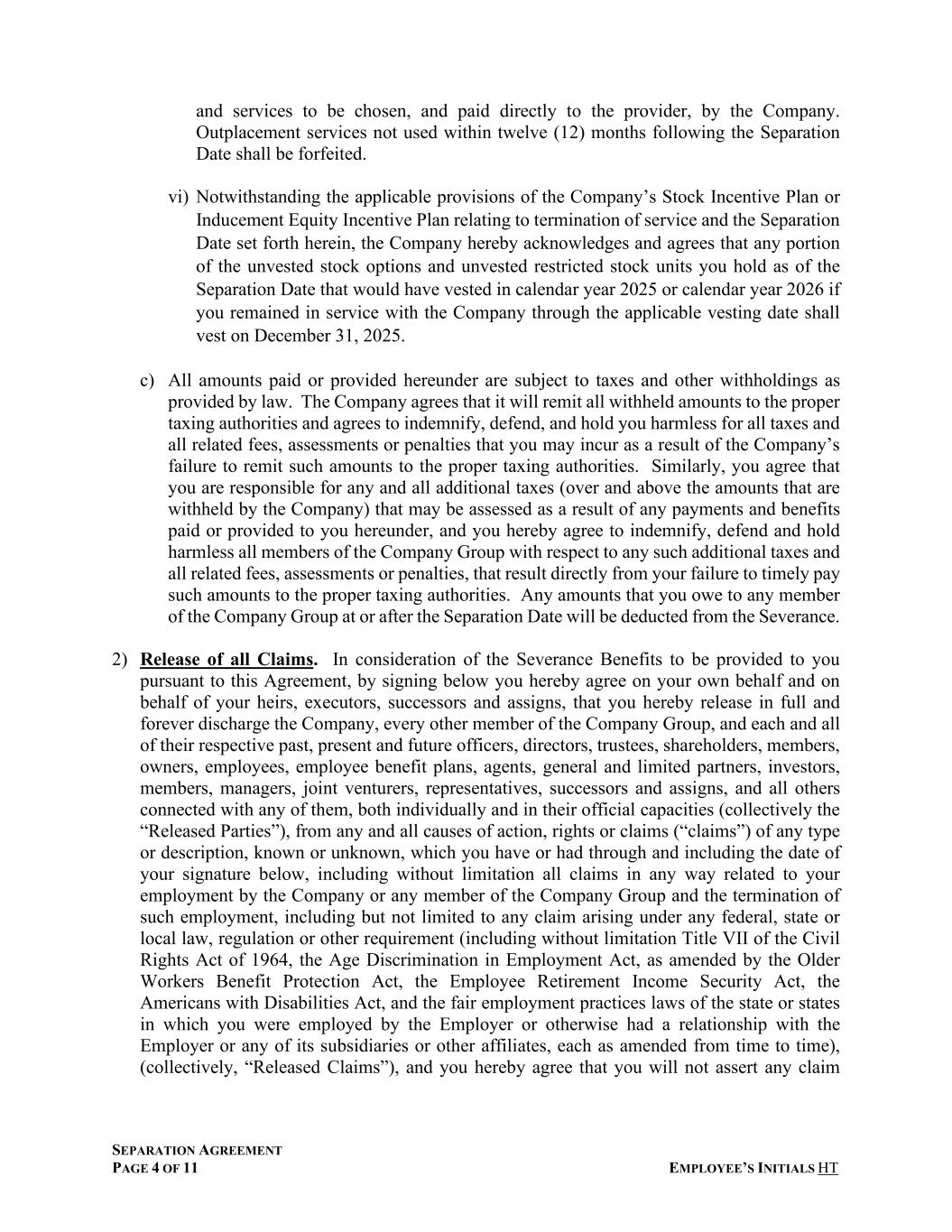 SEPARATION AGREEMENT PAGE 4 OF 11 EMPLOYEE’S INITIALS HT and services to be chosen, and paid directly to the provider, by the Company. Outplacement services not used within twelve (12) months following the Separation Date shall be forfeited. vi) Notwithstanding the applicable provisions of the Company’s Stock Incentive Plan or Inducement Equity Incentive Plan relating to termination of service and the Separation Date set forth herein, the Company hereby acknowledges and agrees that any portion of the unvested stock options and unvested restricted stock units you hold as of the Separation Date that would have vested in calendar year 2025 or calendar year 2026 if you remained in service with the Company through the applicable vesting date shall vest on December 31, 2025. c) All amounts paid or provided hereunder are subject to taxes and other withholdings as provided by law. The Company agrees that it will remit all withheld amounts to the proper taxing authorities and agrees to indemnify, defend, and hold you harmless for all taxes and all related fees, assessments or penalties that you may incur as a result of the Company’s failure to remit such amounts to the proper taxing authorities. Similarly, you agree that you are responsible for any and all additional taxes (over and above the amounts that are withheld by the Company) that may be assessed as a result of any payments and benefits paid or provided to you hereunder, and you hereby agree to indemnify, defend and hold harmless all members of the Company Group with respect to any such additional taxes and all related fees, assessments or penalties, that result directly from your failure to timely pay such amounts to the proper taxing authorities. Any amounts that you owe to any member of the Company Group at or after the Separation Date will be deducted from the Severance. 2) Release of all Claims. In consideration of the Severance Benefits to be provided to you pursuant to this Agreement, by signing below you hereby agree on your own behalf and on behalf of your heirs, executors, successors and assigns, that you hereby release in full and forever discharge the Company, every other member of the Company Group, and each and all of their respective past, present and future officers, directors, trustees, shareholders, members, owners, employees, employee benefit plans, agents, general and limited partners, investors, members, managers, joint venturers, representatives, successors and assigns, and all others connected with any of them, both individually and in their official capacities (collectively the “Released Parties”), from any and all causes of action, rights or claims (“claims”) of any type or description, known or unknown, which you have or had through and including the date of your signature below, including without limitation all claims in any way related to your employment by the Company or any member of the Company Group and the termination of such employment, including but not limited to any claim arising under any federal, state or local law, regulation or other requirement (including without limitation Title VII of the Civil Rights Act of 1964, the Age Discrimination in Employment Act, as amended by the Older Workers Benefit Protection Act, the Employee Retirement Income Security Act, the Americans with Disabilities Act, and the fair employment practices laws of the state or states in which you were employed by the Employer or otherwise had a relationship with the Employer or any of its subsidiaries or other affiliates, each as amended from time to time), (collectively, “Released Claims”), and you hereby agree that you will not assert any claim