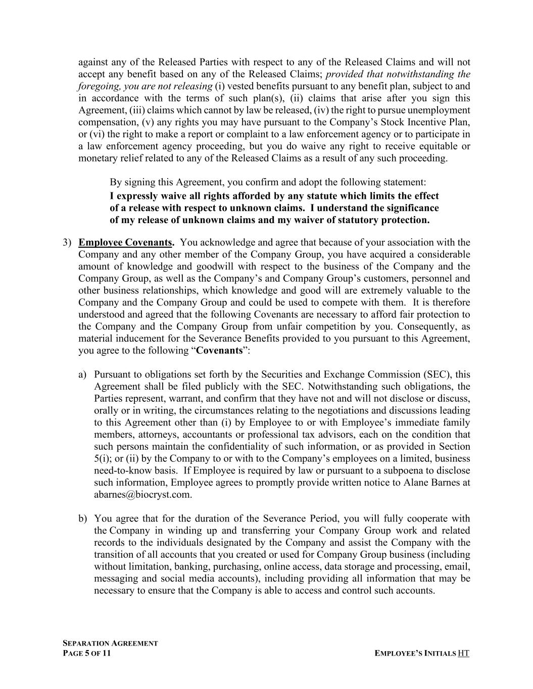 SEPARATION AGREEMENT PAGE 5 OF 11 EMPLOYEE’S INITIALS HT against any of the Released Parties with respect to any of the Released Claims and will not accept any benefit based on any of the Released Claims; provided that notwithstanding the foregoing, you are not releasing (i) vested benefits pursuant to any benefit plan, subject to and in accordance with the terms of such plan(s), (ii) claims that arise after you sign this Agreement, (iii) claims which cannot by law be released, (iv) the right to pursue unemployment compensation, (v) any rights you may have pursuant to the Company’s Stock Incentive Plan, or (vi) the right to make a report or complaint to a law enforcement agency or to participate in a law enforcement agency proceeding, but you do waive any right to receive equitable or monetary relief related to any of the Released Claims as a result of any such proceeding. By signing this Agreement, you confirm and adopt the following statement: I expressly waive all rights afforded by any statute which limits the effect of a release with respect to unknown claims. I understand the significance of my release of unknown claims and my waiver of statutory protection. 3) Employee Covenants. You acknowledge and agree that because of your association with the Company and any other member of the Company Group, you have acquired a considerable amount of knowledge and goodwill with respect to the business of the Company and the Company Group, as well as the Company’s and Company Group’s customers, personnel and other business relationships, which knowledge and good will are extremely valuable to the Company and the Company Group and could be used to compete with them. It is therefore understood and agreed that the following Covenants are necessary to afford fair protection to the Company and the Company Group from unfair competition by you. Consequently, as material inducement for the Severance Benefits provided to you pursuant to this Agreement, you agree to the following “Covenants”: a) Pursuant to obligations set forth by the Securities and Exchange Commission (SEC), this Agreement shall be filed publicly with the SEC. Notwithstanding such obligations, the Parties represent, warrant, and confirm that they have not and will not disclose or discuss, orally or in writing, the circumstances relating to the negotiations and discussions leading to this Agreement other than (i) by Employee to or with Employee’s immediate family members, attorneys, accountants or professional tax advisors, each on the condition that such persons maintain the confidentiality of such information, or as provided in Section 5(i); or (ii) by the Company to or with to the Company’s employees on a limited, business need-to-know basis. If Employee is required by law or pursuant to a subpoena to disclose such information, Employee agrees to promptly provide written notice to Alane Barnes at abarnes@biocryst.com. b) You agree that for the duration of the Severance Period, you will fully cooperate with the Company in winding up and transferring your Company Group work and related records to the individuals designated by the Company and assist the Company with the transition of all accounts that you created or used for Company Group business (including without limitation, banking, purchasing, online access, data storage and processing, email, messaging and social media accounts), including providing all information that may be necessary to ensure that the Company is able to access and control such accounts.