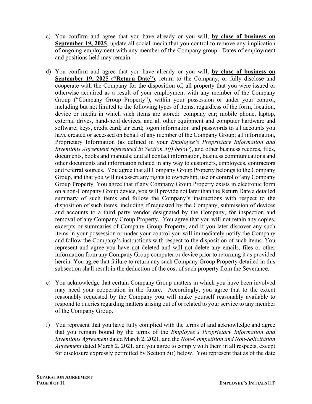 SEPARATION AGREEMENT PAGE 6 OF 11 EMPLOYEE’S INITIALS HT c) You confirm and agree that you have already or you will, by close of business on September 19, 2025, update all social media that you control to remove any implication of ongoing employment with any member of the Company group. Dates of employment and positions held may remain. d) You confirm and agree that you have already or you will, by close of business on September 19, 2025 (“Return Date”), return to the Company, or fully disclose and cooperate with the Company for the disposition of, all property that you were issued or otherwise acquired as a result of your employment with any member of the Company Group (“Company Group Property”), within your possession or under your control, including but not limited to the following types of items, regardless of the form, location, device or media in which such items are stored: company car; mobile phone, laptop, external drives, hand-held devices, and all other equipment and computer hardware and software; keys, credit card; air card; logon information and passwords to all accounts you have created or accessed on behalf of any member of the Company Group; all information, Proprietary Information (as defined in your Employee’s Proprietary Information and Inventions Agreement referenced in Section 5(f) below), and other business records, files, documents, books and manuals; and all contact information, business communications and other documents and information related in any way to customers, employees, contractors and referral sources. You agree that all Company Group Property belongs to the Company Group, and that you will not assert any rights to ownership, use or control of any Company Group Property. You agree that if any Company Group Property exists in electronic form on a non-Company Group device, you will provide not later than the Return Date a detailed summary of such items and follow the Company’s instructions with respect to the disposition of such items, including if requested by the Company, submission of devices and accounts to a third party vendor designated by the Company, for inspection and removal of any Company Group Property. You agree that you will not retain any copies, excerpts or summaries of Company Group Property, and if you later discover any such items in your possession or under your control you will immediately notify the Company and follow the Company’s instructions with respect to the disposition of such items. You represent and agree you have not deleted and will not delete any emails, files or other information from any Company Group computer or device prior to returning it as provided herein. You agree that failure to return any such Company Group Property detailed in this subsection shall result in the deduction of the cost of such property from the Severance. e) You acknowledge that certain Company Group matters in which you have been involved may need your cooperation in the future. Accordingly, you agree that to the extent reasonably requested by the Company you will make yourself reasonably available to respond to queries regarding matters arising out of or related to your service to any member of the Company Group. f) You represent that you have fully complied with the terms of and acknowledge and agree that you remain bound by the terms of the Employee’s Proprietary Information and Inventions Agreement dated March 2, 2021, and the Non-Competition and Non-Solicitation Agreement dated March 2, 2021, and you agree to comply with them in all respects, except for disclosure expressly permitted by Section 5(i) below. You represent that as of the date