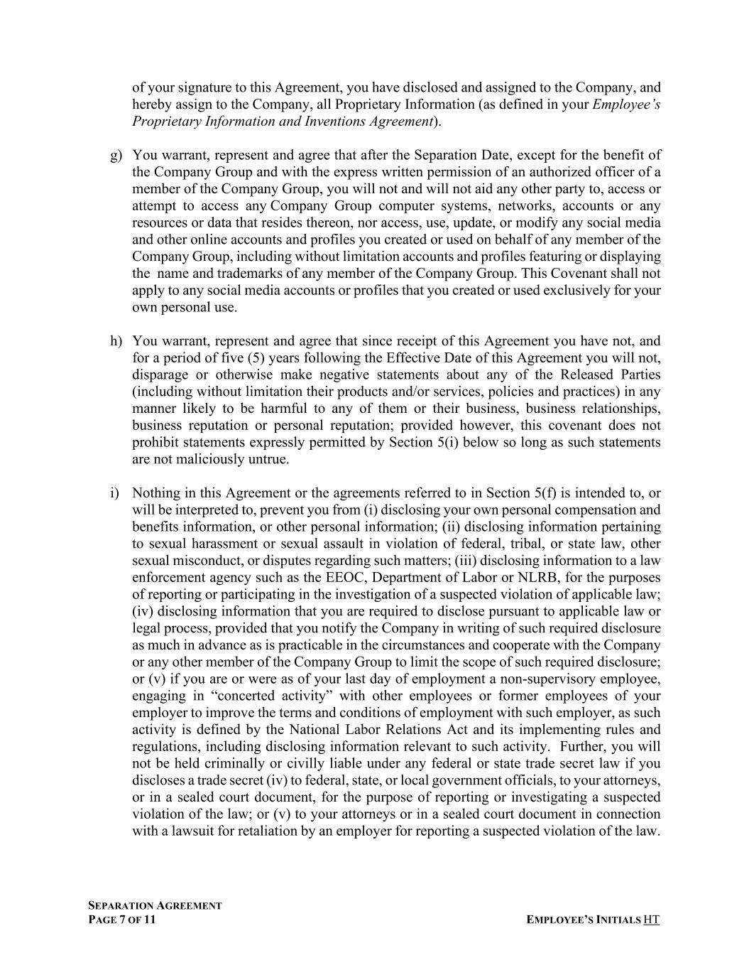 SEPARATION AGREEMENT PAGE 7 OF 11 EMPLOYEE’S INITIALS HT of your signature to this Agreement, you have disclosed and assigned to the Company, and hereby assign to the Company, all Proprietary Information (as defined in your Employee’s Proprietary Information and Inventions Agreement). g) You warrant, represent and agree that after the Separation Date, except for the benefit of the Company Group and with the express written permission of an authorized officer of a member of the Company Group, you will not and will not aid any other party to, access or attempt to access any Company Group computer systems, networks, accounts or any resources or data that resides thereon, nor access, use, update, or modify any social media and other online accounts and profiles you created or used on behalf of any member of the Company Group, including without limitation accounts and profiles featuring or displaying the name and trademarks of any member of the Company Group. This Covenant shall not apply to any social media accounts or profiles that you created or used exclusively for your own personal use. h) You warrant, represent and agree that since receipt of this Agreement you have not, and for a period of five (5) years following the Effective Date of this Agreement you will not, disparage or otherwise make negative statements about any of the Released Parties (including without limitation their products and/or services, policies and practices) in any manner likely to be harmful to any of them or their business, business relationships, business reputation or personal reputation; provided however, this covenant does not prohibit statements expressly permitted by Section 5(i) below so long as such statements are not maliciously untrue. i) Nothing in this Agreement or the agreements referred to in Section 5(f) is intended to, or will be interpreted to, prevent you from (i) disclosing your own personal compensation and benefits information, or other personal information; (ii) disclosing information pertaining to sexual harassment or sexual assault in violation of federal, tribal, or state law, other sexual misconduct, or disputes regarding such matters; (iii) disclosing information to a law enforcement agency such as the EEOC, Department of Labor or NLRB, for the purposes of reporting or participating in the investigation of a suspected violation of applicable law; (iv) disclosing information that you are required to disclose pursuant to applicable law or legal process, provided that you notify the Company in writing of such required disclosure as much in advance as is practicable in the circumstances and cooperate with the Company or any other member of the Company Group to limit the scope of such required disclosure; or (v) if you are or were as of your last day of employment a non-supervisory employee, engaging in “concerted activity” with other employees or former employees of your employer to improve the terms and conditions of employment with such employer, as such activity is defined by the National Labor Relations Act and its implementing rules and regulations, including disclosing information relevant to such activity. Further, you will not be held criminally or civilly liable under any federal or state trade secret law if you discloses a trade secret (iv) to federal, state, or local government officials, to your attorneys, or in a sealed court document, for the purpose of reporting or investigating a suspected violation of the law; or (v) to your attorneys or in a sealed court document in connection with a lawsuit for retaliation by an employer for reporting a suspected violation of the law.