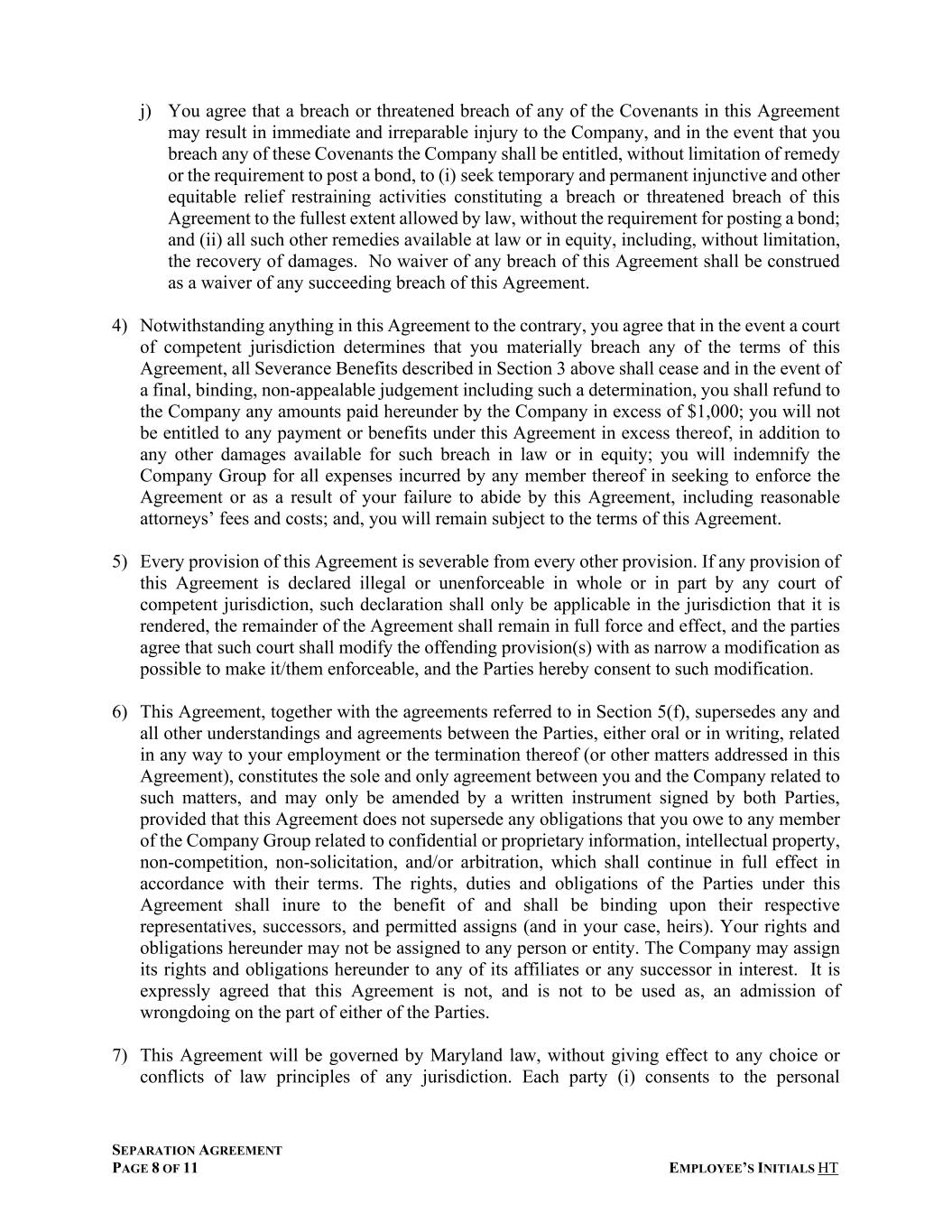 SEPARATION AGREEMENT PAGE 8 OF 11 EMPLOYEE’S INITIALS HT j) You agree that a breach or threatened breach of any of the Covenants in this Agreement may result in immediate and irreparable injury to the Company, and in the event that you breach any of these Covenants the Company shall be entitled, without limitation of remedy or the requirement to post a bond, to (i) seek temporary and permanent injunctive and other equitable relief restraining activities constituting a breach or threatened breach of this Agreement to the fullest extent allowed by law, without the requirement for posting a bond; and (ii) all such other remedies available at law or in equity, including, without limitation, the recovery of damages. No waiver of any breach of this Agreement shall be construed as a waiver of any succeeding breach of this Agreement. 4) Notwithstanding anything in this Agreement to the contrary, you agree that in the event a court of competent jurisdiction determines that you materially breach any of the terms of this Agreement, all Severance Benefits described in Section 3 above shall cease and in the event of a final, binding, non-appealable judgement including such a determination, you shall refund to the Company any amounts paid hereunder by the Company in excess of $1,000; you will not be entitled to any payment or benefits under this Agreement in excess thereof, in addition to any other damages available for such breach in law or in equity; you will indemnify the Company Group for all expenses incurred by any member thereof in seeking to enforce the Agreement or as a result of your failure to abide by this Agreement, including reasonable attorneys’ fees and costs; and, you will remain subject to the terms of this Agreement. 5) Every provision of this Agreement is severable from every other provision. If any provision of this Agreement is declared illegal or unenforceable in whole or in part by any court of competent jurisdiction, such declaration shall only be applicable in the jurisdiction that it is rendered, the remainder of the Agreement shall remain in full force and effect, and the parties agree that such court shall modify the offending provision(s) with as narrow a modification as possible to make it/them enforceable, and the Parties hereby consent to such modification. 6) This Agreement, together with the agreements referred to in Section 5(f), supersedes any and all other understandings and agreements between the Parties, either oral or in writing, related in any way to your employment or the termination thereof (or other matters addressed in this Agreement), constitutes the sole and only agreement between you and the Company related to such matters, and may only be amended by a written instrument signed by both Parties, provided that this Agreement does not supersede any obligations that you owe to any member of the Company Group related to confidential or proprietary information, intellectual property, non-competition, non-solicitation, and/or arbitration, which shall continue in full effect in accordance with their terms. The rights, duties and obligations of the Parties under this Agreement shall inure to the benefit of and shall be binding upon their respective representatives, successors, and permitted assigns (and in your case, heirs). Your rights and obligations hereunder may not be assigned to any person or entity. The Company may assign its rights and obligations hereunder to any of its affiliates or any successor in interest. It is expressly agreed that this Agreement is not, and is not to be used as, an admission of wrongdoing on the part of either of the Parties. 7) This Agreement will be governed by Maryland law, without giving effect to any choice or conflicts of law principles of any jurisdiction. Each party (i) consents to the personal