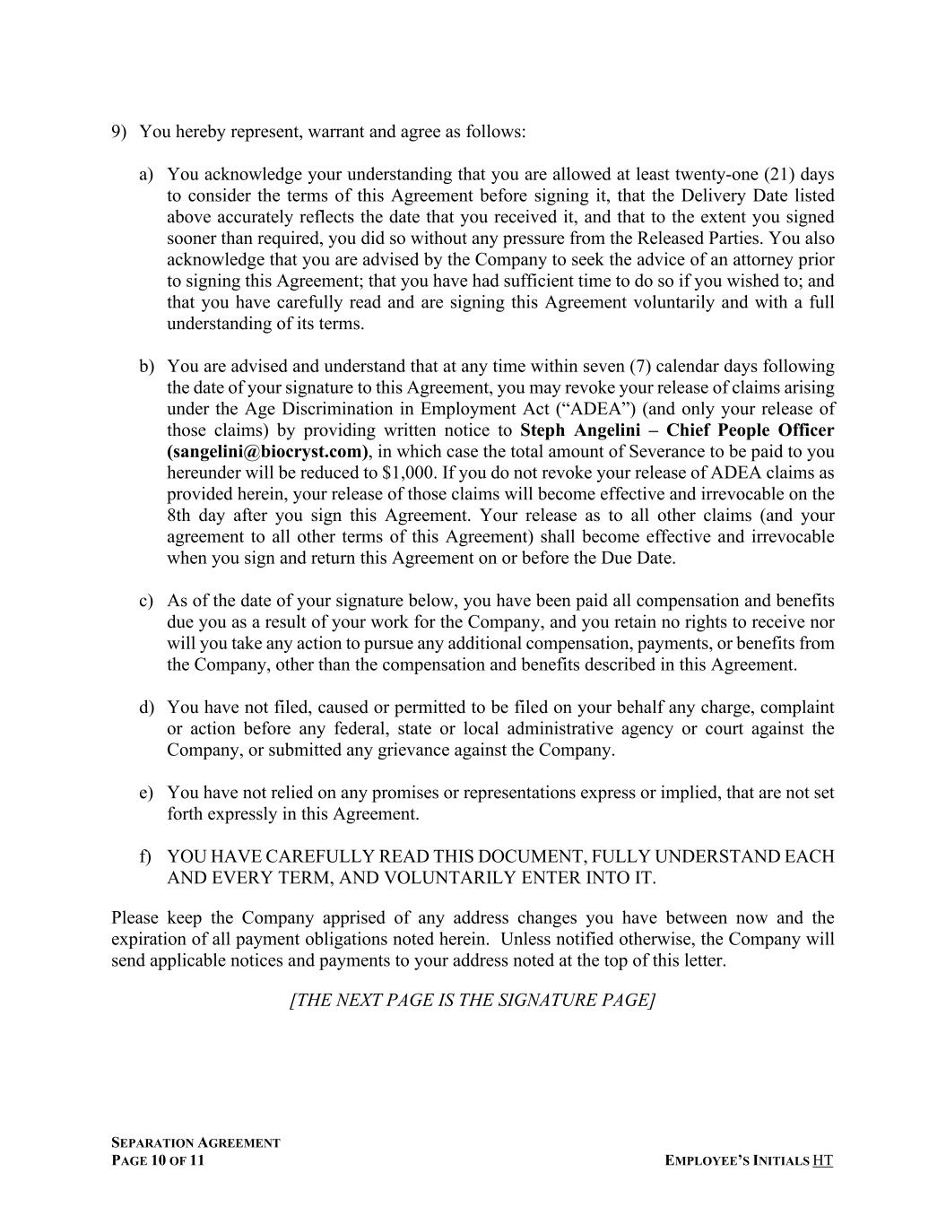 SEPARATION AGREEMENT PAGE 10 OF 11 EMPLOYEE’S INITIALS HT 9) You hereby represent, warrant and agree as follows: a) You acknowledge your understanding that you are allowed at least twenty-one (21) days to consider the terms of this Agreement before signing it, that the Delivery Date listed above accurately reflects the date that you received it, and that to the extent you signed sooner than required, you did so without any pressure from the Released Parties. You also acknowledge that you are advised by the Company to seek the advice of an attorney prior to signing this Agreement; that you have had sufficient time to do so if you wished to; and that you have carefully read and are signing this Agreement voluntarily and with a full understanding of its terms. b) You are advised and understand that at any time within seven (7) calendar days following the date of your signature to this Agreement, you may revoke your release of claims arising under the Age Discrimination in Employment Act (“ADEA”) (and only your release of those claims) by providing written notice to Steph Angelini – Chief People Officer (sangelini@biocryst.com), in which case the total amount of Severance to be paid to you hereunder will be reduced to $1,000. If you do not revoke your release of ADEA claims as provided herein, your release of those claims will become effective and irrevocable on the 8th day after you sign this Agreement. Your release as to all other claims (and your agreement to all other terms of this Agreement) shall become effective and irrevocable when you sign and return this Agreement on or before the Due Date. c) As of the date of your signature below, you have been paid all compensation and benefits due you as a result of your work for the Company, and you retain no rights to receive nor will you take any action to pursue any additional compensation, payments, or benefits from the Company, other than the compensation and benefits described in this Agreement. d) You have not filed, caused or permitted to be filed on your behalf any charge, complaint or action before any federal, state or local administrative agency or court against the Company, or submitted any grievance against the Company. e) You have not relied on any promises or representations express or implied, that are not set forth expressly in this Agreement. f) YOU HAVE CAREFULLY READ THIS DOCUMENT, FULLY UNDERSTAND EACH AND EVERY TERM, AND VOLUNTARILY ENTER INTO IT. Please keep the Company apprised of any address changes you have between now and the expiration of all payment obligations noted herein. Unless notified otherwise, the Company will send applicable notices and payments to your address noted at the top of this letter. [THE NEXT PAGE IS THE SIGNATURE PAGE]