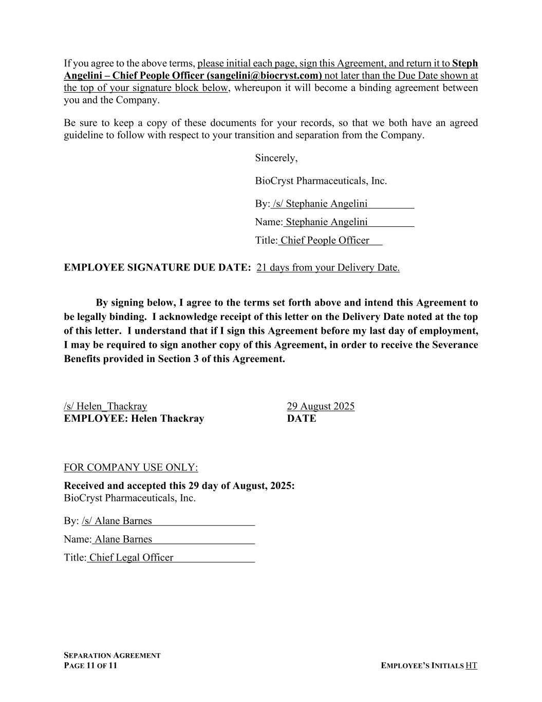 SEPARATION AGREEMENT PAGE 11 OF 11 EMPLOYEE’S INITIALS HT If you agree to the above terms, please initial each page, sign this Agreement, and return it to Steph Angelini – Chief People Officer (sangelini@biocryst.com) not later than the Due Date shown at the top of your signature block below, whereupon it will become a binding agreement between you and the Company. Be sure to keep a copy of these documents for your records, so that we both have an agreed guideline to follow with respect to your transition and separation from the Company. Sincerely, BioCryst Pharmaceuticals, Inc. By: /s/ Stephanie Angelini Name: Stephanie Angelini Title: Chief People Officer EMPLOYEE SIGNATURE DUE DATE: 21 days from your Delivery Date. By signing below, I agree to the terms set forth above and intend this Agreement to be legally binding. I acknowledge receipt of this letter on the Delivery Date noted at the top of this letter. I understand that if I sign this Agreement before my last day of employment, I may be required to sign another copy of this Agreement, in order to receive the Severance Benefits provided in Section 3 of this Agreement. /s/ Helen_Thackray 29 August 2025 EMPLOYEE: Helen Thackray DATE FOR COMPANY USE ONLY: Received and accepted this 29 day of August, 2025: BioCryst Pharmaceuticals, Inc. By: /s/ Alane Barnes Name: Alane Barnes Title: Chief Legal Officer