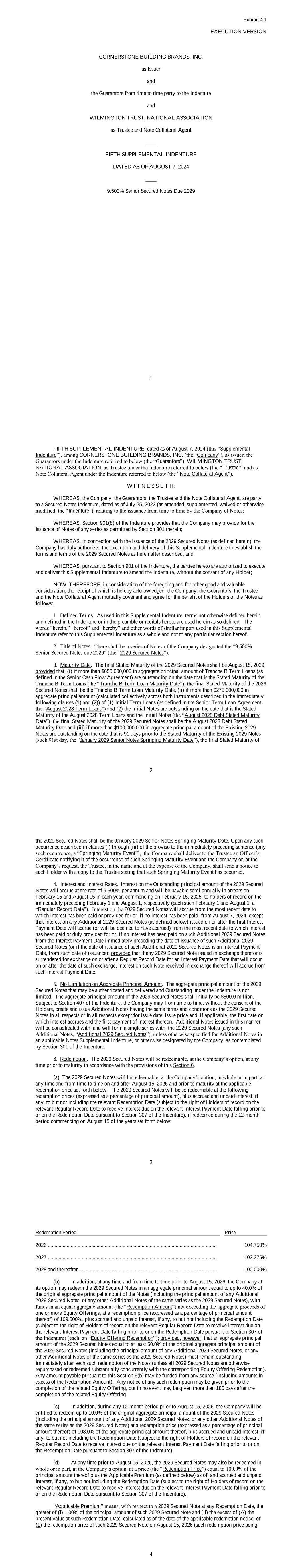 Exhibit 4.1 EXECUTION VERSION 1 CORNERSTONE BUILDING BRANDS, INC. as Issuer and the Guarantors from time to time party to the Indenture and WILMINGTON TRUST, NATIONAL ASSOCIATION as Trustee and Note Collateral Agent ____ FIFTH SUPPLEMENTAL INDENTURE DATED AS OF AUGUST 7, 2024 ____ 9.500% Senior Secured Notes Due 2029 2 FIFTH SUPPLEMENTAL INDENTURE, dated as of August 7, 2024 (this “Supplemental Indenture”), among CORNERSTONE BUILDING BRANDS, INC. (the “Company”), as issuer, the Guarantors under the Indenture referred to below (the “Guarantors”), WILMINGTON TRUST, NATIONAL ASSOCIATION, as Trustee under the Indenture referred to below (the “Trustee”) and as Note Collateral Agent under the Indenture referred to below (the “Note Collateral Agent”). W I T N E S S E T H: WHEREAS, the Company, the Guarantors, the Trustee and the Note Collateral Agent, are party to a Secured Notes Indenture, dated as of July 25, 2022 (as amended, supplemented, waived or otherwise modified, the “Indenture”), relating to the issuance from time to time by the Company of Notes; WHEREAS, Section 901(8) of the Indenture provides that the Company may provide for the issuance of Notes of any series as permitted by Section 301 therein; WHEREAS, in connection with the issuance of the 2029 Secured Notes (as defined herein), the Company has duly authorized the execution and delivery of this Supplemental Indenture to establish the forms and terms of the 2029 Secured Notes as hereinafter described; and WHEREAS, pursuant to Section 901 of the Indenture, the parties hereto are authorized to execute and deliver this Supplemental Indenture to amend the Indenture, without the consent of any Holder; NOW, THEREFORE, in consideration of the foregoing and for other good and valuable consideration, the receipt of which is hereby acknowledged, the Company, the Guarantors, the Trustee and the Note Collateral Agent mutually covenant and agree for the benefit of the Holders of the Notes as follows: 1. Defined Terms. As used in this Supplemental Indenture, terms not otherwise defined herein and defined in the Indenture or in the preamble or recitals hereto are used herein as so defined. The words “herein,” “hereof” and “hereby” and other words of similar import used in this Supplemental Indenture refer to this Supplemental Indenture as a whole and not to any particular section hereof. 2. Title of Notes. There shall be a series of Notes of the Company designated the “9.500% Senior Secured Notes due 2029” (the “2029 Secured Notes”). 3. Maturity Date. The final Stated Maturity of the 2029 Secured Notes shall be August 15, 2029; provided that, (i) if more than $650,000,000 in aggregate principal amount of Tranche B Term Loans (as defined in the Senior Cash Flow Agreement) are outstanding on the date that is the Stated Maturity of the Tranche B Term Loans (the “Tranche B Term Loan Maturity Date”), the final Stated Maturity of the 2029 Secured Notes shall be the Tranche B Term Loan Maturity Date, (ii) if more than $275,000,000 in aggregate principal amount (calculated collectively across both instruments described in the immediately following clauses (1) and (2)) of (1) Initial Term Loans (as defined in the Senior Term Loan Agreement, the “August 2028 Term Loans”) and (2) the Initial Notes are outstanding on the date that is the Stated Maturity of the August 2028 Term Loans and the Initial Notes (the “August 2028 Debt Stated Maturity Date”), the final Stated Maturity of the 2029 Secured Notes shall be the August 2028 Debt Stated Maturity Date and (iii) if more than $100,000,000 in aggregate principal amount of the Existing 2029 Notes are outstanding on the date that is 91 days prior to the Stated Maturity of the Existing 2029 Notes (such 91st day, the “January 2029 Senior Notes Springing Maturity Date”), the final Stated Maturity of 3 the 2029 Secured Notes shall be the January 2029 Senior Notes Springing Maturity Date. Upon any such occurrence described in clauses (i) through (iii) of the proviso to the immediately preceding sentence (any such occurrence, a “Springing Maturity Event”), the Company shall deliver to the Trustee an Officer’s Certificate notifying it of the occurrence of such Springing Maturity Event and the Company or, at the Company’s request, the Trustee, in the name and at the expense of the Company, shall send a notice to each Holder with a copy to the Trustee stating that such Springing Maturity Event has occurred. 4. Interest and Interest Rates. Interest on the Outstanding principal amount of the 2029 Secured Notes will accrue at the rate of 9.500% per annum and will be payable semi-annually in arrears on February 15 and August 15 in each year, commencing on February 15, 2025, to holders of record on the immediately preceding February 1 and August 1, respectively (each such February 1 and August 1, a “Regular Record Date”). Interest on the 2029 Secured Notes will accrue from the most recent date to which interest has been paid or provided for or, if no interest has been paid, from August 7, 2024, except that interest on any Additional 2029 Secured Notes (as defined below) issued on or after the first Interest Payment Date will accrue (or will be deemed to have accrued) from the most recent date to which interest has been paid or duly provided for or, if no interest has been paid on such Additional 2029 Secured Notes, from the Interest Payment Date immediately preceding the date of issuance of such Additional 2029 Secured Notes (or if the date of issuance of such Additional 2029 Secured Notes is an Interest Payment Date, from such date of issuance); provided that if any 2029 Secured Note issued in exchange therefor is surrendered for exchange on or after a Regular Record Date for an Interest Payment Date that will occur on or after the date of such exchange, interest on such Note received in exchange thereof will accrue from such Interest Payment Date. 5. 