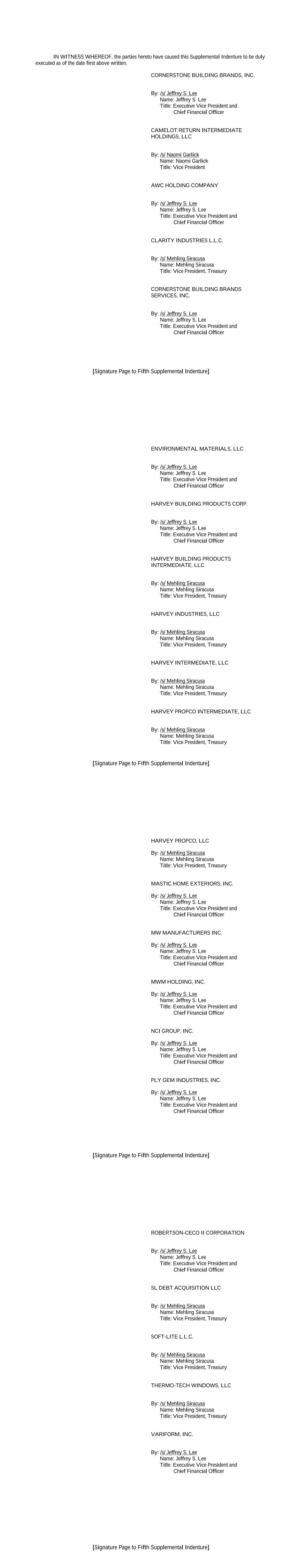 [Signature Page to Fifth Supplemental Indenture] IN WITNESS WHEREOF, the parties hereto have caused this Supplemental Indenture to be duly executed as of the date first above written. CORNERSTONE BUILDING BRANDS, INC. By: /s/ Jeffrey S. Lee Name: Jeffrey S. Lee Title: Executive Vice President and Chief Financial Officer CAMELOT RETURN INTERMEDIATE HOLDINGS, LLC By: /s/ Naomi Garlick Name: Naomi Garlick Title: Vice President AWC HOLDING COMPANY By: /s/ Jeffrey S. Lee Name: Jeffrey S. Lee Title: Executive Vice President and Chief Financial Officer CLARITY INDUSTRIES L.L.C. By: /s/ Mehling Siracusa Name: Mehling Siracusa Title: Vice President, Treasury CORNERSTONE BUILDING BRANDS SERVICES, INC. By: /s/ Jeffrey S. Lee Name: Jeffrey S. Lee Title: Executive Vice President and Chief Financial Officer [Signature Page to Fifth Supplemental Indenture] ENVIRONMENTAL MATERIALS, LLC By: /s/ Jeffrey S. Lee Name: Jeffrey S. Lee Title: Executive Vice President and Chief Financial Officer HARVEY BUILDING PRODUCTS CORP. By: /s/ Jeffrey S. Lee Name: Jeffrey S. Lee Title: Executive Vice President and Chief Financial Officer HARVEY BUILDING PRODUCTS INTERMEDIATE, LLC By: /s/ Mehling Siracusa Name: Mehling Siracusa Title: Vice President, Treasury HARVEY INDUSTRIES, LLC By: /s/ Mehling Siracusa Name: Mehling Siracusa Title: Vice President, Treasury HARVEY INTERMEDIATE, LLC By: /s/ Mehling Siracusa Name: Mehling Siracusa Title: Vice President, Treasury HARVEY PROPCO INTERMEDIATE, LLC By: /s/ Mehling Siracusa Name: Mehling Siracusa Title: Vice President, Treasury [Signature Page to Fifth Supplemental Indenture] HARVEY PROPCO, LLC By: /s/ Mehling Siracusa Name: Mehling Siracusa Title: Vice President, Treasury MASTIC HOME EXTERIORS, INC. By: /s/ Jeffrey S. Lee Name: Jeffrey S. Lee Title: Executive Vice President and Chief Financial Officer MW MANUFACTURERS INC. By: /s/ Jeffrey S. Lee Name: Jeffrey S. Lee Title: Executive Vice President and Chief Financial Officer MWM HOLDING, INC. By: /s/ Jeffrey S. Lee Name: Jeffrey S. Lee Title: Executive Vice President and Chief Financial Officer NCI GROUP, INC. By: /s/ Jeffrey S. Lee Name: Jeffrey S. Lee Title: Executive Vice President and Chief Financial Officer PLY GEM INDUSTRIES, INC. By: /s/ Jeffrey S. Lee Name: Jeffrey S. Lee Title: Executive Vice President and Chief Financial Officer [Signature Page to Fifth Supplemental Indenture] ROBERTSON-CECO II CORPORATION By: /s/ Jeffrey S. Lee Name: Jeffrey S. Lee Title: Executive Vice President and Chief Financial Officer SL DEBT ACQUISITION LLC By: /s/ Mehling Siracusa Name: Mehling Siracusa Title: Vice President, Treasury SOFT-LITE L.L.C. By: /s/ Mehling Siracusa Name: Mehling Siracusa Title: Vice President, Treasury THERMO-TECH WINDOWS, LLC By: /s/ Mehling Siracusa Name: Mehling Siracusa Title: Vice President, Treasury VARIFORM, INC. By: /s/ Jeffrey S. Lee Name: Jeffrey S. Lee Title: Executive Vice President and Chief Financial Officer