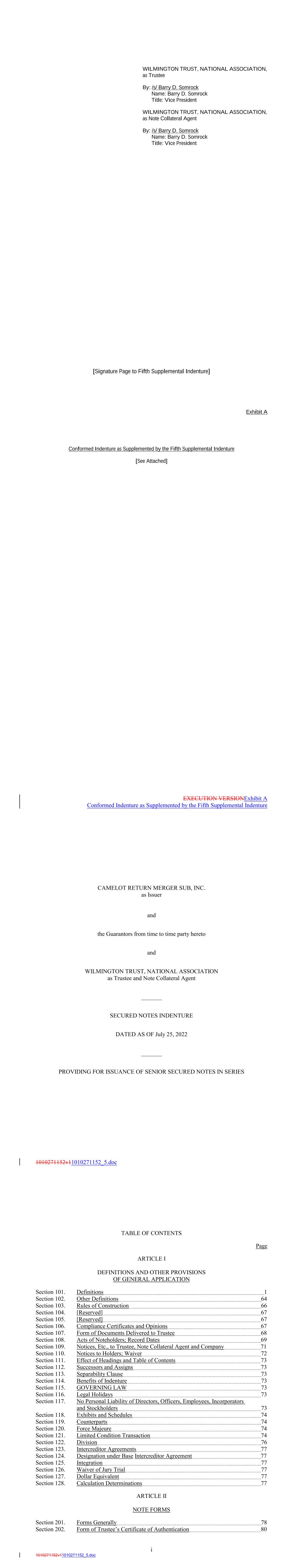 [Signature Page to Fifth Supplemental Indenture] WILMINGTON TRUST, NATIONAL ASSOCIATION, as Trustee By: /s/ Barry D. Somrock Name: Barry D. Somrock Title: Vice President WILMINGTON TRUST, NATIONAL ASSOCIATION, as Note Collateral Agent By: /s/ Barry D. Somrock Name: Barry D. Somrock Title: Vice President Exhibit A Conformed Indenture as Supplemented by the Fifth Supplemental Indenture [See Attached] EXECUTION VERSIONExhibit A Conformed Indenture as Supplemented by the Fifth Supplemental Indenture CAMELOT RETURN MERGER SUB, INC. as Issuer and the Guarantors from time to time party hereto and WILMINGTON TRUST, NATIONAL ASSOCIATION as Trustee and Note Collateral Agent _______ SECURED NOTES INDENTURE DATED AS OF July 25, 2022 _______ PROVIDING FOR ISSUANCE OF SENIOR SECURED NOTES IN SERIES 1010271152v11010271152_5.doc TABLE OF CONTENTS Page ARTICLE I DEFINITIONS AND OTHER PROVISIONS OF GENERAL APPLICATION Section 101. Definitions 1 Section 102. Other Definitions 64 Section 103. Rules of Construction 66 Section 104. [Reserved] 67 Section 105. [Reserved] 67 Section 106. Compliance Certificates and Opinions 67 Section 107. Form of Documents Delivered to Trustee 68 Section 108. Acts of Noteholders; Record Dates 69 Section 109. Notices, Etc., to Trustee, Note Collateral Agent and Company 71 Section 110. Notices to Holders; Waiver 72 Section 111. Effect of Headings and Table of Contents 73 Section 112. Successors and Assigns 73 Section 113. Separability Clause 73 Section 114. Benefits of Indenture 73 Section 115. GOVERNING LAW 73 Section 116. Legal Holidays 73 Section 117. No Personal Liability of Directors, Officers, Employees, Incorporators and Stockholders 73 Section 118. Exhibits and Schedules 74 Section 119. Counterparts 74 Section 120. Force Majeure 74 Section 121. Limited Condition Transaction 74 Section 122. Division 76 Section 123. Intercreditor Agreements 77 Section 124. Designation under Base Intercreditor Agreement 77 Section 125. Integration 77 Section 126. Waiver of Jury Trial 77 Section 127. Dollar Equivalent 77 Section 128. Calculation Determinations 77 ARTICLE II NOTE FORMS Section 201. Forms Generally 78 Section 202. Form of Trustee’s Certificate of Authentication 80 i 1010271152v11010271152_5.doc