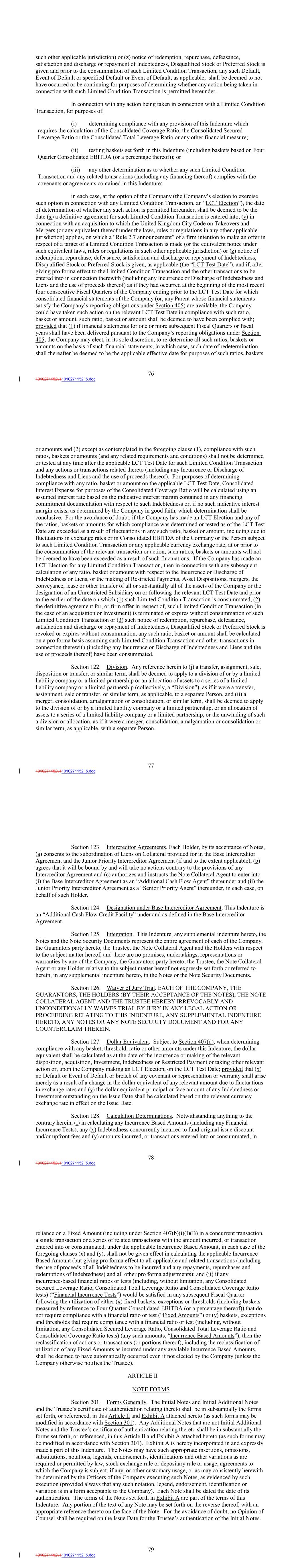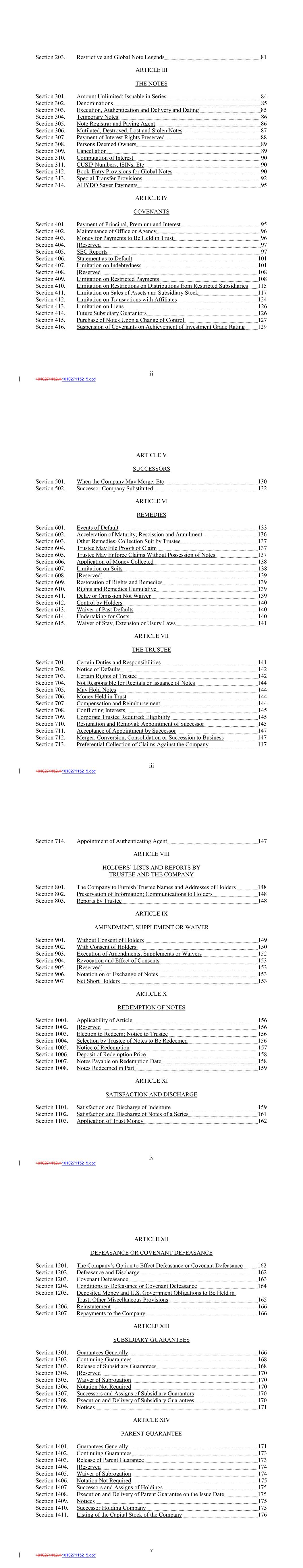 Section 203. Restrictive and Global Note Legends 81 ARTICLE III THE NOTES Section 301. Amount Unlimited; Issuable in Series 84 Section 302. Denominations 85 Section 303. Execution, Authentication and Delivery and Dating 85 Section 304. Temporary Notes 86 Section 305. Note Registrar and Paying Agent 86 Section 306. Mutilated, Destroyed, Lost and Stolen Notes 87 Section 307. Payment of Interest Rights Preserved 88 Section 308. Persons Deemed Owners 89 Section 309. Cancellation 89 Section 310. Computation of Interest 90 Section 311. CUSIP Numbers, ISINs, Etc 90 Section 312. Book-Entry Provisions for Global Notes 90 Section 313. Special Transfer Provisions 92 Section 314. AHYDO Saver Payments 95 ARTICLE IV COVENANTS Section 401. Payment of Principal, Premium and Interest 95 Section 402. Maintenance of Office or Agency 96 Section 403. Money for Payments to Be Held in Trust 96 Section 404. [Reserved] 97 Section 405. SEC Reports 97 Section 406. Statement as to Default 101 Section 407. Limitation on Indebtedness 101 Section 408. [Reserved] 108 Section 409. Limitation on Restricted Payments 108 Section 410. Limitation on Restrictions on Distributions from Restricted Subsidiaries 115 Section 411. Limitation on Sales of Assets and Subsidiary Stock 117 Section 412. Limitation on Transactions with Affiliates 124 Section 413. Limitation on Liens 126 Section 414. Future Subsidiary Guarantors 126 Section 415. Purchase of Notes Upon a Change of Control 127 Section 416. Suspension of Covenants on Achievement of Investment Grade Rating 129 ii 1010271152v11010271152_5.doc ARTICLE V SUCCESSORS Section 501. When the Company May Merge, Etc 130 Section 502. Successor Company Substituted 132 ARTICLE VI REMEDIES Section 601. Events of Default 133 Section 602. Acceleration of Maturity; Rescission and Annulment 136 Section 603. Other Remedies; Collection Suit by Trustee 137 Section 604. Trustee May File Proofs of Claim 137 Section 605. Trustee May Enforce Claims Without Possession of Notes 137 Section 606. Application of Money Collected 138 Section 607. Limitation on Suits 138 Section 608. [Reserved] 139 Section 609. Restoration of Rights and Remedies 139 Section 610. Rights and Remedies Cumulative 139 Section 611. Delay or Omission Not Waiver 139 Section 612. Control by Holders 140 Section 613. Waiver of Past Defaults 140 Section 614. Undertaking for Costs 140 Section 615. Waiver of Stay, Extension or Usury Laws 141 ARTICLE VII THE TRUSTEE Section 701. Certain Duties and Responsibilities 141 Section 702. Notice of Defaults 142 Section 703. Certain Rights of Trustee 142 Section 704. Not Responsible for Recitals or Issuance of Notes 144 Section 705. May Hold Notes 144 Section 706. Money Held in Trust 144 Section 707. Compensation and Reimbursement 144 Section 708. Conflicting Interests 145 Section 709. Corporate Trustee Required; Eligibility 145 Section 710. Resignation and Removal; Appointment of Successor 145 Section 711. Acceptance of Appointment by Successor 147 Section 712. Merger, Conversion, Consolidation or Succession to Business 147 Section 713. Preferential Collection of Claims Against the Company 147 iii 1010271152v11010271152_5.doc Section 714. Appointment of Authenticating Agent 147 ARTICLE VIII HOLDERS’ LISTS AND REPORTS BY TRUSTEE AND THE COMPANY Section 801. The Company to Furnish Trustee Names and Addresses of Holders 148 Section 802. Preservation of Information; Communications to Holders 148 Section 803. Reports by Trustee 148 ARTICLE IX AMENDMENT, SUPPLEMENT OR WAIVER Section 901. Without Consent of Holders 149 Section 902. With Consent of Holders 150 Section 903. Execution of Amendments, Supplements or Waivers 152 Section 904. Revocation and Effect of Consents 153 Section 905. [Reserved] 153 Section 906. Notation on or Exchange of Notes 153 Section 907 Net Short Holders 153 ARTICLE X REDEMPTION OF NOTES Section 1001. Applicability of Article 156 Section 1002. [Reserved] 156 Section 1003. Election to Redeem; Notice to Trustee 156 Section 1004. Selection by Trustee of Notes to Be Redeemed 156 Section 1005. Notice of Redemption 157 Section 1006. Deposit of Redemption Price 158 Section 1007. Notes Payable on Redemption Date 158 Section 1008. Notes Redeemed in Part 159 ARTICLE XI SATISFACTION AND DISCHARGE Section 1101. Satisfaction and Discharge of Indenture 159 Section 1102. Satisfaction and Discharge of Notes of a Series 161 Section 1103. Application of Trust Money 162 iv 1010271152v11010271152_5.doc ARTICLE XII DEFEASANCE OR COVENANT DEFEASANCE Section 1201. The Company’s Option to Effect Defeasance or Covenant Defeasance 162 Section 1202. Defeasance and Discharge 162 Section 1203. Covenant Defeasance 163 Section 1204. Conditions to Defeasance or Covenant Defeasance 164 Section 1205. Deposited Money and U.S. Government Obligations to Be Held in Trust; Other Miscellaneous Provisions 165 Section 1206. Reinstatement 166 Section 1207. Repayments to the Company 166 ARTICLE XIII SUBSIDIARY GUARANTEES Section 1301. Guarantees Generally 166 Section 1302. Continuing Guarantees 168 Section 1303. Release of Subsidiary Guarantees 168 Section 1304. [Reserved] 170 Section 1305. Waiver of Subrogation 170 Section 1306. Notation Not Required 170 Section 1307. Successors and Assigns of Subsidiary Guarantors 170 Section 1308. Execution and Delivery of Subsidiary Guarantees 170 Section 1309. Notices 171 ARTICLE XIV PARENT GUARANTEE Section 1401. Guarantees Generally 171 Section 1402. Continuing Guarantees 173 Section 1403. Release of Parent Guarantee 173 Section 1404. [Reserved] 174 Section 1405. Waiver of Subrogation 174 Section 1406. Notation Not Required 175 Section 1407. Successors and Assigns of Holdings 175 Section 1408. Execution and Delivery of Parent Guarantee on the Issue Date 175 Section 1409. Notices 175 Section 1410. Successor Holding Company 175 Section 1411. Listing of the Capital Stock of the Company 176 v 1010271152v11010271152_5.doc