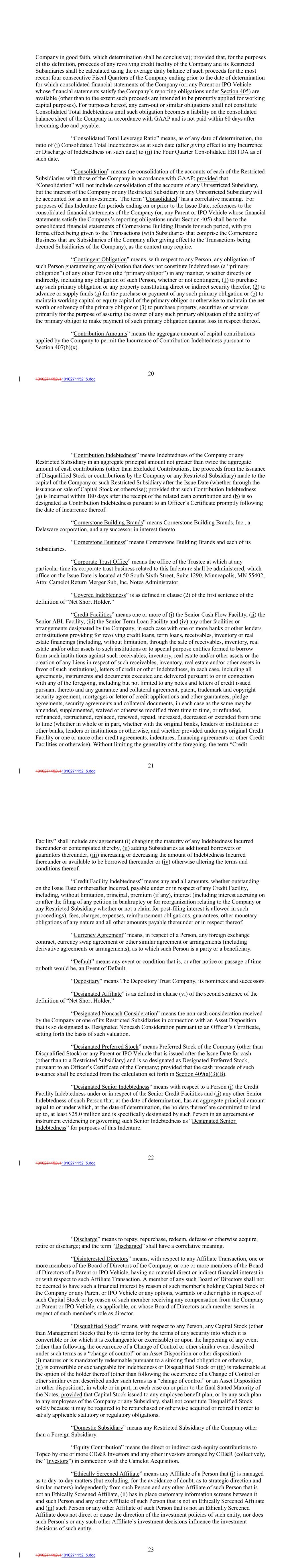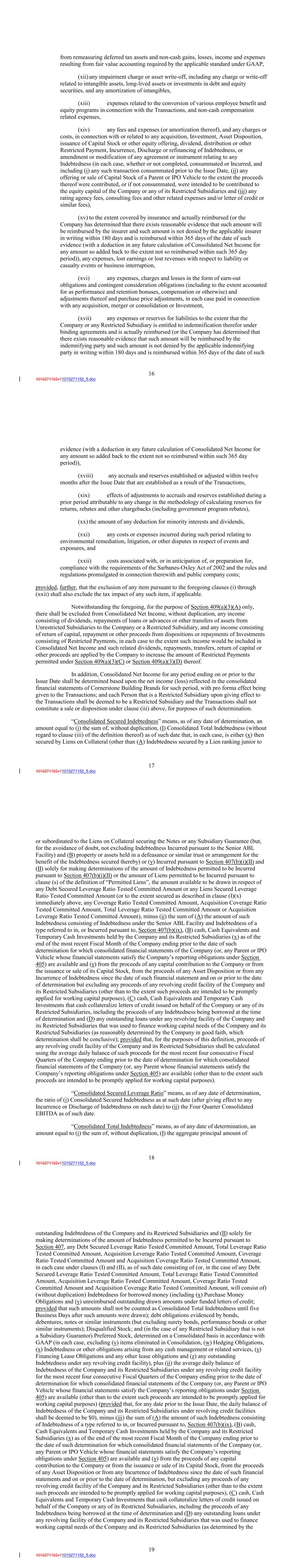 Company in good faith, which determination shall be conclusive); provided that, for the purposes of this definition, proceeds of any revolving credit facility of the Company and its Restricted Subsidiaries shall be calculated using the average daily balance of such proceeds for the most recent four consecutive Fiscal Quarters of the Company ending prior to the date of determination for which consolidated financial statements of the Company (or, any Parent or IPO Vehicle whose financial statements satisfy the Company’s reporting obligations under Section 405) are available (other than to the extent such proceeds are intended to be promptly applied for working capital purposes). For purposes hereof, any earn-out or similar obligations shall not constitute Consolidated Total Indebtedness until such obligation becomes a liability on the consolidated balance sheet of the Company in accordance with GAAP and is not paid within 60 days after becoming due and payable. “Consolidated Total Leverage Ratio” means, as of any date of determination, the ratio of (i) Consolidated Total Indebtedness as at such date (after giving effect to any Incurrence or Discharge of Indebtedness on such date) to (ii) the Four Quarter Consolidated EBITDA as of such date. “Consolidation” means the consolidation of the accounts of each of the Restricted Subsidiaries with those of the Company in accordance with GAAP; provided that “Consolidation” will not include consolidation of the accounts of any Unrestricted Subsidiary, but the interest of the Company or any Restricted Subsidiary in any Unrestricted Subsidiary will be accounted for as an investment. The term “Consolidated” has a correlative meaning. For purposes of this Indenture for periods ending on or prior to the Issue Date, references to the consolidated financial statements of the Company (or, any Parent or IPO Vehicle whose financial statements satisfy the Company’s reporting obligations under Section 405) shall be to the consolidated financial statements of Cornerstone Building Brands for such period, with pro forma effect being given to the Transactions (with Subsidiaries that comprise the Cornerstone Business that are Subsidiaries of the Company after giving effect to the Transactions being deemed Subsidiaries of the Company), as the context may require. “Contingent Obligation” means, with respect to any Person, any obligation of such Person guaranteeing any obligation that does not constitute Indebtedness (a “primary obligation”) of any other Person (the “primary obligor”) in any manner, whether directly or indirectly, including any obligation of such Person, whether or not contingent, (1) to purchase any such primary obligation or any property constituting direct or indirect security therefor, (2) to advance or supply funds (a) for the purchase or payment of any such primary obligation or (b) to maintain working capital or equity capital of the primary obligor or otherwise to maintain the net worth or solvency of the primary obligor or (3) to purchase property, securities or services primarily for the purpose of assuring the owner of any such primary obligation of the ability of the primary obligor to make payment of such primary obligation against loss in respect thereof. “Contribution Amounts” means the aggregate amount of capital contributions applied by the Company to permit the Incurrence of Contribution Indebtedness pursuant to Section 407(b)(x). 20 1010271152v11010271152_5.doc “Contribution Indebtedness” means Indebtedness of the Company or any Restricted Subsidiary in an aggregate principal amount not greater than twice the aggregate amount of cash contributions (other than Excluded Contributions, the proceeds from the issuance of Disqualified Stock or contributions by the Company or any Restricted Subsidiary) made to the capital of the Company or such Restricted Subsidiary after the Issue Date (whether through the issuance or sale of Capital Stock or otherwise); provided that such Contribution Indebtedness (a) is Incurred within 180 days after the receipt of the related cash contribution and (b) is so designated as Contribution Indebtedness pursuant to an Officer’s Certificate promptly following the date of Incurrence thereof. “Cornerstone Building Brands” means Cornerstone Building Brands, Inc., a Delaware corporation, and any successor in interest thereto. “Cornerstone Business” means Cornerstone Building Brands and each of its Subsidiaries. “Corporate Trust Office” means the office of the Trustee at which at any particular time its corporate trust business related to this Indenture shall be administered, which office on the Issue Date is located at 50 South Sixth Street, Suite 1290, Minneapolis, MN 55402, Attn: Camelot Return Merger Sub, Inc. Notes Administrator. “Covered Indebtedness” is as defined in clause (2) of the first sentence of the definition of “Net Short Holder.” “Credit Facilities” means one or more of (i) the Senior Cash Flow Facility, (ii) the Senior ABL Facility, (iii) the Senior Term Loan Facility and (iv) any other facilities or arrangements designated by the Company, in each case with one or more banks or other lenders or institutions providing for revolving credit loans, term loans, receivables, inventory or real estate financings (including, without limitation, through the sale of receivables, inventory, real estate and/or other assets to such institutions or to special purpose entities formed to borrow from such institutions against such receivables, inventory, real estate and/or other assets or the creation of any Liens in respect of such receivables, inventory, real estate and/or other assets in favor of such institutions), letters of credit or other Indebtedness, in each case, including all agreements, instruments and documents executed and delivered pursuant to or in connection with any of the foregoing, including but not limited to any notes and letters 