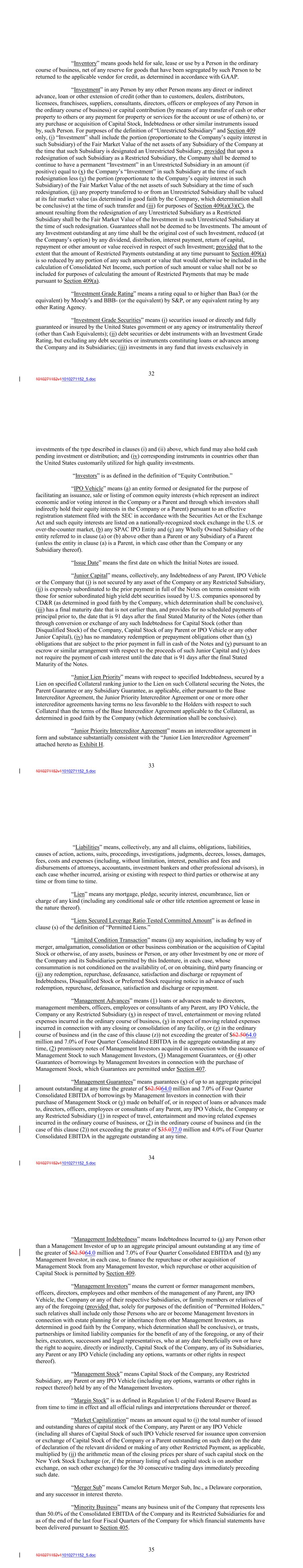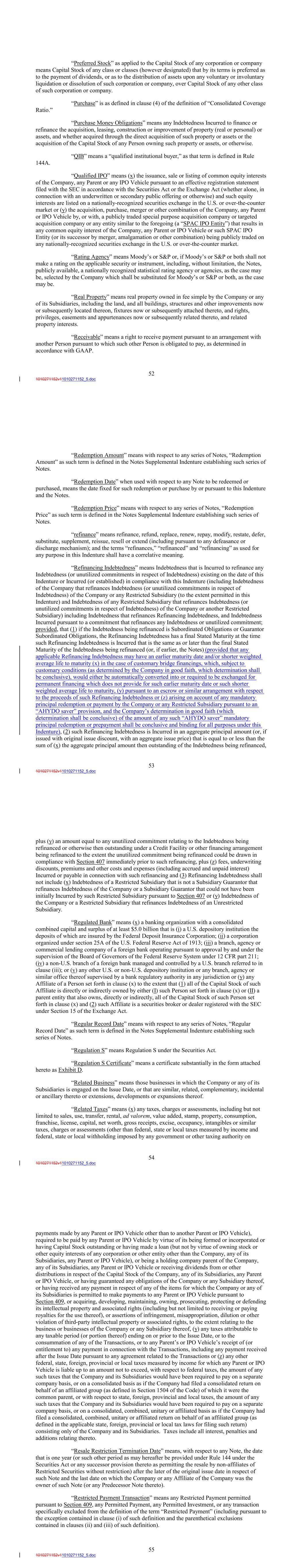 “Preferred Stock” as applied to the Capital Stock of any corporation or company means Capital Stock of any class or classes (however designated) that by its terms is preferred as to the payment of dividends, or as to the distribution of assets upon any voluntary or involuntary liquidation or dissolution of such corporation or company, over Capital Stock of any other class of such corporation or company. “Purchase” is as defined in clause (4) of the definition of “Consolidated Coverage Ratio.” “Purchase Money Obligations” means any Indebtedness Incurred to finance or refinance the acquisition, leasing, construction or improvement of property (real or personal) or assets, and whether acquired through the direct acquisition of such property or assets or the acquisition of the Capital Stock of any Person owning such property or assets, or otherwise. “QIB” means a “qualified institutional buyer,” as that term is defined in Rule 144A. “Qualified IPO” means (x) the issuance, sale or listing of common equity interests of the Company, any Parent or any IPO Vehicle pursuant to an effective registration statement filed with the SEC in accordance with the Securities Act or the Exchange Act (whether alone, in connection with an underwritten or secondary public offering or otherwise) and such equity interests are listed on a nationally-recognized securities exchange in the U.S. or over-the-counter market or (y) the acquisition, purchase, merger or other combination of the Company, any Parent or IPO Vehicle by, or with, a publicly traded special purpose acquisition company or targeted acquisition company or any entity similar to the foregoing (a “SPAC IPO Entity”) that results in any common equity interest of the Company, any Parent or IPO Vehicle or such SPAC IPO Entity (or its successor by merger, amalgamation or other combination) being publicly traded on any nationally-recognized securities exchange in the U.S. or over-the-counter market. “Rating Agency” means Moody’s or S&P or, if Moody’s or S&P or both shall not make a rating on the applicable security or instrument, including, without limitation, the Notes, publicly available, a nationally recognized statistical rating agency or agencies, as the case may be, selected by the Company which shall be substituted for Moody’s or S&P or both, as the case may be. “Real Property” means real property owned in fee simple by the Company or any of its Subsidiaries, including the land, and all buildings, structures and other improvements now or subsequently located thereon, fixtures now or subsequently attached thereto, and rights, privileges, easements and appurtenances now or subsequently related thereto, and related property interests. “Receivable” means a right to receive payment pursuant to an arrangement with another Person pursuant to which such other Person is obligated to pay, as determined in accordance with GAAP. 52 1010271152v11010271152_5.doc “Redemption Amount” means with respect to any series of Notes, “Redemption Amount” as such term is defined in the Notes Supplemental Indenture establishing such series of Notes. “Redemption Date” when used with respect to any Note to be redeemed or purchased, means the date fixed for such redemption or purchase by or pursuant to this Indenture and the Notes. “Redemption Price” means with respect to any series of Notes, “Redemption Price” as such term is defined in the Notes Supplemental Indenture establishing such series of Notes. “refinance” means refinance, refund, replace, renew, repay, modify, restate, defer, substitute, supplement, reissue, resell or extend (including pursuant to any defeasance or discharge mechanism); and the terms “refinances,” “refinanced” and “refinancing” as used for any purpose in this Indenture shall have a correlative meaning. “Refinancing Indebtedness” means Indebtedness that is Incurred to refinance any Indebtedness (or unutilized commitments in respect of Indebtedness) existing on the date of this Indenture or Incurred (or established) in compliance with this Indenture (including Indebtedness of the Company that refinances Indebtedness (or unutilized commitments in respect of Indebtedness) of the Company or any Restricted Subsidiary (to the extent permitted in this Indenture) and Indebtedness of any Restricted Subsidiary that refinances Indebtedness (or unutilized commitments in respect of Indebtedness) of the Company or another Restricted Subsidiary) including Indebtedness that refinances Refinancing Indebtedness, and Indebtedness Incurred pursuant to a commitment that refinances any Indebtedness or unutilized commitment; provided, that (1) if the Indebtedness being refinanced is Subordinated Obligations or Guarantor Subordinated Obligations, the Refinancing Indebtedness has a final Stated Maturity at the time such Refinancing Indebtedness is Incurred that is the same as or later than the final Stated Maturity of the Indebtedness being refinanced (or, if earlier, the Notes) (provided that any applicable Refinancing Indebtedness may have an earlier maturity date and/or shorter weighted average life to maturity (x) in the case of customary bridge financings, which, subject to customary conditions (as determined by the Company in good faith, which determination shall be conclusive), would either be automatically converted into or required to be exchanged for permanent financing which does not provide for such earlier maturity date or such shorter weighted average life to maturity, (y) pursuant to an escrow or similar arrangement with respect to the proceeds of such Refinancing Indebtedness or (z) arising on account of any mandatory principal redemption or payment by the Company or any Restricted Subsidiary pursuant to an “AHYDO saver” provision, and the Company’s determination in good faith (which determination shall be conclusive) of the amount of any such “AHYDO saver” mandator