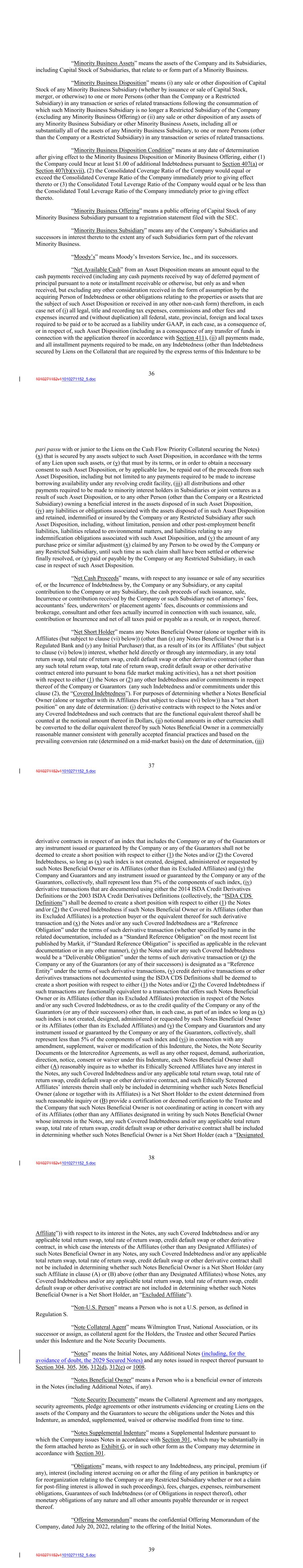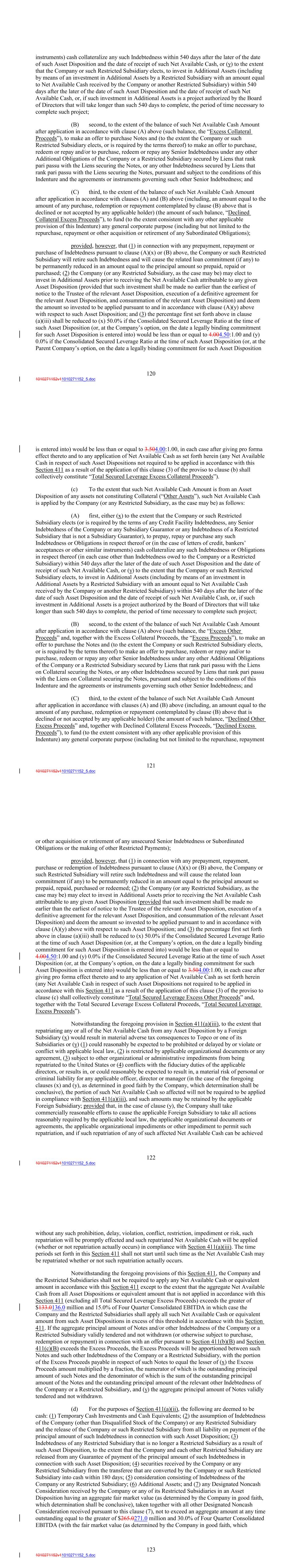 determination shall be conclusive) of each item of Designated Noncash Consideration being measured on the date a legally binding commitment for such Asset Disposition (or, if later, for the payment of such item) was entered into and without giving effect to subsequent changes in value). (e) In the event of an Asset Disposition that requires the purchase of Notes pursuant to Section 411(b)(B) and Section 411(c)(B), the Company will be required to purchase Notes tendered pursuant to an offer by the Company for the Notes (the “Offer”) at a purchase price of 100.0% of their principal amount plus accrued and unpaid interest to but not including the date of purchase in accordance with the procedures (including prorating in the event of oversubscription) set forth in Section 411(c). If the aggregate purchase price of the Notes tendered pursuant to the Offer is less than the Net Available Cash allotted to the purchase of Notes, the remaining Net Available Cash will be available to the Company and the Restricted Subsidiaries for use in accordance with Section 411(b)(B) and Section 411(c)(B) (to repay other Indebtedness of the Company or a Restricted Subsidiary) or Section 411(b)(C) and Section 411(c)(C). The Company shall not be required to make an Offer for Notes pursuant to this Section 411 if the Net Available Cash available therefor (after application of the proceeds as provided in Section 411(b)(A) and Section 411(c)(A), as applicable) is less than the greater of $133.0136.0 million and 15.0% of Four Quarter Consolidated EBITDA for any particular Asset Disposition (which lesser amounts shall be carried forward for purposes of determining whether an Offer is required with respect to the Net Available Cash from any subsequent Asset Disposition). No Note will be repurchased in part if less than the Minimum Denomination in original principal amount of such Note would be left outstanding. The provisions under this Indenture relating to the Company’s obligation to make an Offer for Notes pursuant to this Section 411 may be waived or modified with the written consent of the Holders of a majority in principal amount of the Notes. (f) For the purposes of Section 411(b) and Section 411(c), (i) in the event of any Asset Disposition of Capital Stock of a Person that has any right, title or interest to or in assets constituting both Collateral and Other Assets, such Asset Disposition shall instead be deemed to be an Asset Disposition of such assets, and the Company shall allocate the Net Available Cash from such Asset Disposition between the Collateral and the Other Assets in proportion to their respective fair market values as determined by the Company in good faith (which determination shall be conclusive), (ii) any Asset Disposition of Capital Stock of any Person that has any right, title or interest to or in assets constituting only Other Assets will be subject to Section 411(c) and not Section 411(b), and (iii) any Asset Disposition of Capital Stock of any Person that has any right, title or interest to or in assets constituting only Collateral will be subject to Section 411(b) and not Section 411(c). (g) The Company shall, not later than 45 days after the Company becomes obligated to make an Offer pursuant to this Section 411, send a notice to each Holder with a copy to the Trustee stating: (1) that an Asset Disposition that requires the purchase of a portion of the Notes has occurred and that such Holder has the right (subject to the prorating described below) to require the Company to purchase a portion of such Holder’s Notes at a purchase price in cash 124 1010271152v11010271152_5.doc equal to 100.0% of the principal amount thereof, plus accrued and unpaid interest, if any, to but not including the date of purchase (subject to the right of Holders of record on a record date to receive interest on the relevant Interest Payment Date falling prior to or on the purchase date); (2) the repurchase date (which shall be no earlier than 10 days nor later than 60 days from the date such notice is sent, except that such notice may be delivered more than 60 days prior to the purchase date if the purchase date is delayed as provided in clause (5) of this Section 411(c)); (3) the instructions determined by the Company, consistent with this Section 411, that a Holder must follow in order to have its Notes purchased; (4) the amount of the Offer, which amount may be contingent upon the Net Available Cash remaining following the application of Net Available Cash pursuant to Section 411(b)(A) and Section 411(c)(A); and (5) if such notice is sent prior to the date the Net Available Cash attributable to such Asset Disposition is received, that such offer is conditioned upon receipt of such Net Available Cash and that the purchase date may, in the Company’s discretion, be delayed until such time as the Net Available Cash is received. If, upon the expiration of the period for which the Offer remains open, the aggregate principal amount of Notes surrendered by Holders exceeds the amount of the Offer, the Company shall select the Notes to be purchased on a pro rata basis (with such adjustments as may be deemed appropriate by the Company so that only Notes in the Minimum Denomination or integral multiples of $1,000 in excess thereof shall be purchased). (h) If Holders of not less than 90.0% in aggregate principal amount of the outstanding Notes of any series validly tender and do not withdraw such Notes in an Offer and the Company purchases all of the Notes of such series validly tendered and not withdrawn by such Holders, the Company will have the right, upon not less than 10 nor more than 60 days’ prior notice, given not more than 30 days following such purchase pursuant to such Offer, to redeem all Notes of such series that remain outstanding following such purchase at a price in cash equal to 100.0% of the principal amount thereof plus accrued and unpaid interest to but excluding the date of such redempti