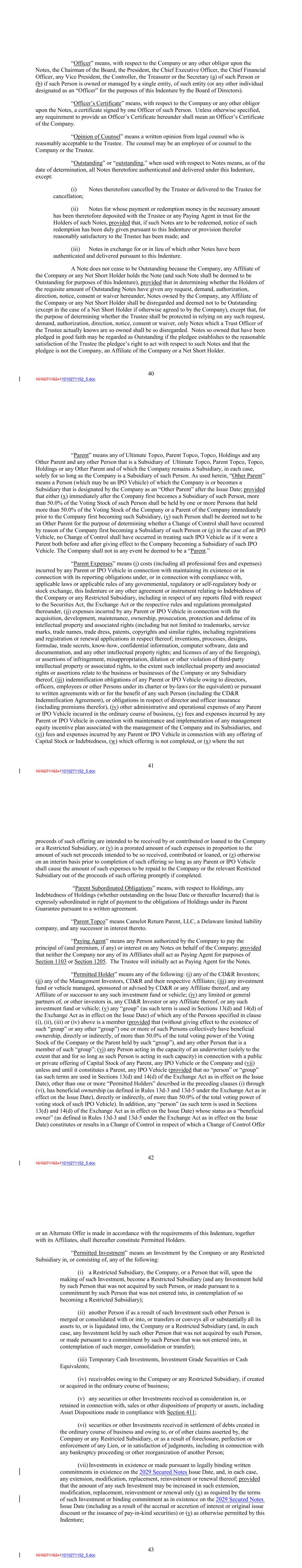 ARTICLE XV COLLATERAL AND SECURITY Section 1501. Collateral and Security Documents 177 Section 1502. Release of Collateral 179 Section 1503. After-Acquired Property 181 Section 1504. Suits to Protect the Collateral 181 Section 1505. Authorization of Receipt of Funds by the Trustee Under the Note Security Documents 182 Section 1506. Purchaser Protected 182 Section 1507. Powers Exercisable by Receiver or Trustee 182 Section 1508. Reports and Certificates Relating to Collateral 183 Section 1509. Note Collateral Agent 183 Section 1510. Compensation and Indemnification 188 Section 1511. The Intercreditor Agreements and the Note Security Documents 188 Section 1512. [Reserved] 188 Section 1513. Confidentiality 188 Exhibit A Form of Initial Note Exhibit B [Reserved] Exhibit C Form of Certificate of Beneficial Ownership Exhibit D Form of Regulation S Certificate Exhibit E Form of Supplemental Indenture in Respect of Guarantees Exhibit F Form of Certificate from Acquiring Institutional Accredited Investors Exhibit G Form of Supplemental Indenture Establishing a Series of Notes Exhibit H Form of Junior Priority Intercreditor Agreement Exhibit I Form of Joinder and Release vi 1010271152v11010271152_5.doc INDENTURE, dated as of July 25, 2022 (as amended, supplemented or otherwise modified from time to time, this “Indenture”), among Camelot Return Merger Sub, Inc., a Delaware corporation, as issuer, the Guarantors from time to time party hereto and Wilmington Trust, National Association, a national banking association, as Trustee, and Wilmington Trust, National Association, a national banking association, as Note Collateral Agent. RECITALS OF THE COMPANY The Company has duly authorized the execution and delivery of this Indenture to provide for the issuance of the Notes. All things necessary to make this Indenture a valid agreement of the Company in accordance with the terms of the Initial Notes and this Indenture have been done. NOW, THEREFORE, THIS INDENTURE WITNESSETH: For and in consideration of the premises and the purchase of the Notes by the Holders thereof, it is mutually agreed, for the benefit of all Holders of the Notes, as follows: ARTICLE I DEFINITIONS AND OTHER PROVISIONS OF GENERAL APPLICATION Section 101. Definitions. “2029 Secured Notes” means the 9.500% Senior Secured Notes due 2029 of the Company issued on the 2029 Secured Notes Issue Date pursuant to the Fifth Notes Supplemental Indenture, dated as of August 7, 2024 (and any Notes issued in respect thereof pursuant to Section 304, 305, 306, 312(d), 312(e) or 1008). “2029 Secured Notes Issue Date” means the first date on which the 2029 Secured Notes are issued. “2029 Secured Notes Offering Memorandum” means the confidential Offering Memorandum of the Company, dated July 31, 2024, relating to the offering of the 2029 Secured Notes. “ABL Collateral Obligations” has the meaning assigned to such term in the Base Intercreditor Agreement. “ABL Obligations” has the meaning assigned to such term in the Base Intercreditor Agreement. 1 1010271152v11010271152_5.doc “ABL Priority Collateral” has the meaning assigned to such term in the Base Intercreditor Agreement. “Acquired Indebtedness” means Indebtedness of a Person (i) existing at the time such Person becomes a Subsidiary or (ii) assumed in connection with the acquisition of assets from such Person, in each case other than Indebtedness Incurred in connection with, or in contemplation of, such Person becoming a Subsidiary or such acquisition of assets. Acquired Indebtedness shall be deemed to be Incurred on the date of the related acquisition of assets from any Person or the date the acquired Person becomes a Subsidiary. “Acquisition Indebtedness” means Indebtedness of (i) the Company or any Restricted Subsidiary Incurred to finance or refinance, or otherwise Incurred in connection with any acquisition of assets (including Capital Stock), business or Person, or any merger or consolidation of any Person with or into the Company or any Restricted Subsidiary, or (ii) any Person that is acquired by or merged or consolidated with or into the Company or any Restricted Subsidiary (including Indebtedness thereof Incurred in connection with any such acquisition, merger or consolidation). “Additional Assets” means (i) any property or assets that replace the property or assets that are the subject of an Asset Disposition; (ii) any property or assets (other than Indebtedness and Capital Stock) used or to be used by the Company or a Restricted Subsidiary or otherwise useful in a Related Business, and any capital expenditures in respect of any property or assets already so used; (iii) the Capital Stock of a Person that is engaged in a Related Business and becomes a Restricted Subsidiary as a result of the acquisition of such Capital Stock by the Company or another Restricted Subsidiary; or (iv) Capital Stock of any Person that at such time is a Restricted Subsidiary acquired from a third party. “Additional Notes” means any notes issued under this Indenture in addition to the Initial Notes (other than any Notes issued pursuant to Section 304, 305, 306, 312(d), 312(e) or 1008). “Additional Obligations” has the meaning assigned to such term in the Base Intercreditor Agreement and the Junior Priority Intercreditor Agreement, as applicable. “Affiliate” of any specified Person means any other Person, directly or indirectly, controlling or controlled by or under direct or indirect common control with such specified Person. For the purposes of this definition, “control” when used with respect to any Person means the power to direct the management and policies of such Person, directly or indirectly, whether through the ownership of voting securities, by contract or otherwise; and the terms “controlling” and “controlled” have meanings correlative to the foregoing. “After Acquired Property” means any and all assets or property (other than Excluded A