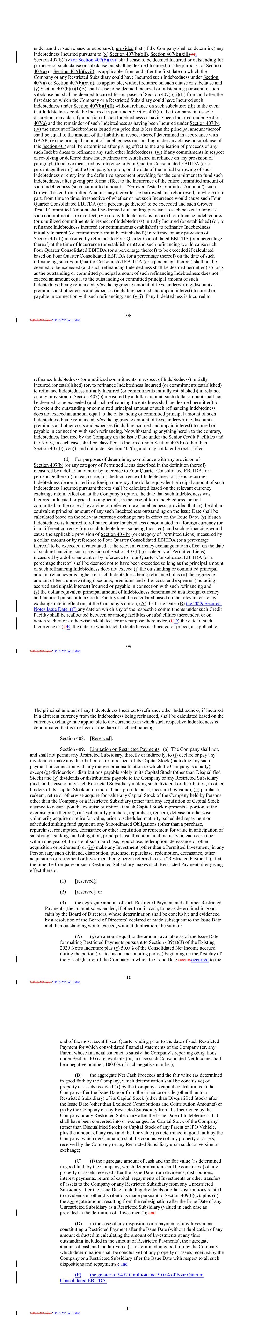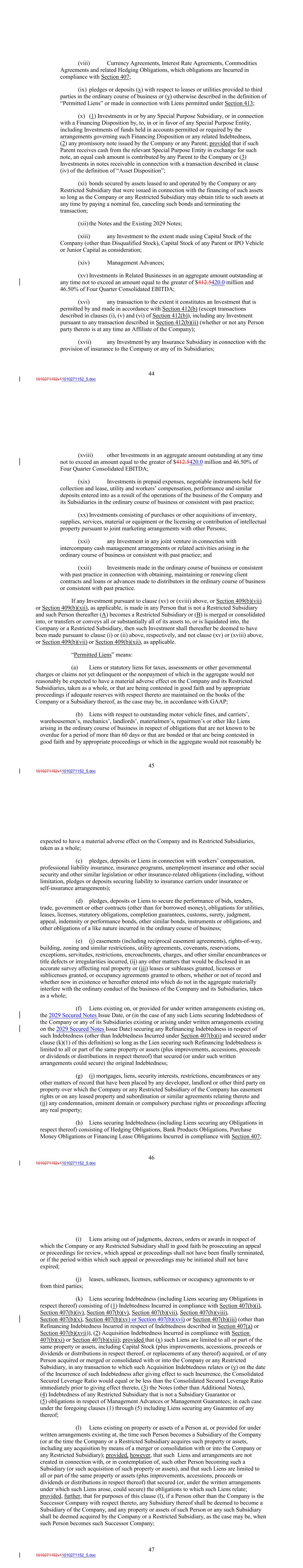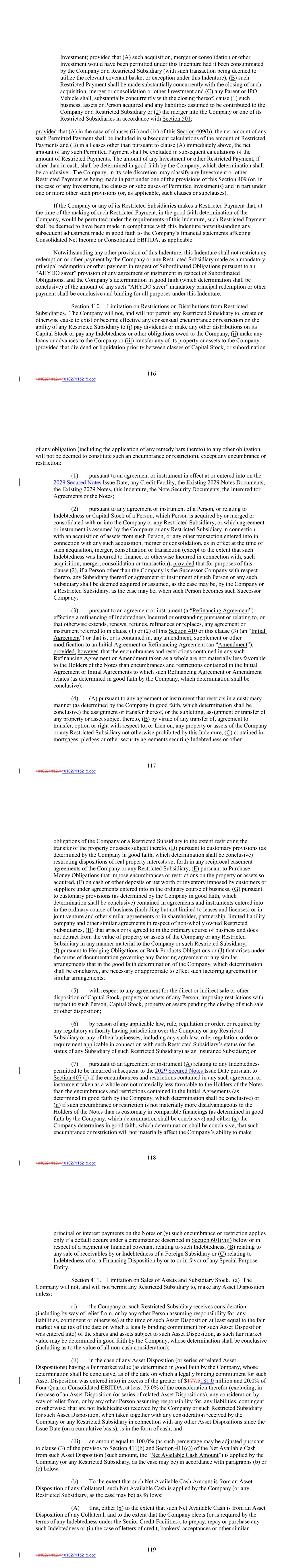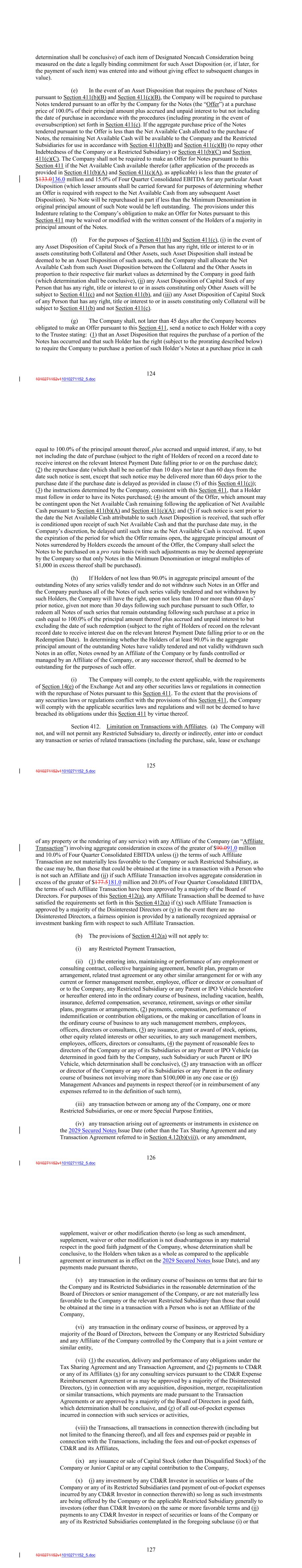 Investment; provided that (A) such acquisition, merger or consolidation or other Investment would have been permitted under this Indenture had it been consummated by the Company or a Restricted Subsidiary (with such transaction being deemed to utilize the relevant covenant basket or exception under this Indenture), (B) such Restricted Payment shall be made substantially concurrently with the closing of such acquisition, merger or consolidation or other Investment and (C) any Parent or IPO Vehicle shall, substantially concurrently with the closing thereof, cause (1) such business, assets or Person acquired and any liabilities assumed to be contributed to the Company or a Restricted Subsidiary or (2) the merger into the Company or one of its Restricted Subsidiaries in accordance with Section 501; provided that (A) in the case of clauses (iii) and (ix) of this Section 409(b), the net amount of any such Permitted Payment shall be included in subsequent calculations of the amount of Restricted Payments and (B) in all cases other than pursuant to clause (A) immediately above, the net amount of any such Permitted Payment shall be excluded in subsequent calculations of the amount of Restricted Payments. The amount of any Investment or other Restricted Payment, if other than in cash, shall be determined in good faith by the Company, which determination shall be conclusive. The Company, in its sole discretion, may classify any Investment or other Restricted Payment as being made in part under one of the provisions of this Section 409 (or, in the case of any Investment, the clauses or subclauses of Permitted Investments) and in part under one or more other such provisions (or, as applicable, such clauses or subclauses). If the Company or any of its Restricted Subsidiaries makes a Restricted Payment that, at the time of the making of such Restricted Payment, in the good faith determination of the Company, would be permitted under the requirements of this Indenture, such Restricted Payment shall be deemed to have been made in compliance with this Indenture notwithstanding any subsequent adjustment made in good faith to the Company’s financial statements affecting Consolidated Net Income or Consolidated EBITDA, as applicable. Notwithstanding any other provision of this Indenture, this Indenture shall not restrict any redemption or other payment by the Company or any Restricted Subsidiary made as a mandatory principal redemption or other payment in respect of Subordinated Obligations pursuant to an “AHYDO saver” provision of any agreement or instrument in respect of Subordinated Obligations, and the Company’s determination in good faith (which determination shall be conclusive) of the amount of any such “AHYDO saver” mandatory principal redemption or other payment shall be conclusive and binding for all purposes under this Indenture. Section 410. Limitation on Restrictions on Distributions from Restricted Subsidiaries. The Company will not, and will not permit any Restricted Subsidiary to, create or otherwise cause to exist or become effective any consensual encumbrance or restriction on the ability of any Restricted Subsidiary to (i) pay dividends or make any other distributions on its Capital Stock or pay any Indebtedness or other obligations owed to the Company, (ii) make any loans or advances to the Company or (iii) transfer any of its property or assets to the Company (provided that dividend or liquidation priority between classes of Capital Stock, or subordination 116 1010271152v11010271152_5.doc of any obligation (including the application of any remedy bars thereto) to any other obligation, will not be deemed to constitute such an encumbrance or restriction), except any encumbrance or restriction: (1) pursuant to an agreement or instrument in effect at or entered into on the 2029 Secured Notes Issue Date, any Credit Facility, the Existing 2029 Notes Documents, the Existing 2029 Notes, this Indenture, the Note Security Documents, the Intercreditor Agreements or the Notes; (2) pursuant to any agreement or instrument of a Person, or relating to Indebtedness or Capital Stock of a Person, which Person is acquired by or merged or consolidated with or into the Company or any Restricted Subsidiary, or which agreement or instrument is assumed by the Company or any Restricted Subsidiary in connection with an acquisition of assets from such Person, or any other transaction entered into in connection with any such acquisition, merger or consolidation, as in effect at the time of such acquisition, merger, consolidation or transaction (except to the extent that such Indebtedness was Incurred to finance, or otherwise Incurred in connection with, such acquisition, merger, consolidation or transaction); provided that for purposes of this clause (2), if a Person other than the Company is the Successor Company with respect thereto, any Subsidiary thereof or agreement or instrument of such Person or any such Subsidiary shall be deemed acquired or assumed, as the case may be, by the Company or a Restricted Subsidiary, as the case may be, when such Person becomes such Successor Company; (3) pursuant to an agreement or instrument (a “Refinancing Agreement”) effecting a refinancing of Indebtedness Incurred or outstanding pursuant or relating to, or that otherwise extends, renews, refunds, refinances or replaces, any agreement or instrument referred to in clause (1) or (2) of this Section 410 or this clause (3) (an “Initial Agreement”) or that is, or is contained in, any amendment, supplement or other modification to an Initial Agreement or Refinancing Agreement (an “Amendment”); provided, however, that the encumbrances and restrictions contained in any such Refinancing Agreement or Amendment taken as a whole are not materially less favorable to the Holders of the Notes than encumbrances and restrictions contained in the Initial Agreement or Initial Agreements to which such Refinancing Agreement