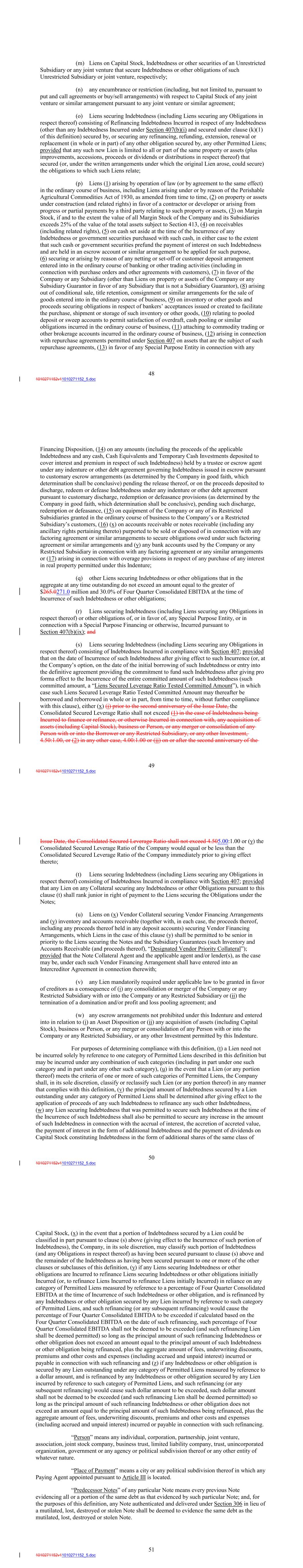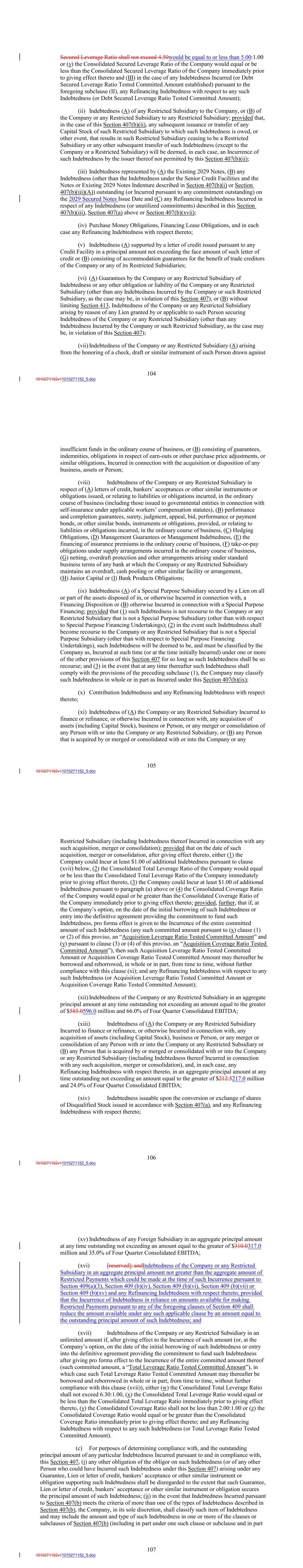 Secured Leverage Ratio shall not exceed 4.50would be equal to or less than 5.00:1.00 or (y) the Consolidated Secured Leverage Ratio of the Company would equal or be less than the Consolidated Secured Leverage Ratio of the Company immediately prior to giving effect thereto and (III) in the case of any Indebtedness Incurred (or Debt Secured Leverage Ratio Tested Committed Amount established) pursuant to the foregoing subclause (II), any Refinancing Indebtedness with respect to any such Indebtedness (or Debt Secured Leverage Ratio Tested Committed Amount); (ii) Indebtedness (A) of any Restricted Subsidiary to the Company, or (B) of the Company or any Restricted Subsidiary to any Restricted Subsidiary; provided that, in the case of this Section 407(b)(ii), any subsequent issuance or transfer of any Capital Stock of such Restricted Subsidiary to which such Indebtedness is owed, or other event, that results in such Restricted Subsidiary ceasing to be a Restricted Subsidiary or any other subsequent transfer of such Indebtedness (except to the Company or a Restricted Subsidiary) will be deemed, in each case, an Incurrence of such Indebtedness by the issuer thereof not permitted by this Section 407(b)(ii); (iii) Indebtedness represented by (A) the Existing 2029 Notes, (B) any Indebtedness (other than the Indebtedness under the Senior Credit Facilities and the Notes or Existing 2029 Notes Indenture described in Section 407(b)(i) or Section 407(b)(iii)(A)) outstanding (or Incurred pursuant to any commitment outstanding) on the 2029 Secured Notes Issue Date and (C) any Refinancing Indebtedness Incurred in respect of any Indebtedness (or unutilized commitments) described in this Section 407(b)(iii), Section 407(a) above or Section 407(b)(xvii); (iv) Purchase Money Obligations, Financing Lease Obligations, and in each case any Refinancing Indebtedness with respect thereto; (v) Indebtedness (A) supported by a letter of credit issued pursuant to any Credit Facility in a principal amount not exceeding the face amount of such letter of credit or (B) consisting of accommodation guarantees for the benefit of trade creditors of the Company or any of its Restricted Subsidiaries; (vi) (A) Guarantees by the Company or any Restricted Subsidiary of Indebtedness or any other obligation or liability of the Company or any Restricted Subsidiary (other than any Indebtedness Incurred by the Company or such Restricted Subsidiary, as the case may be, in violation of this Section 407), or (B) without limiting Section 413, Indebtedness of the Company or any Restricted Subsidiary arising by reason of any Lien granted by or applicable to such Person securing Indebtedness of the Company or any Restricted Subsidiary (other than any Indebtedness Incurred by the Company or such Restricted Subsidiary, as the case may be, in violation of this Section 407); (vii) Indebtedness of the Company or any Restricted Subsidiary (A) arising from the honoring of a check, draft or similar instrument of such Person drawn against 104 1010271152v11010271152_5.doc insufficient funds in the ordinary course of business, or (B) consisting of guarantees, indemnities, obligations in respect of earn-outs or other purchase price adjustments, or similar obligations, Incurred in connection with the acquisition or disposition of any business, assets or Person; (viii) Indebtedness of the Company or any Restricted Subsidiary in respect of (A) letters of credit, bankers’ acceptances or other similar instruments or obligations issued, or relating to liabilities or obligations incurred, in the ordinary course of business (including those issued to governmental entities in connection with self-insurance under applicable workers’ compensation statutes), (B) performance and completion guarantees, surety, judgment, appeal, bid, performance or payment bonds, or other similar bonds, instruments or obligations, provided, or relating to liabilities or obligations incurred, in the ordinary course of business, (C) Hedging Obligations, (D) Management Guarantees or Management Indebtedness, (E) the financing of insurance premiums in the ordinary course of business, (F) take-or-pay obligations under supply arrangements incurred in the ordinary course of business, (G) netting, overdraft protection and other arrangements arising under standard business terms of any bank at which the Company or any Restricted Subsidiary maintains an overdraft, cash pooling or other similar facility or arrangement, (H) Junior Capital or (I) Bank Products Obligations; (ix) Indebtedness (A) of a Special Purpose Subsidiary secured by a Lien on all or part of the assets disposed of in, or otherwise Incurred in connection with, a Financing Disposition or (B) otherwise Incurred in connection with a Special Purpose Financing; provided that (1) such Indebtedness is not recourse to the Company or any Restricted Subsidiary that is not a Special Purpose Subsidiary (other than with respect to Special Purpose Financing Undertakings); (2) in the event such Indebtedness shall become recourse to the Company or any Restricted Subsidiary that is not a Special Purpose Subsidiary (other than with respect to Special Purpose Financing Undertakings), such Indebtedness will be deemed to be, and must be classified by the Company as, Incurred at such time (or at the time initially Incurred) under one or more of the other provisions of this Section 407 for so long as such Indebtedness shall be so recourse; and (3) in the event that at any time thereafter such Indebtedness shall comply with the provisions of the preceding subclause (1), the Company may classify such Indebtedness in whole or in part as Incurred under this Section 407(b)(ix); (x) Contribution Indebtedness and any Refinancing Indebtedness with respect thereto; (xi) Indebtedness of (A) the Company or any Restricted Subsidiary Incurred to finance or refinance, or otherwise Incurred in connection with, any acquisition of assets (including Capital Stock), busi