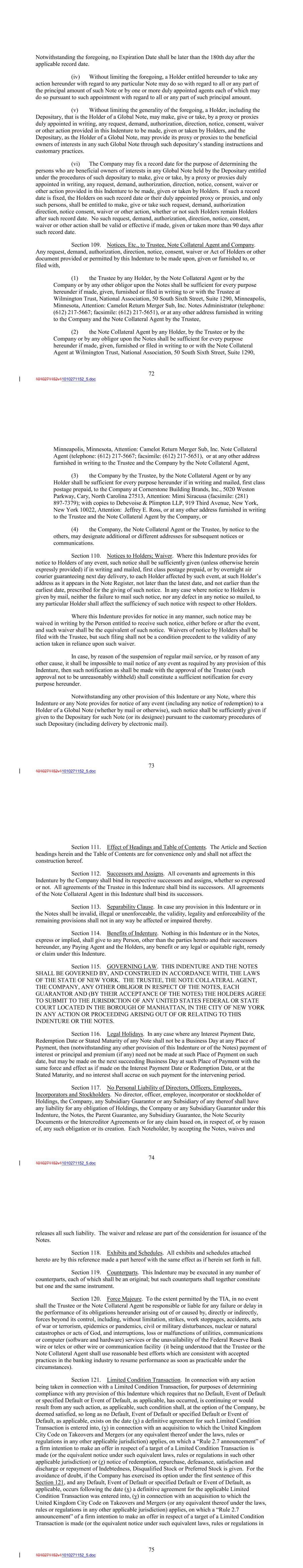 Notwithstanding the foregoing, no Expiration Date shall be later than the 180th day after the applicable record date. (iv) Without limiting the foregoing, a Holder entitled hereunder to take any action hereunder with regard to any particular Note may do so with regard to all or any part of the principal amount of such Note or by one or more duly appointed agents each of which may do so pursuant to such appointment with regard to all or any part of such principal amount. (v) Without limiting the generality of the foregoing, a Holder, including the Depositary, that is the Holder of a Global Note, may make, give or take, by a proxy or proxies duly appointed in writing, any request, demand, authorization, direction, notice, consent, waiver or other action provided in this Indenture to be made, given or taken by Holders, and the Depositary, as the Holder of a Global Note, may provide its proxy or proxies to the beneficial owners of interests in any such Global Note through such depositary’s standing instructions and customary practices. (vi) The Company may fix a record date for the purpose of determining the persons who are beneficial owners of interests in any Global Note held by the Depositary entitled under the procedures of such depositary to make, give or take, by a proxy or proxies duly appointed in writing, any request, demand, authorization, direction, notice, consent, waiver or other action provided in this Indenture to be made, given or taken by Holders. If such a record date is fixed, the Holders on such record date or their duly appointed proxy or proxies, and only such persons, shall be entitled to make, give or take such request, demand, authorization direction, notice consent, waiver or other action, whether or not such Holders remain Holders after such record date. No such request, demand, authorization, direction, notice, consent, waiver or other action shall be valid or effective if made, given or taken more than 90 days after such record date. Section 109. Notices, Etc., to Trustee, Note Collateral Agent and Company. Any request, demand, authorization, direction, notice, consent, waiver or Act of Holders or other document provided or permitted by this Indenture to be made upon, given or furnished to, or filed with, (1) the Trustee by any Holder, by the Note Collateral Agent or by the Company or by any other obligor upon the Notes shall be sufficient for every purpose hereunder if made, given, furnished or filed in writing to or with the Trustee at Wilmington Trust, National Association, 50 South Sixth Street, Suite 1290, Minneapolis, Minnesota, Attention: Camelot Return Merger Sub, Inc. Notes Administrator (telephone: (612) 217-5667; facsimile: (612) 217-5651), or at any other address furnished in writing to the Company and the Note Collateral Agent by the Trustee, (2) the Note Collateral Agent by any Holder, by the Trustee or by the Company or by any obligor upon the Notes shall be sufficient for every purpose hereunder if made, given, furnished or filed in writing to or with the Note Collateral Agent at Wilmington Trust, National Association, 50 South Sixth Street, Suite 1290, 72 1010271152v11010271152_5.doc Minneapolis, Minnesota, Attention: Camelot Return Merger Sub, Inc. Note Collateral Agent (telephone: (612) 217-5667; facsimile: (612) 217-5651), or at any other address furnished in writing to the Trustee and the Company by the Note Collateral Agent, (3) the Company by the Trustee, by the Note Collateral Agent or by any Holder shall be sufficient for every purpose hereunder if in writing and mailed, first class postage prepaid, to the Company at Cornerstone Building Brands, Inc., 5020 Weston Parkway, Cary, North Carolina 27513, Attention: Mimi Siracusa (facsimile: (281) 897-7379); with copies to Debevoise & Plimpton LLP, 919 Third Avenue, New York, New York 10022, Attention: Jeffrey E. Ross, or at any other address furnished in writing to the Trustee and the Note Collateral Agent by the Company, or (4) the Company, the Note Collateral Agent or the Trustee, by notice to the others, may designate additional or different addresses for subsequent notices or communications. Section 110. Notices to Holders; Waiver. Where this Indenture provides for notice to Holders of any event, such notice shall be sufficiently given (unless otherwise herein expressly provided) if in writing and mailed, first class postage prepaid, or by overnight air courier guaranteeing next day delivery, to each Holder affected by such event, at such Holder’s address as it appears in the Note Register, not later than the latest date, and not earlier than the earliest date, prescribed for the giving of such notice. In any case where notice to Holders is given by mail, neither the failure to mail such notice, nor any defect in any notice so mailed, to any particular Holder shall affect the sufficiency of such notice with respect to other Holders. Where this Indenture provides for notice in any manner, such notice may be waived in writing by the Person entitled to receive such notice, either before or after the event, and such waiver shall be the equivalent of such notice. Waivers of notice by Holders shall be filed with the Trustee, but such filing shall not be a condition precedent to the validity of any action taken in reliance upon such waiver. In case, by reason of the suspension of regular mail service, or by reason of any other cause, it shall be impossible to mail notice of any event as required by any provision of this Indenture, then such notification as shall be made with the approval of the Trustee (such approval not to be unreasonably withheld) shall constitute a sufficient notification for every purpose hereunder. Notwithstanding any other provision of this Indenture or any Note, where this Indenture or any Note provides for notice of any event (including any notice of redemption) to a Holder of a Global Note (whether by mail or otherwise), such notice shall be sufficiently given if giv